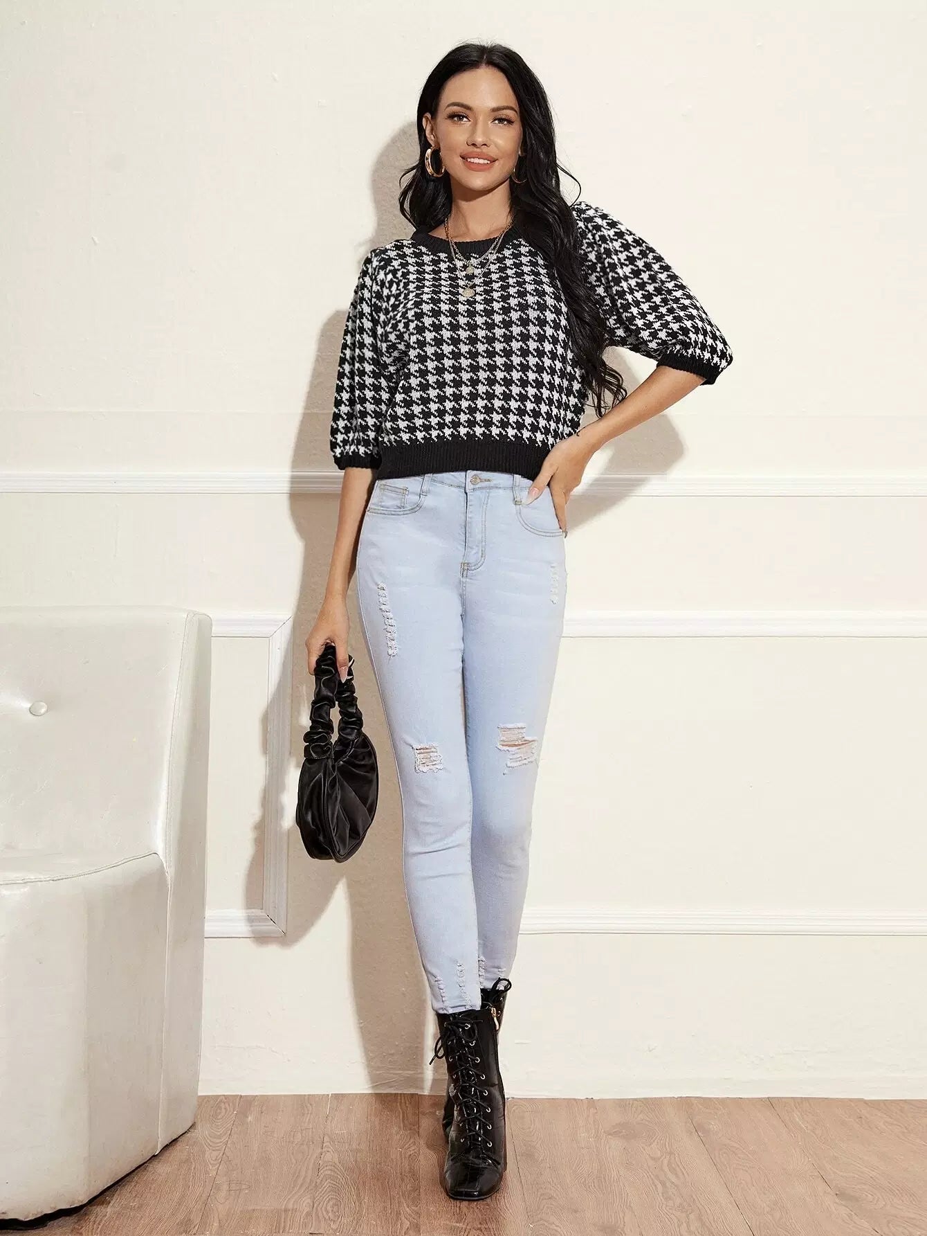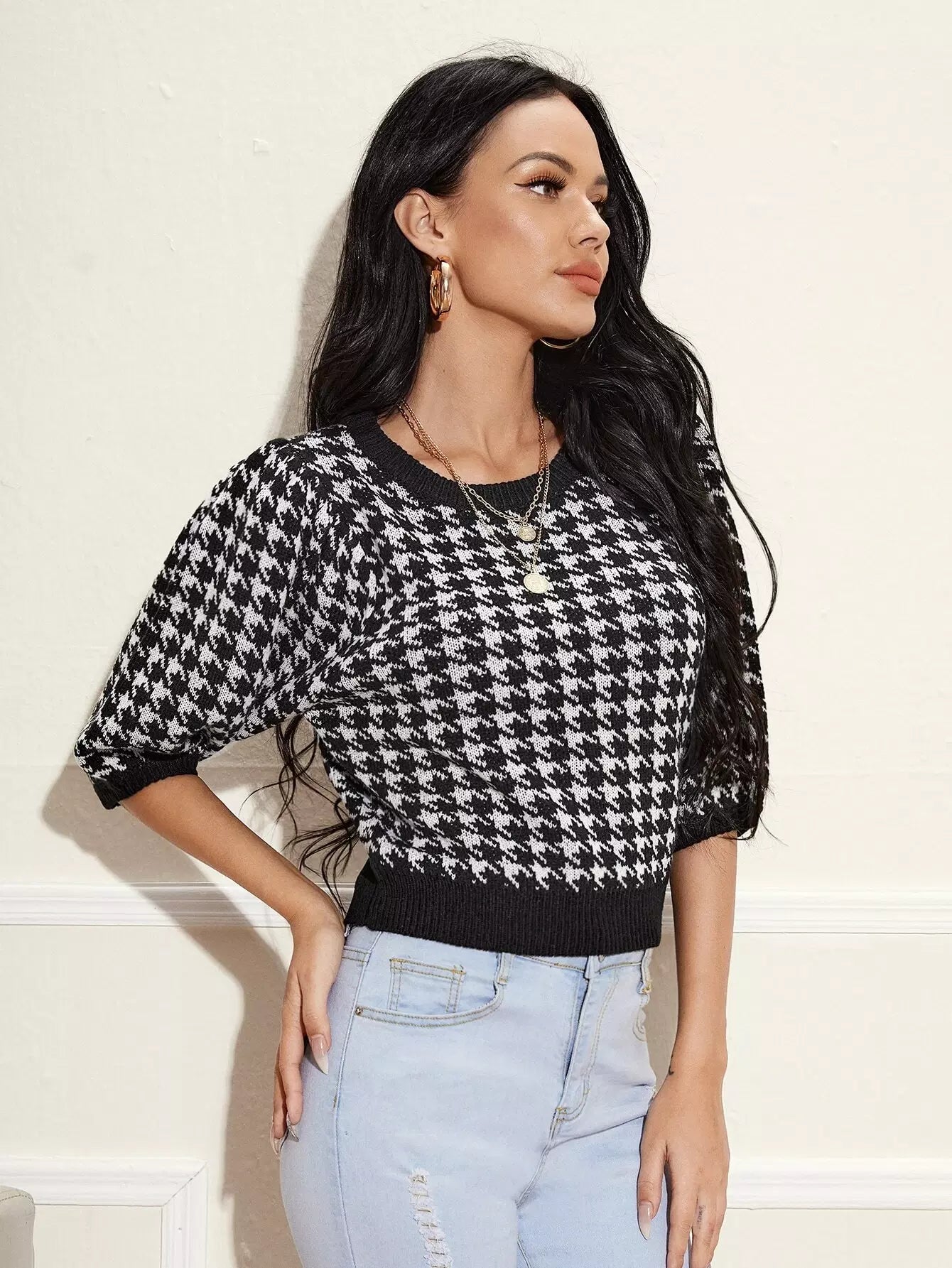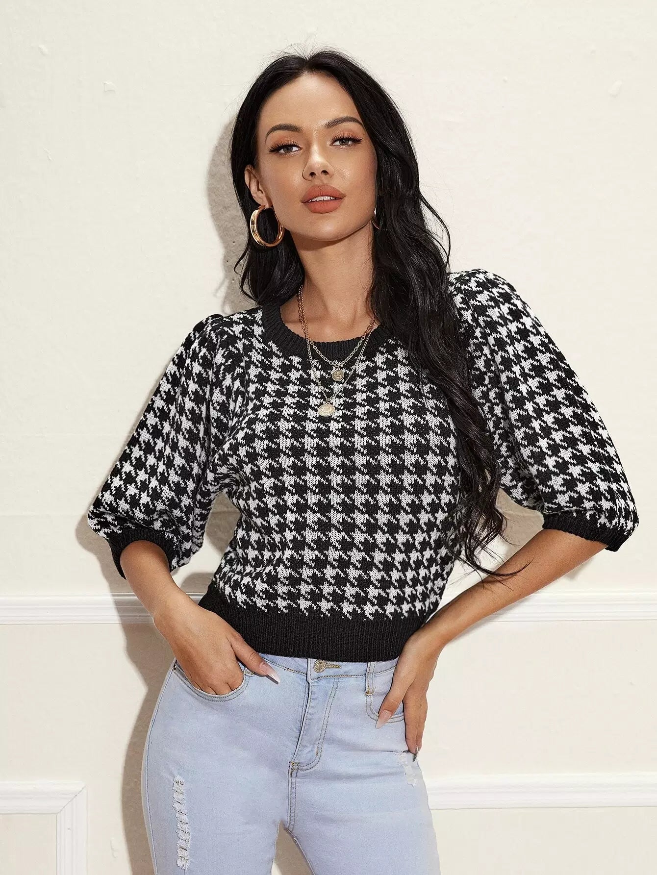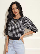 Lantern Sleeve Houndstooth Knit Top