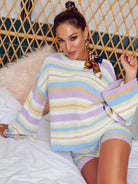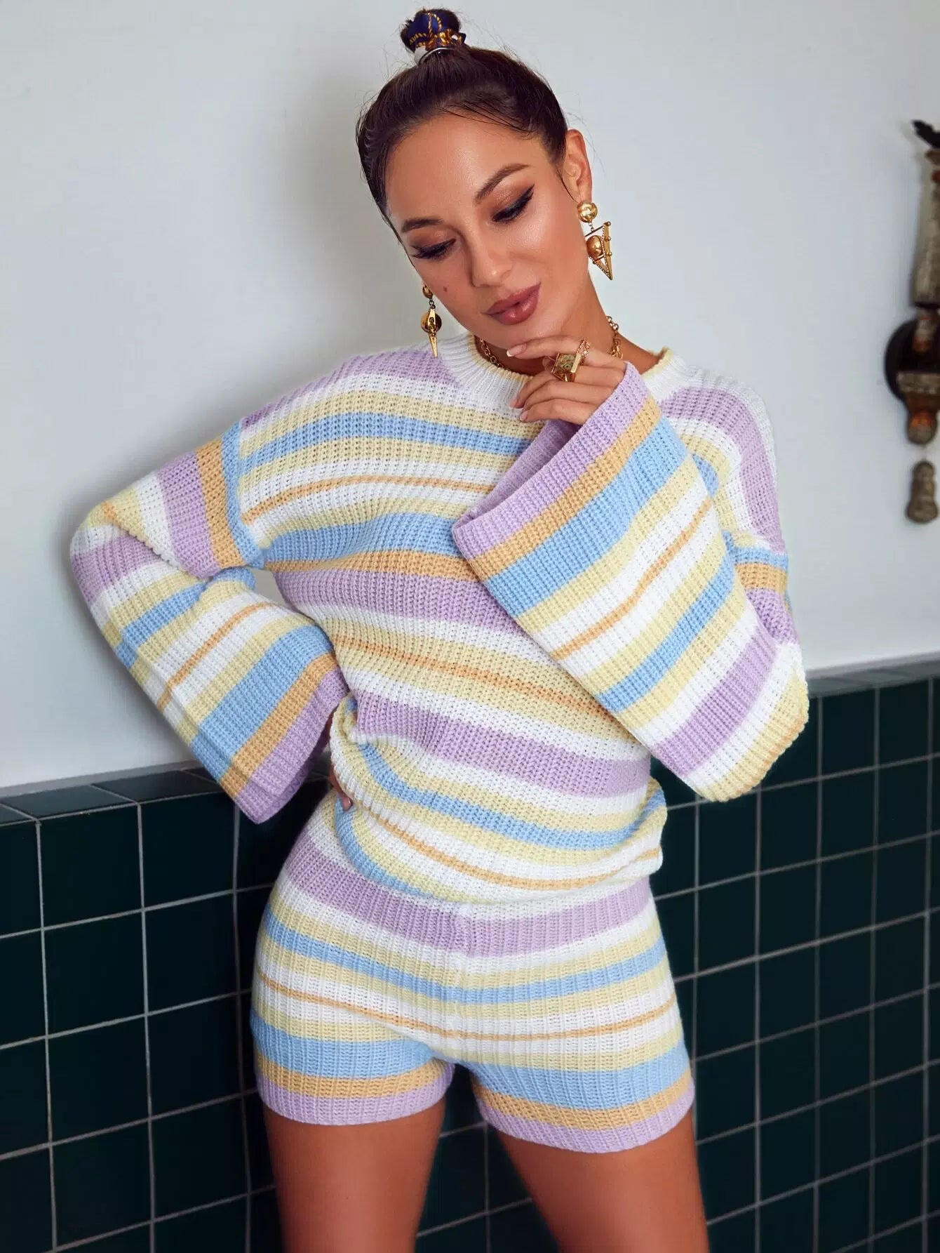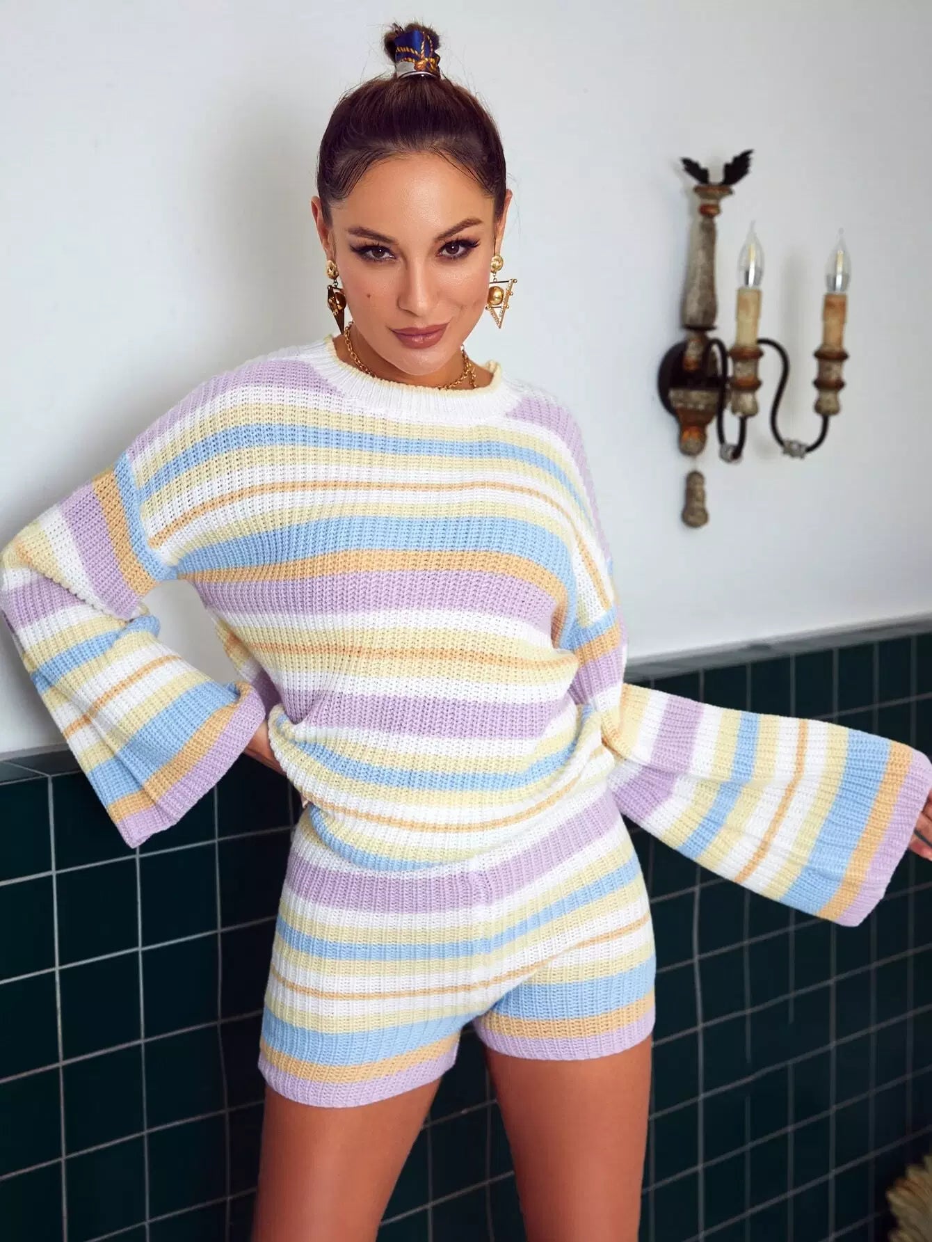 Drop Shoulder Striped Sweater & Knit Shorts Set