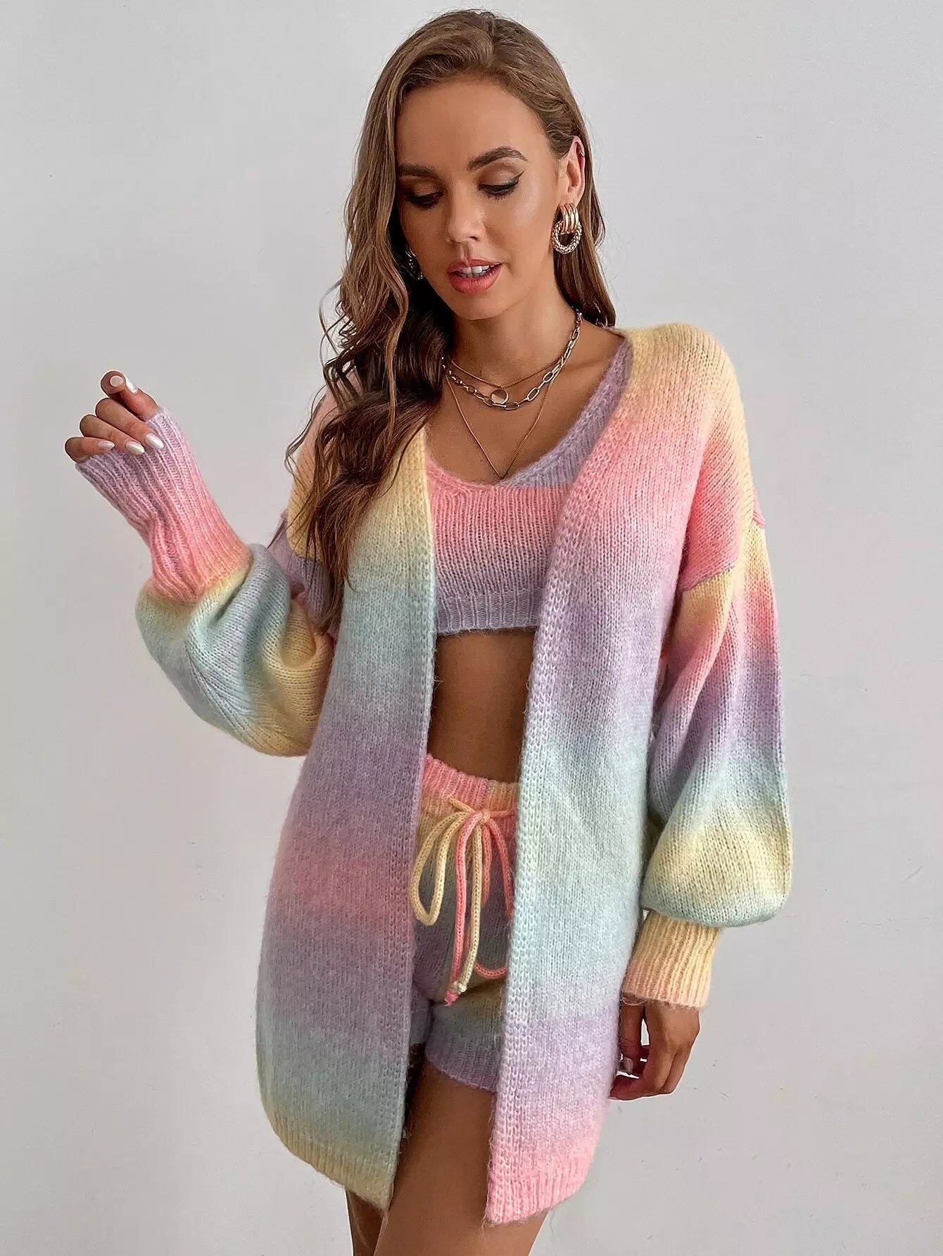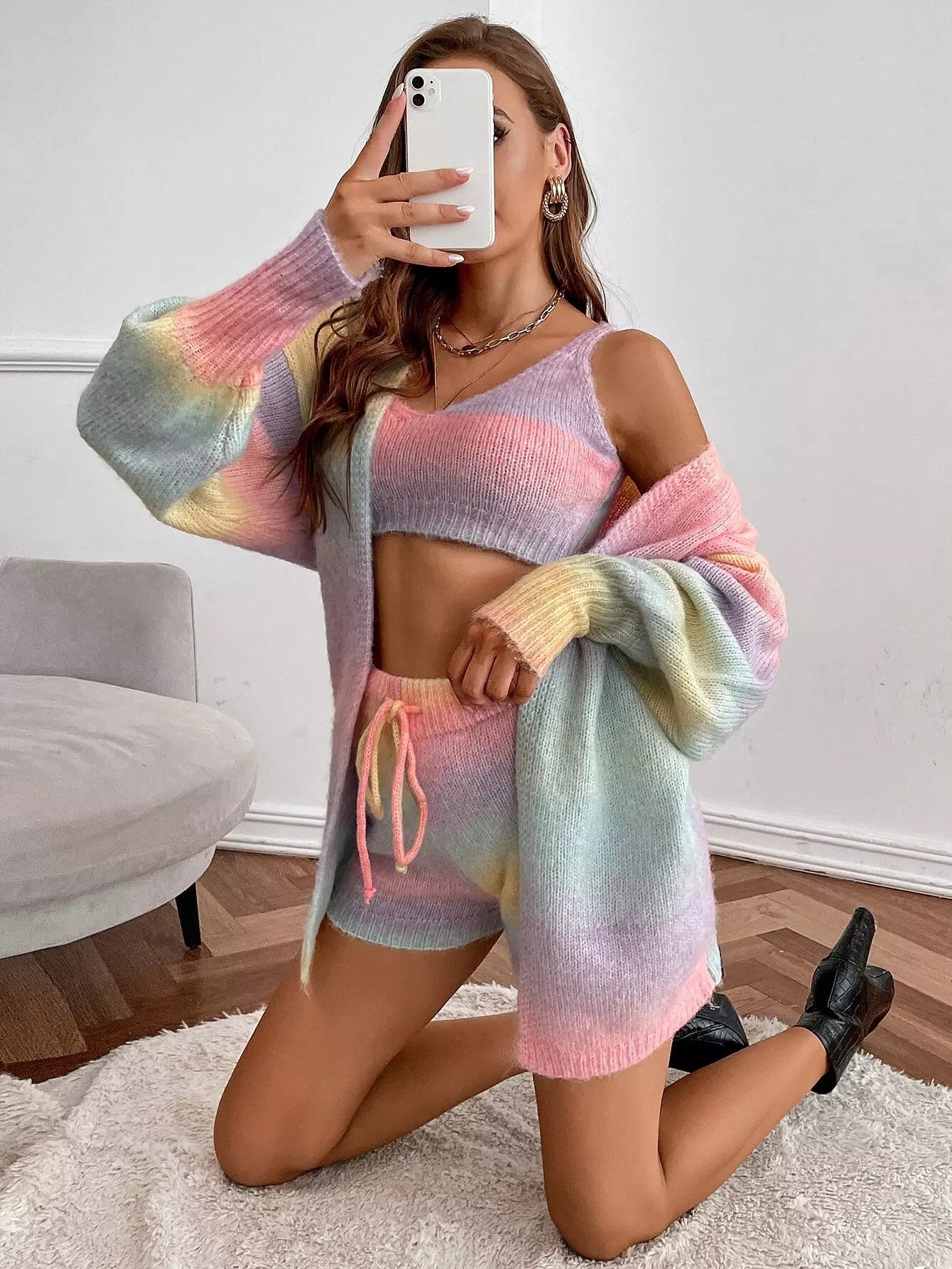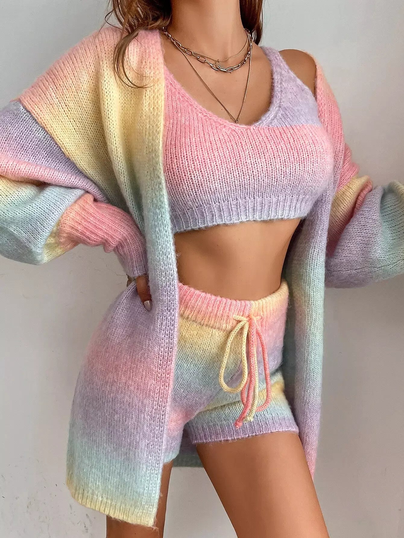 Ombre Crop Knit Top & Drawstring Shorts & Cardigan