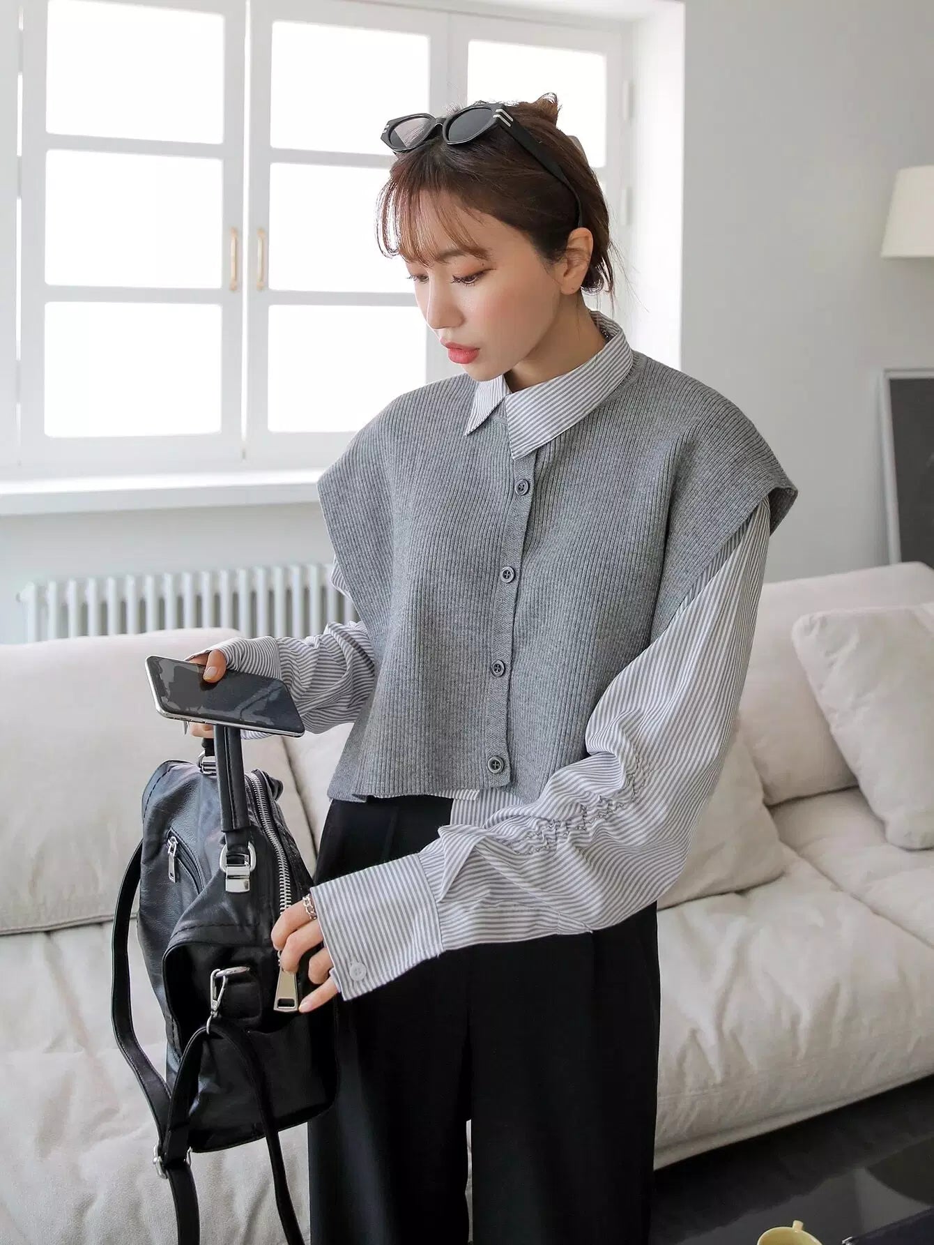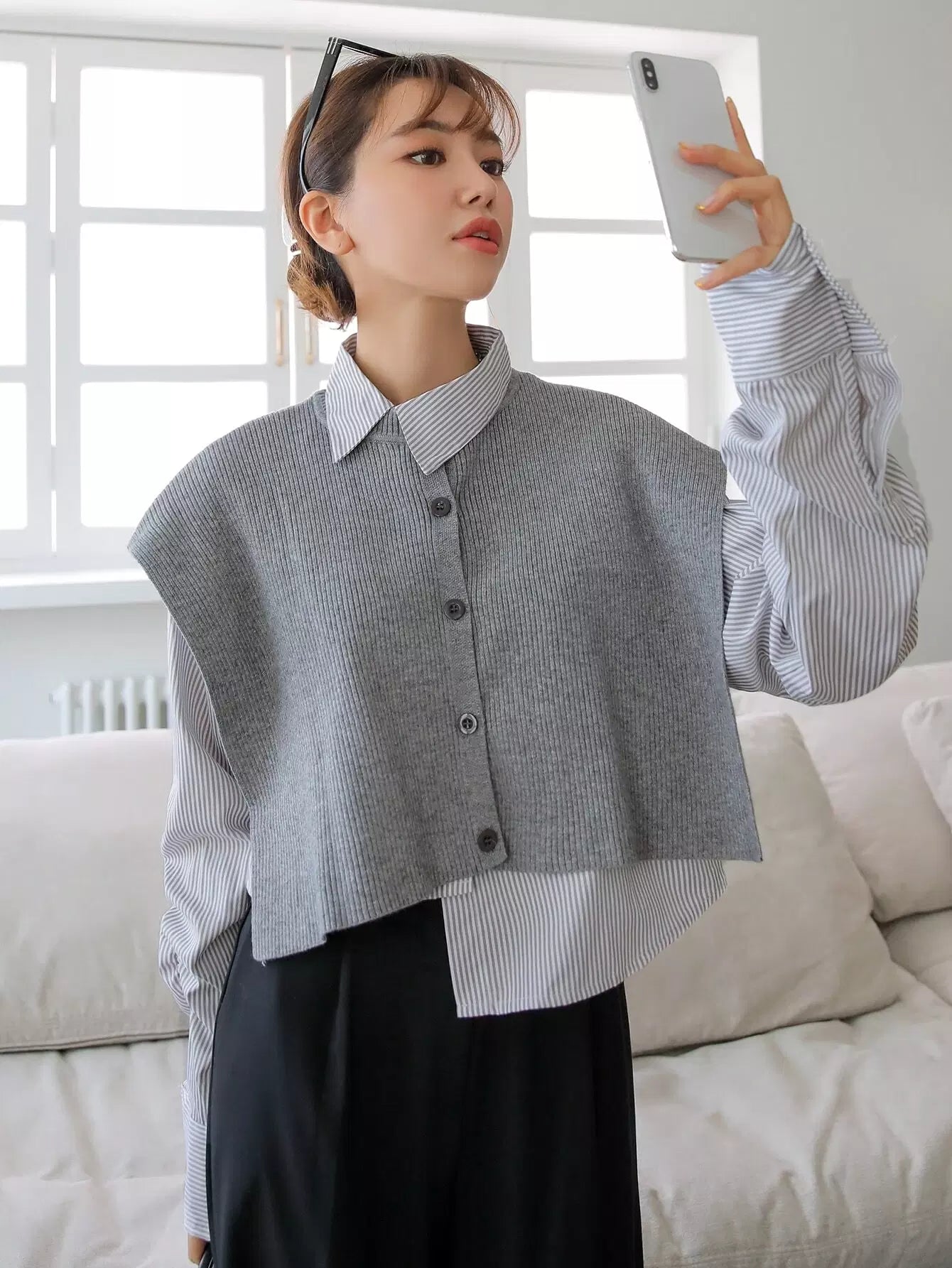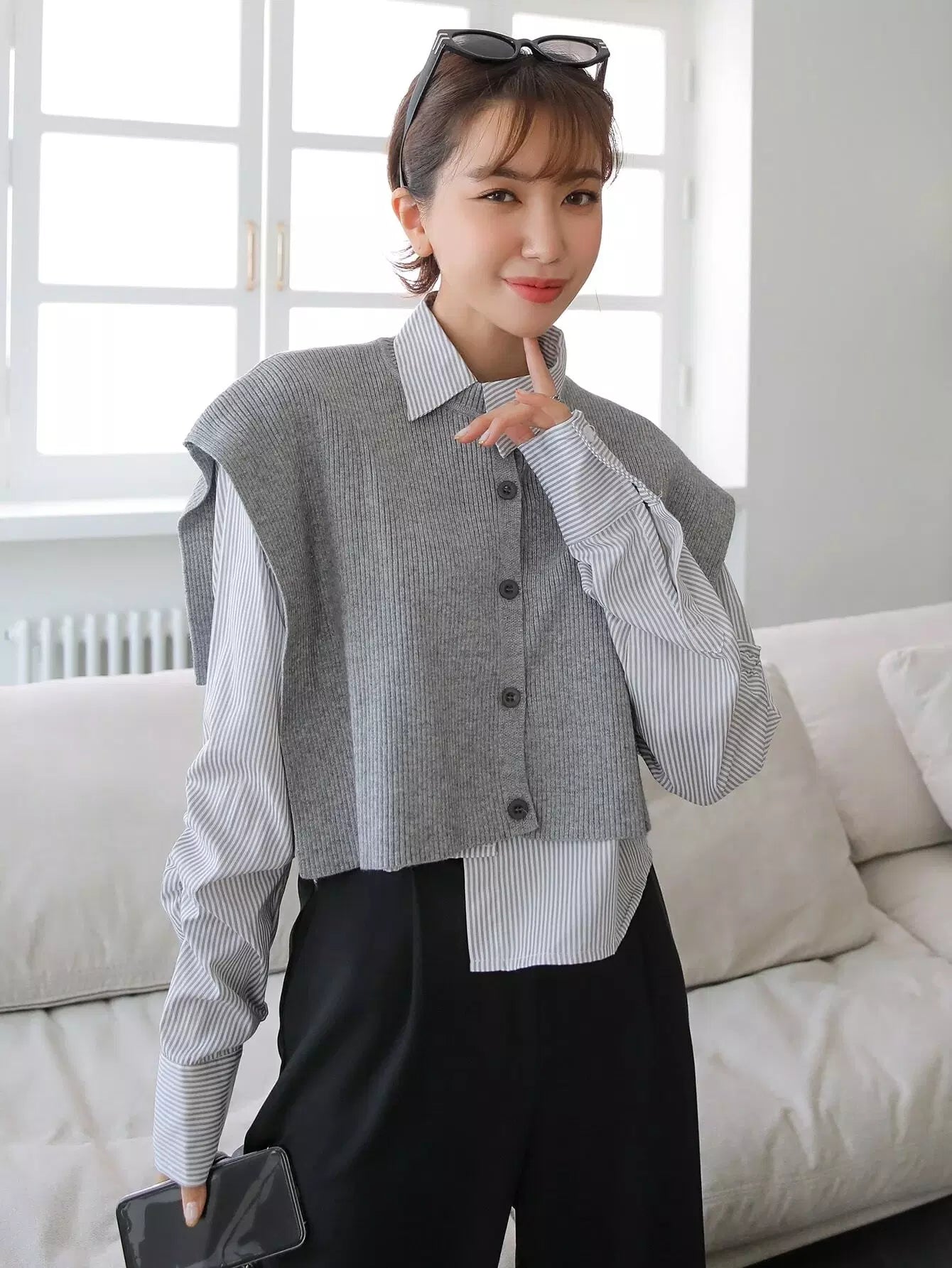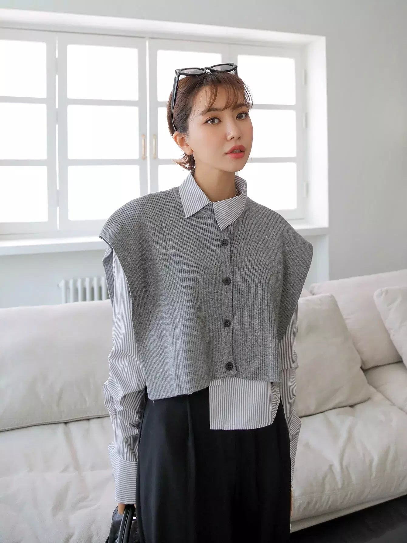 Ribbed Knit Sleeveless Crop Cardigan & Vertical Stripe Asymmetrical Hem Blouse