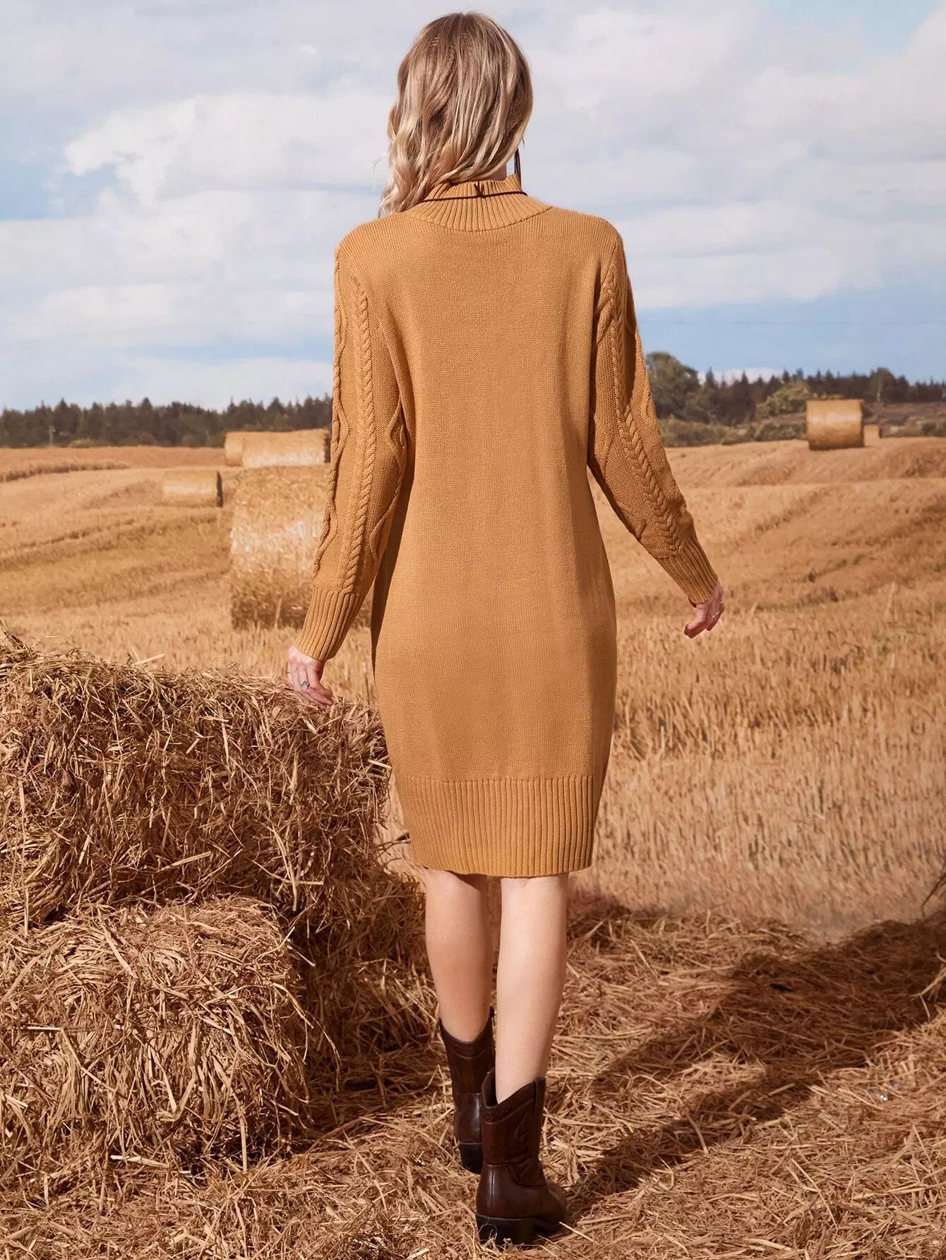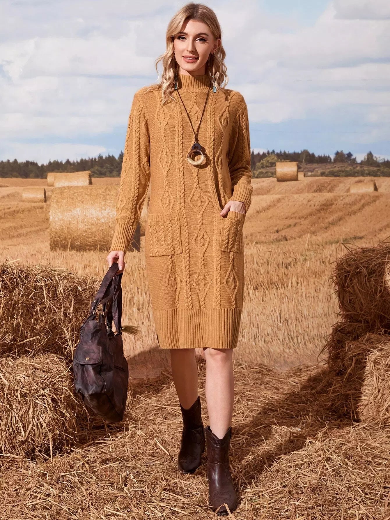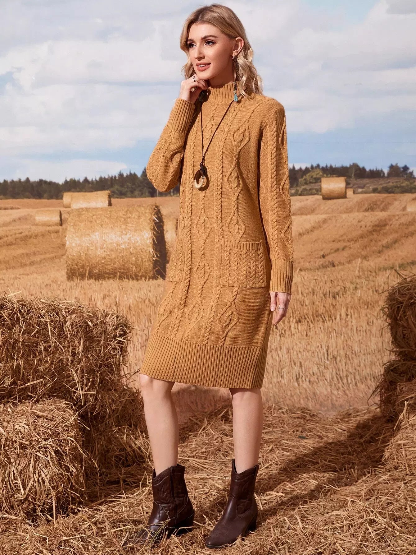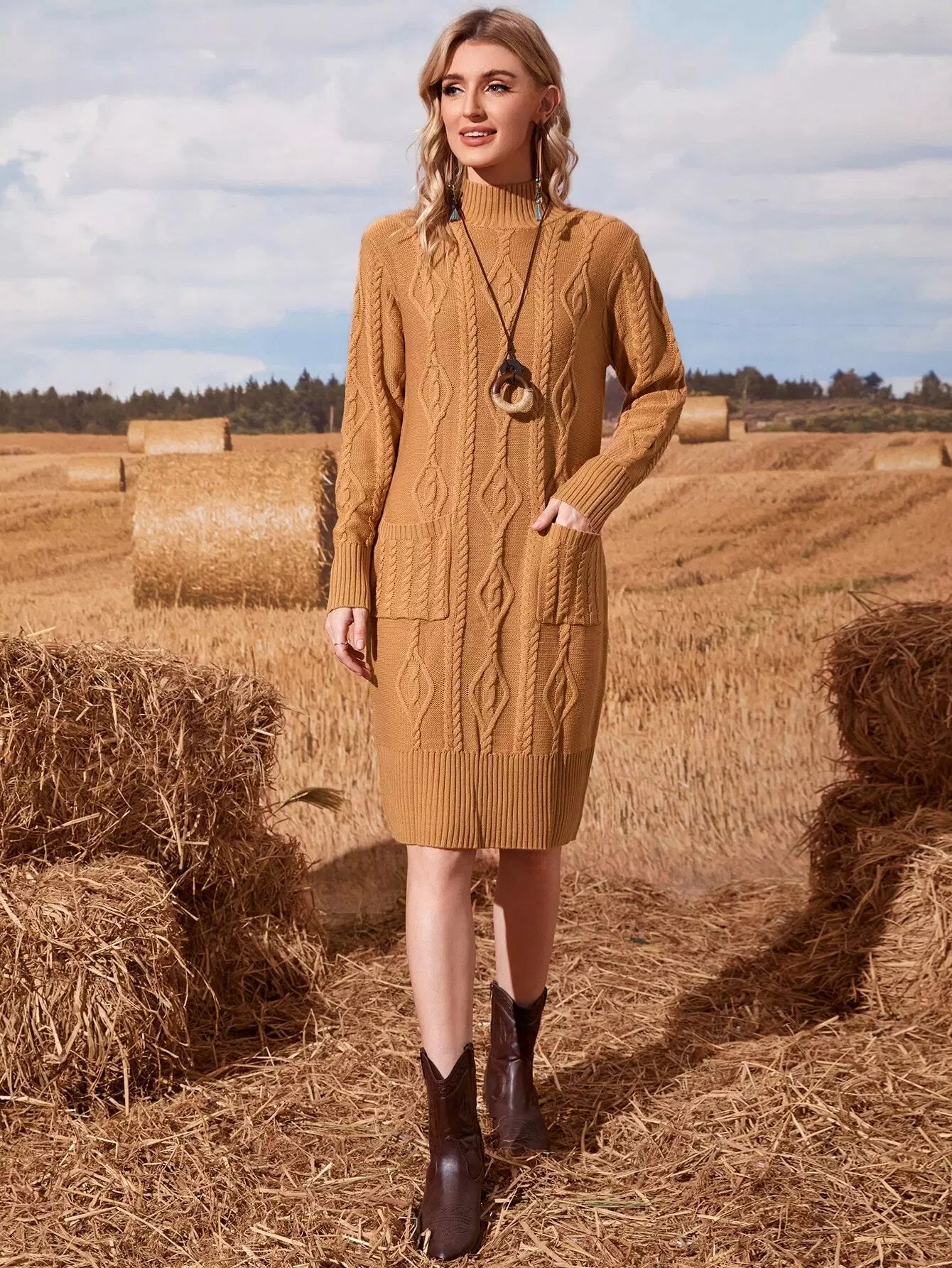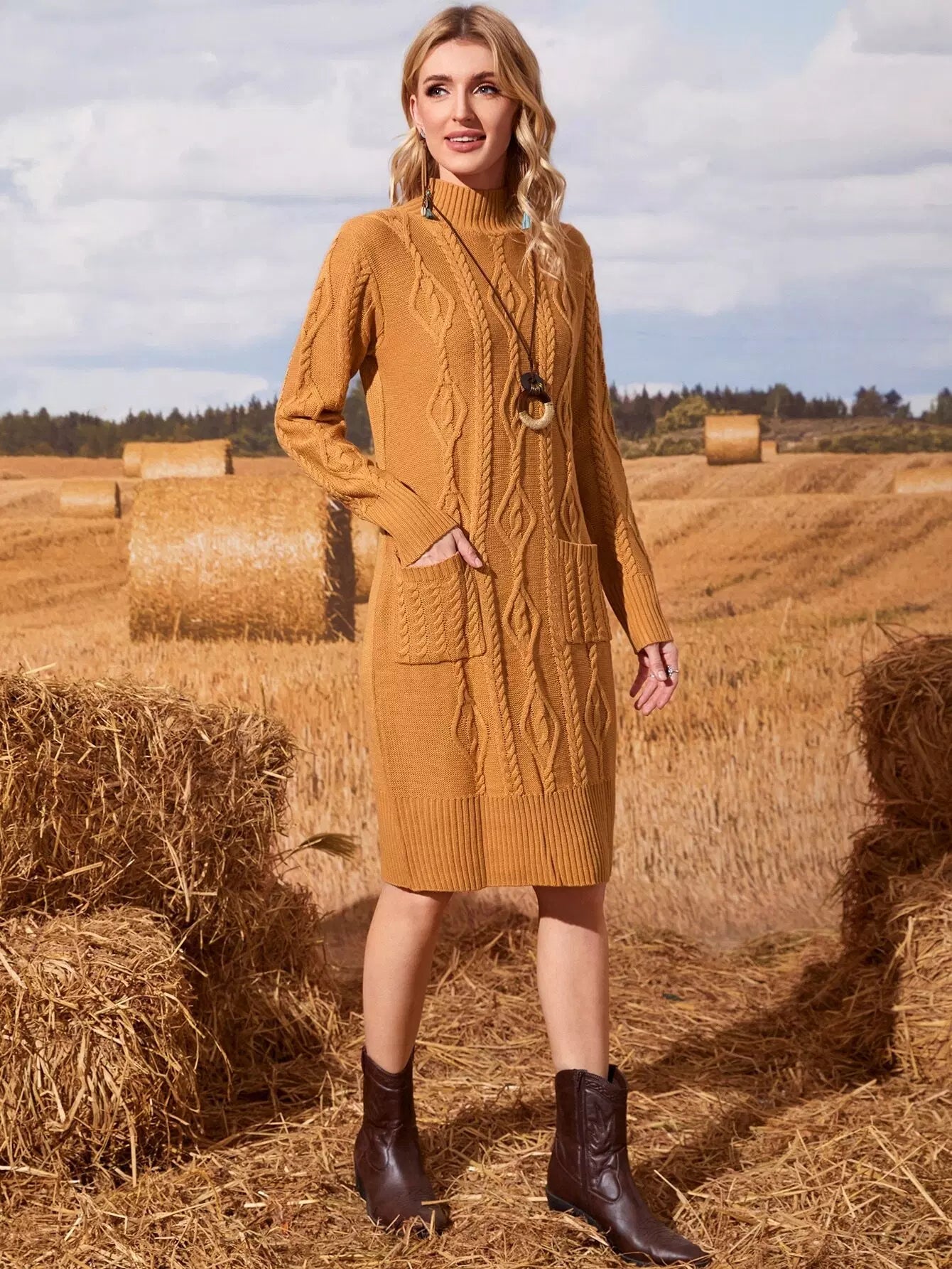 Cable Knit Pocket Patched Sweater Dress