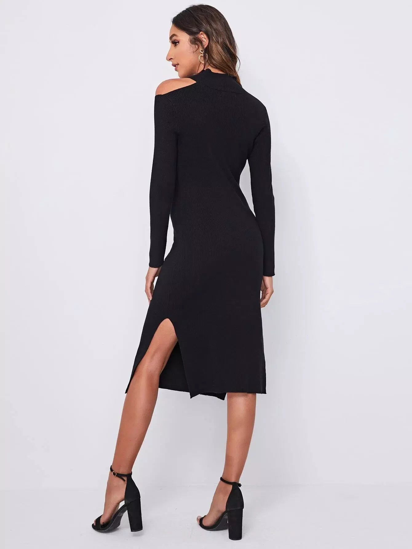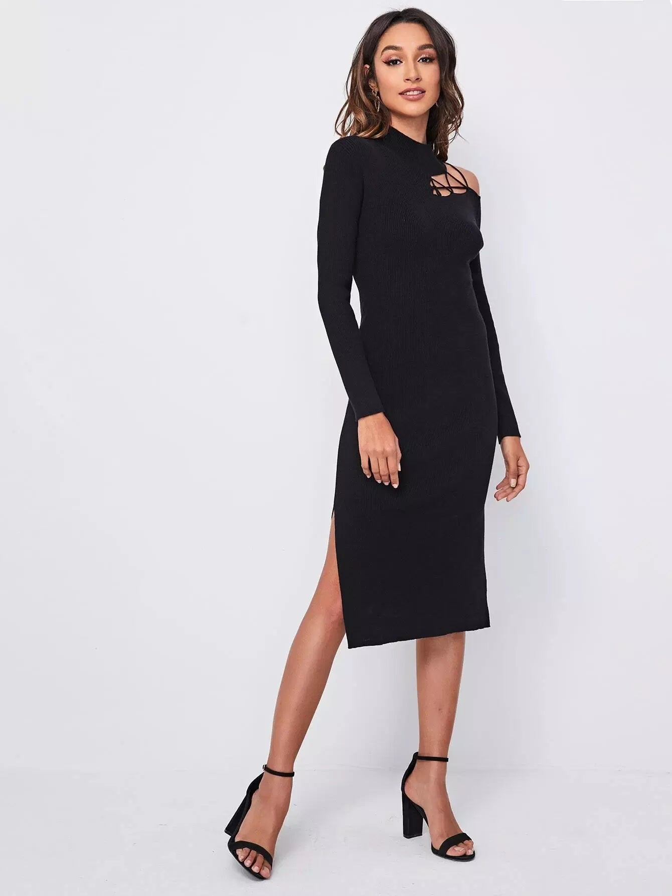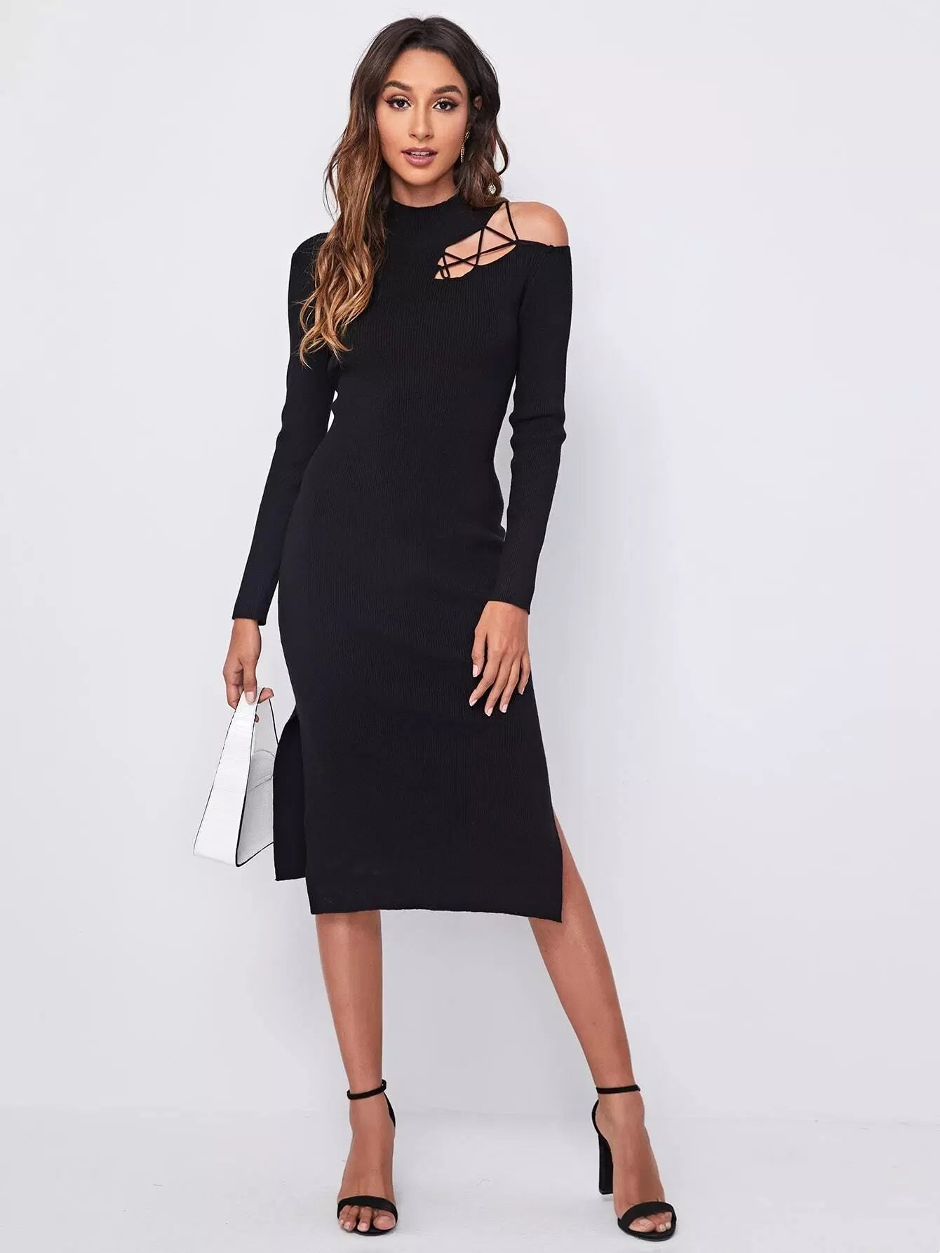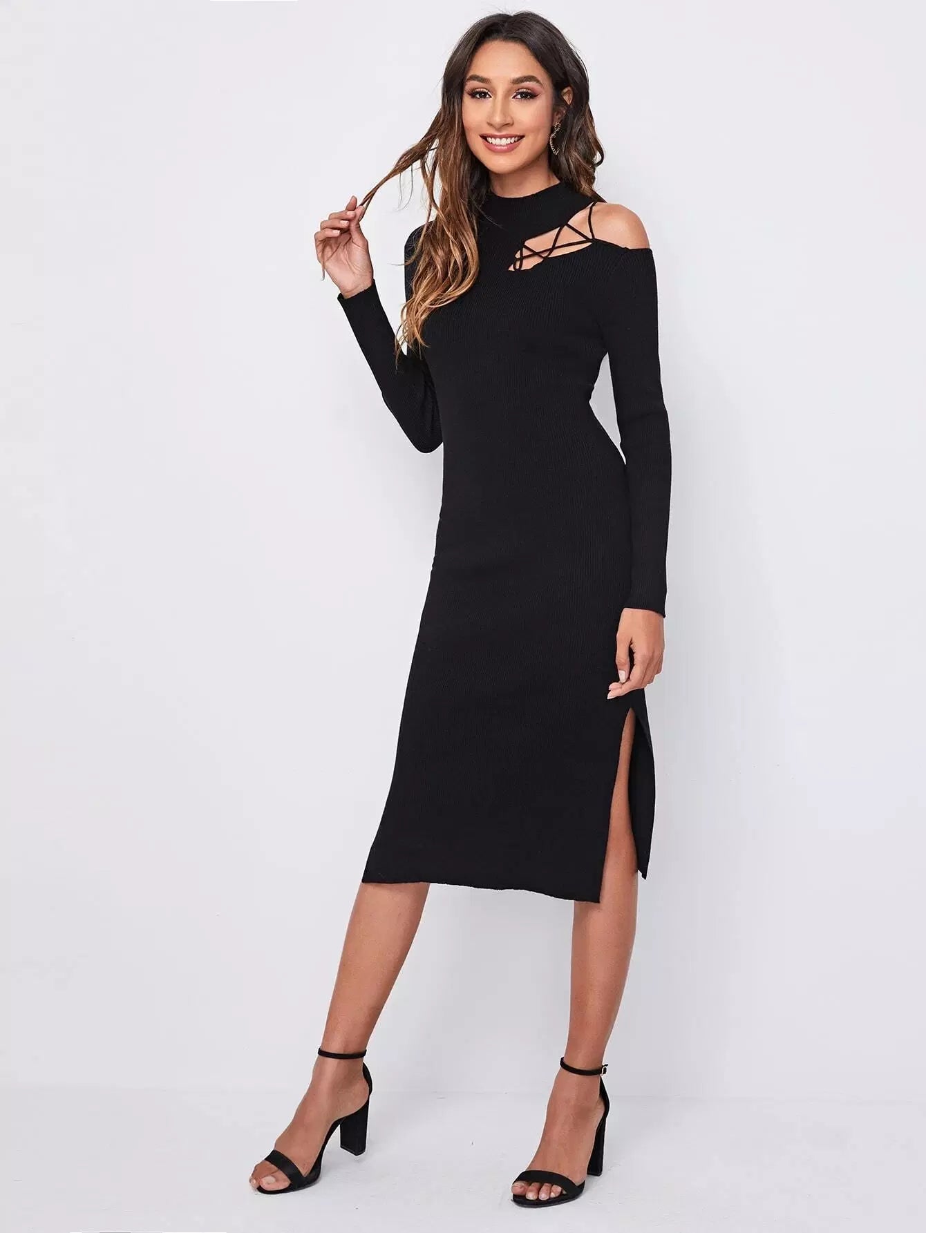Cut Out Criss Cross Slit Hem Rib-knit Sweater Dress