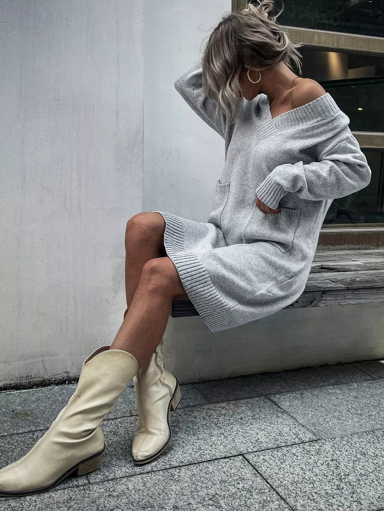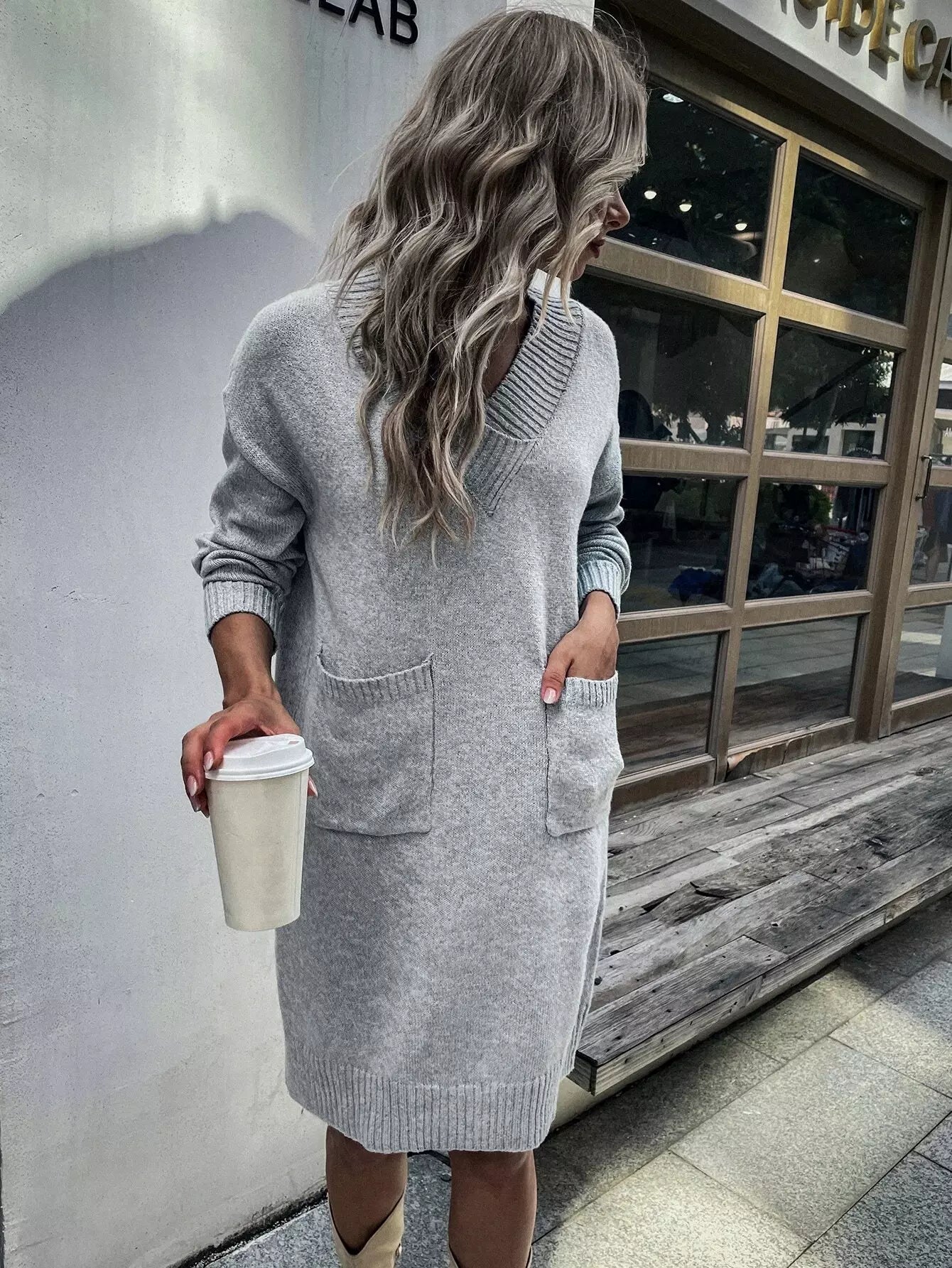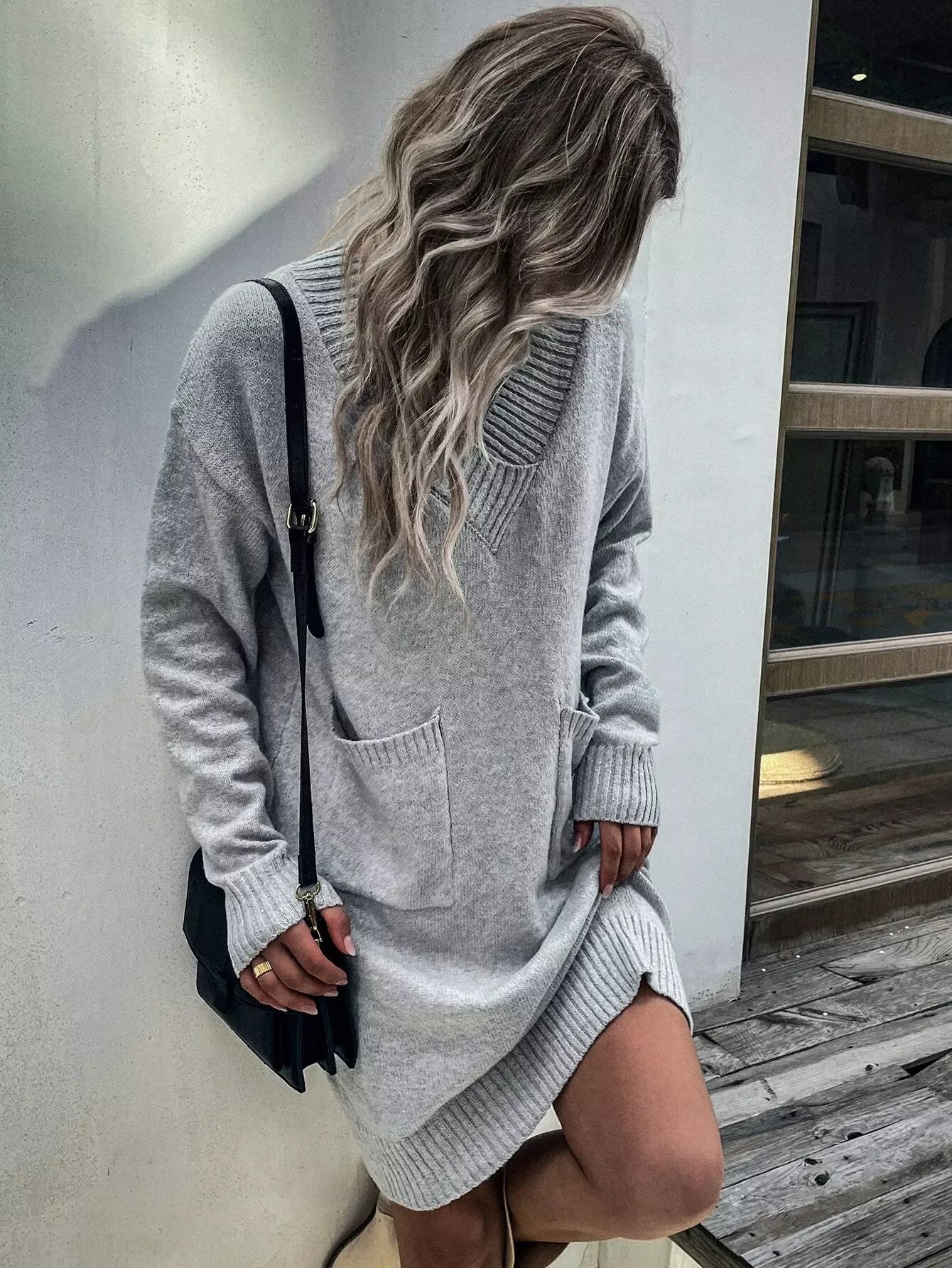Drop Shoulder Double Pocket Sweater Dress