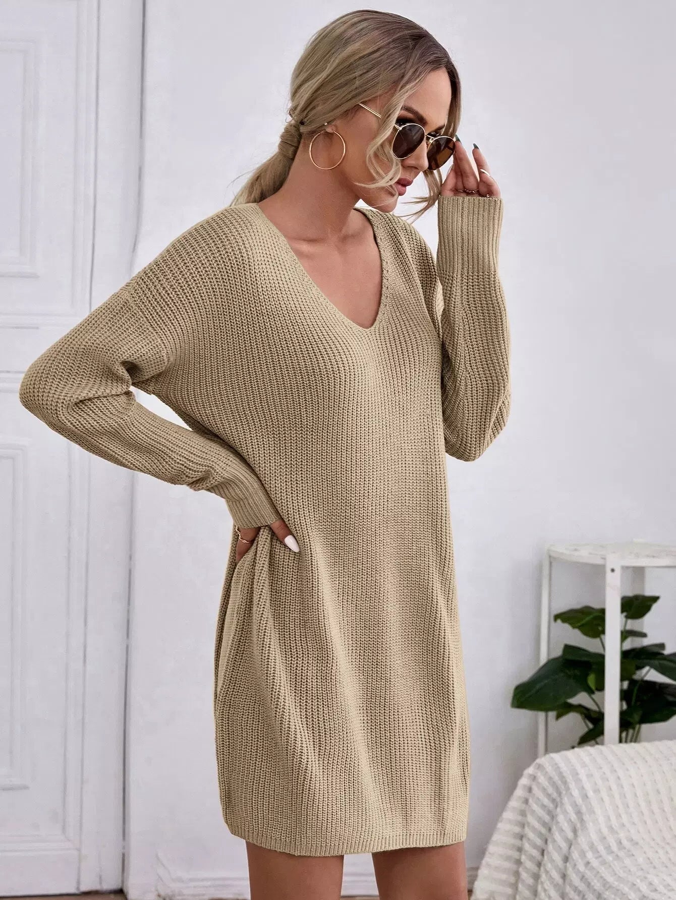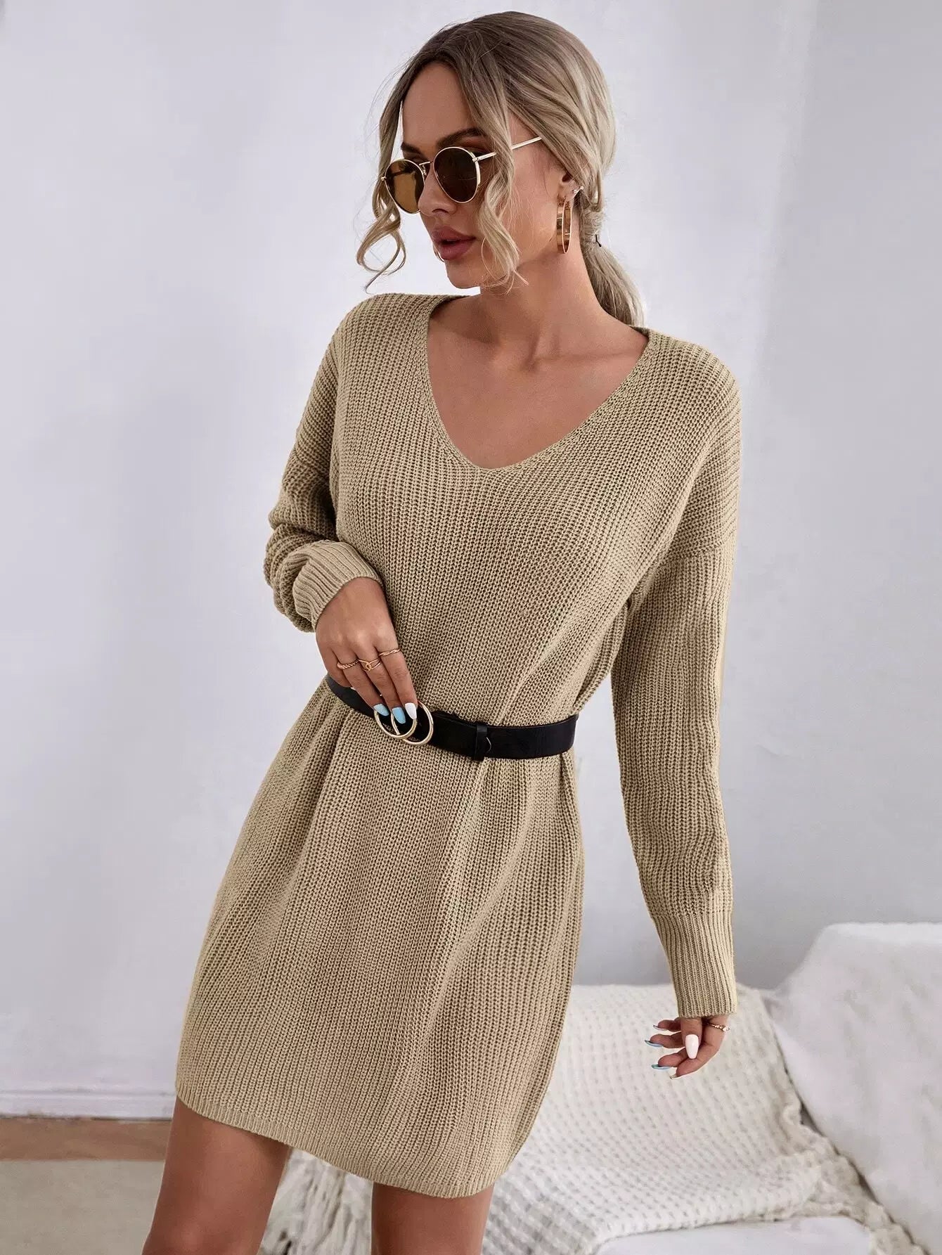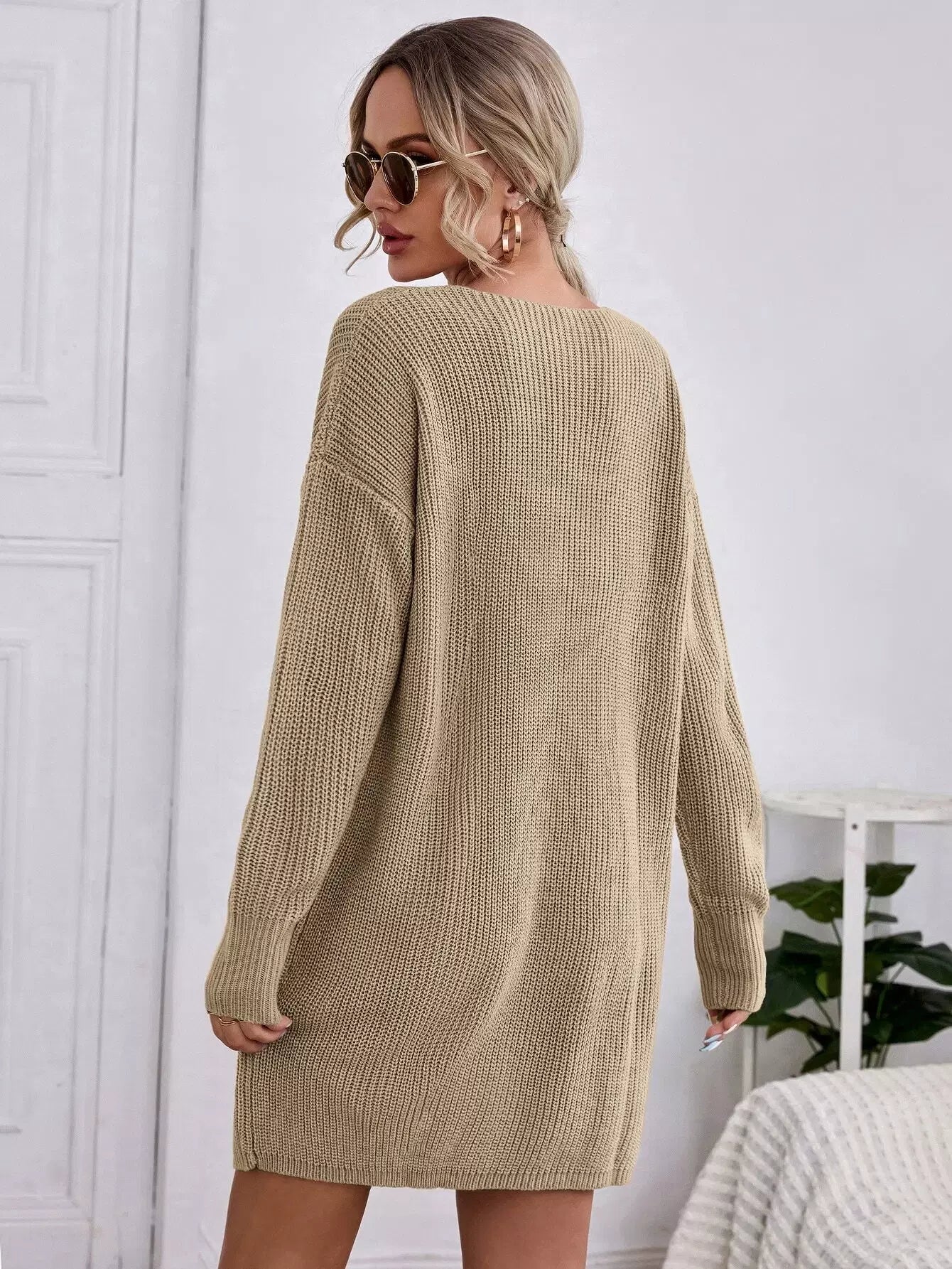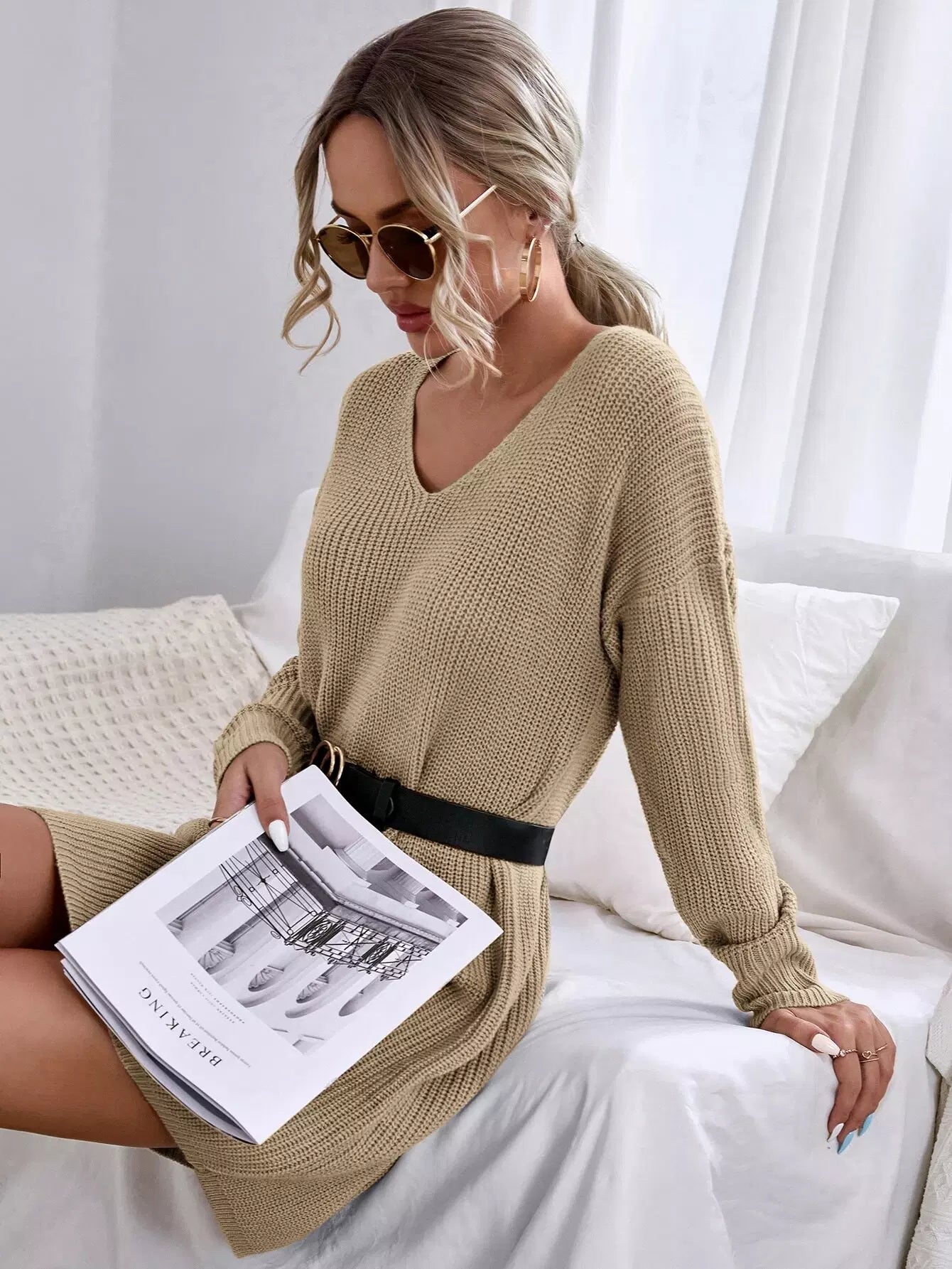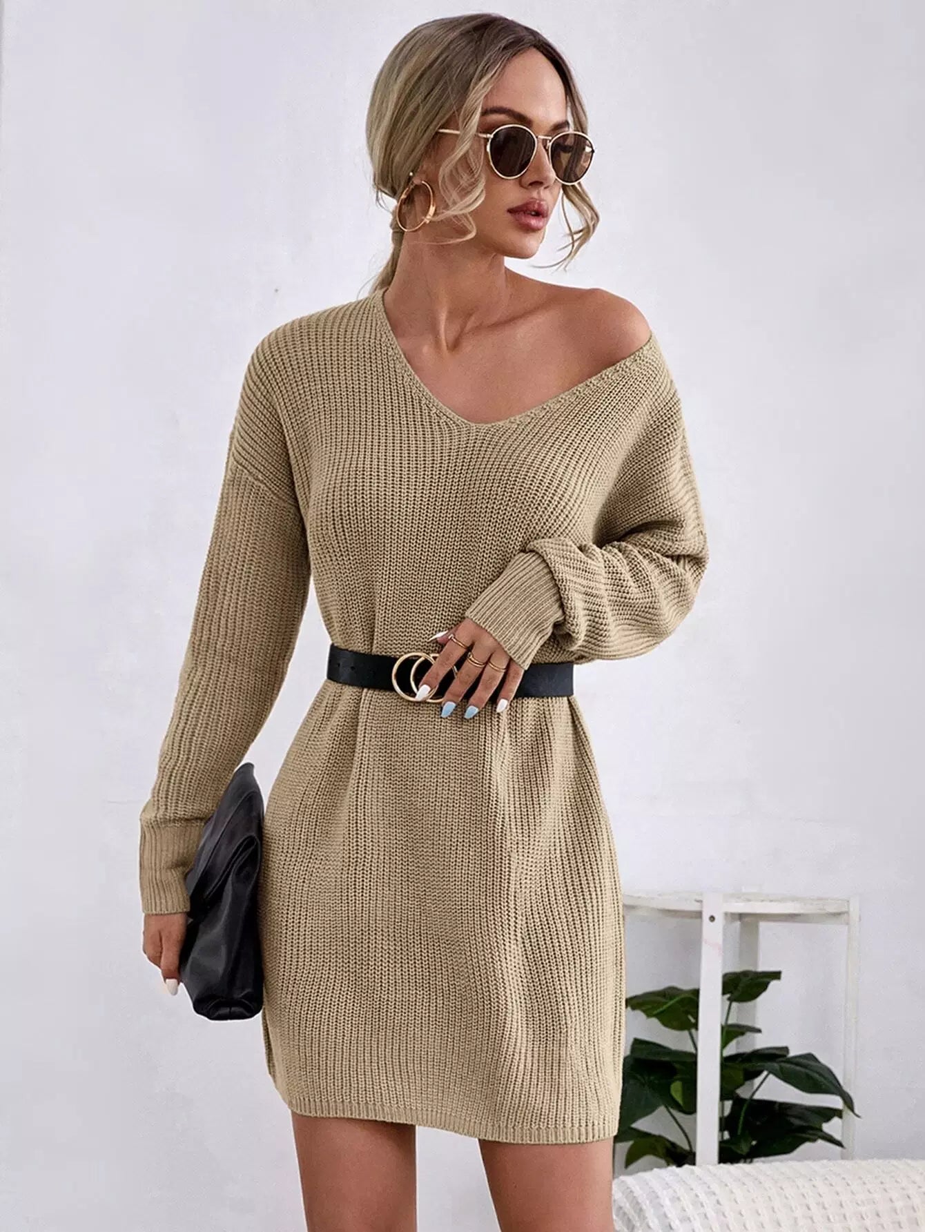 Drop Shoulder Ribbed Knit Sweater Dress Without Belt