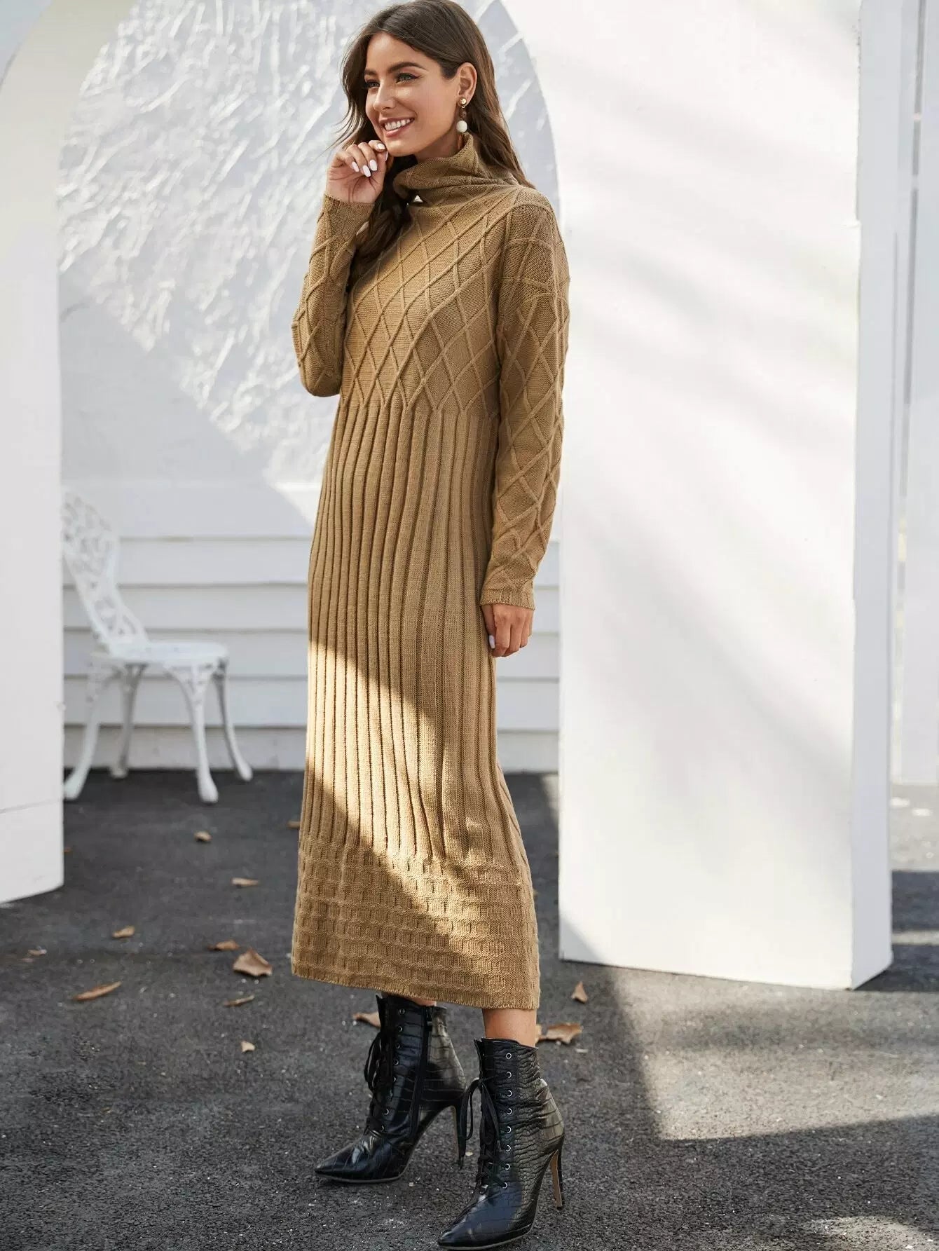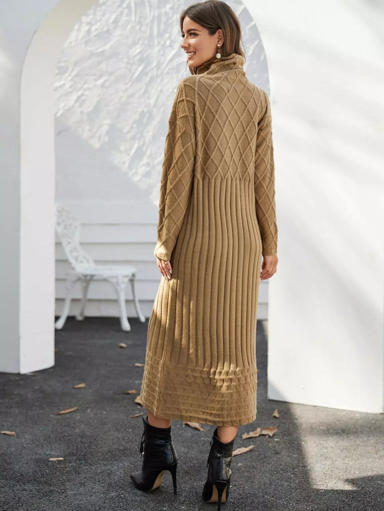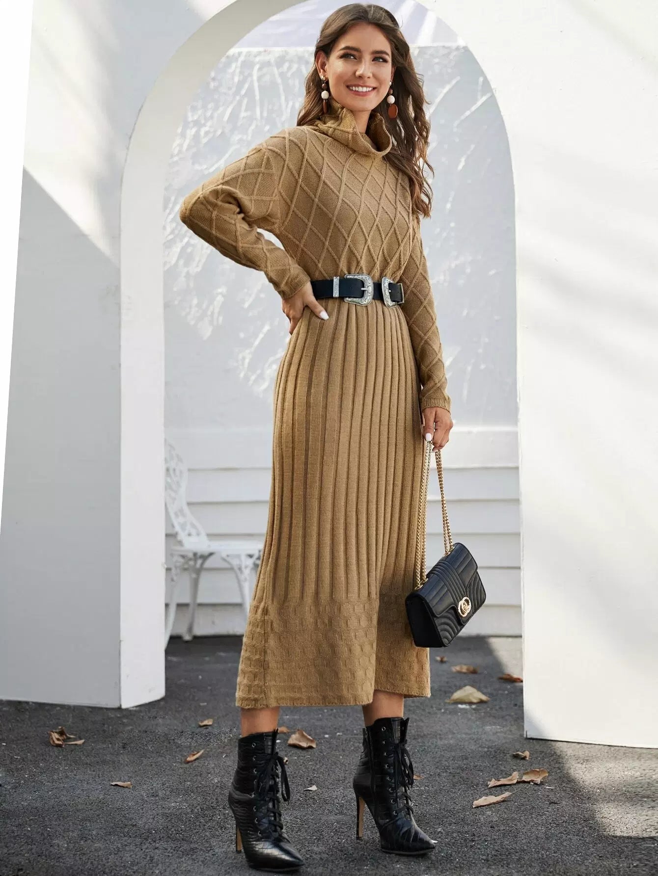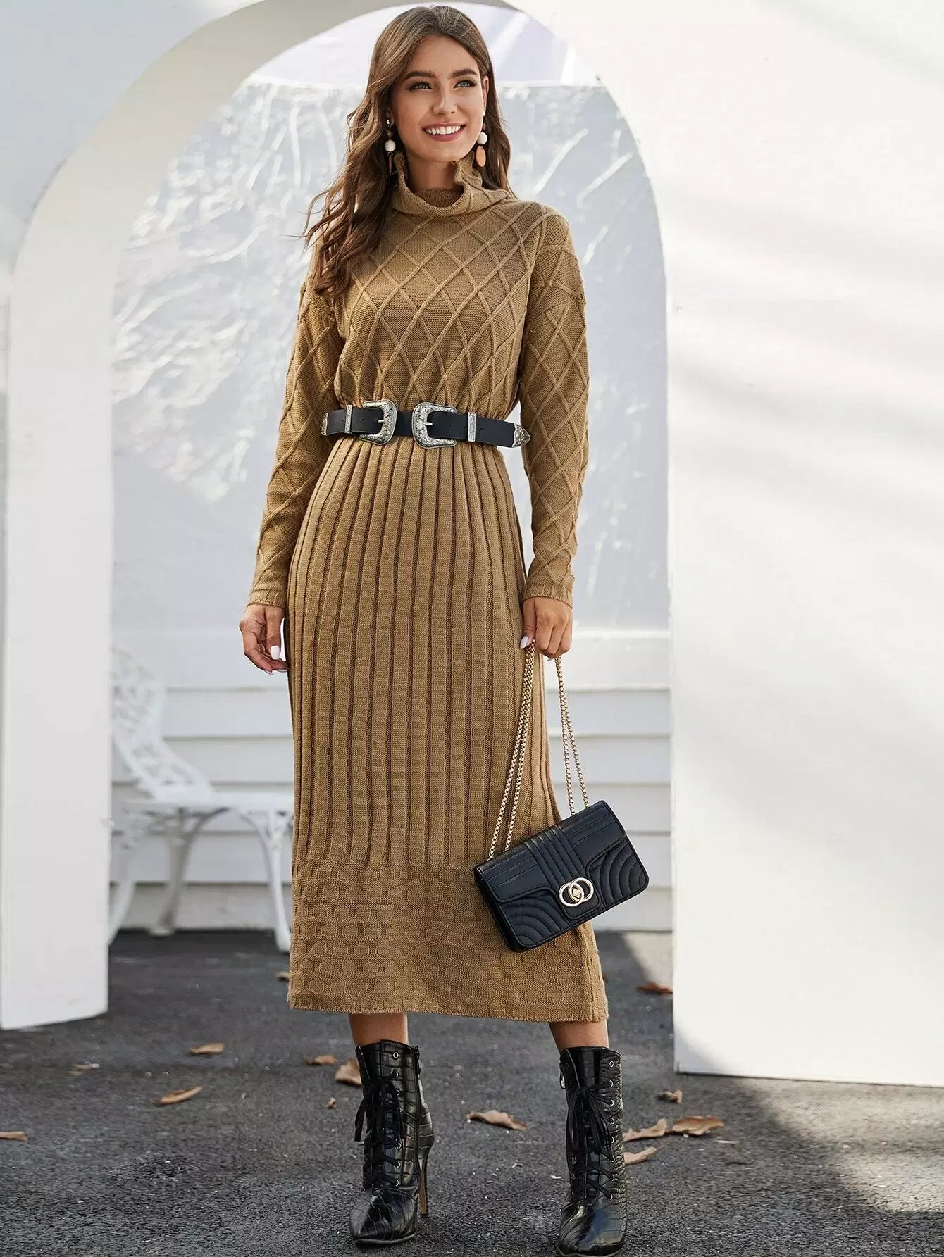 Funnel Neck Geo Knit Sweater Dress Without Belt
