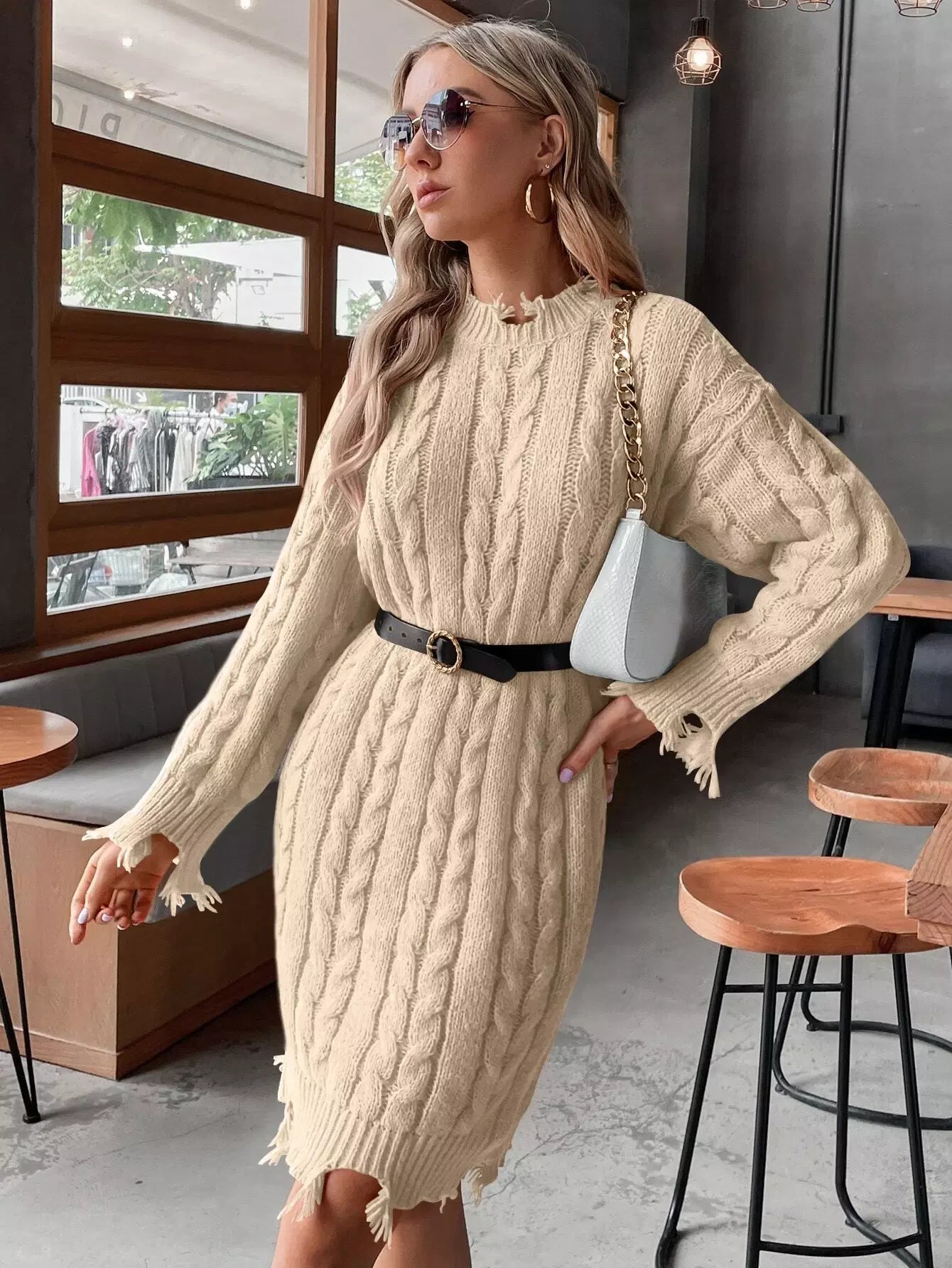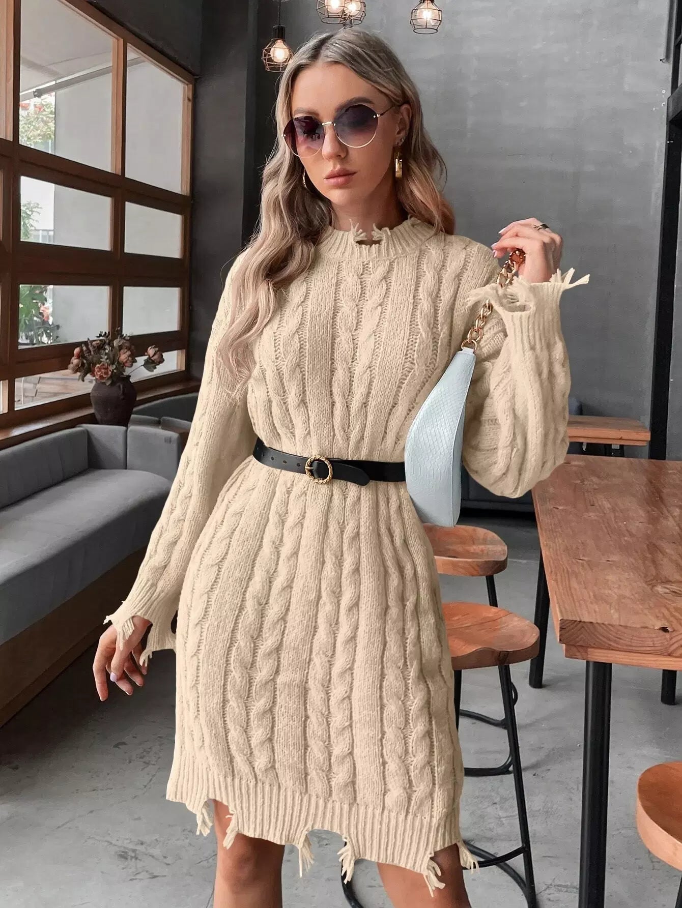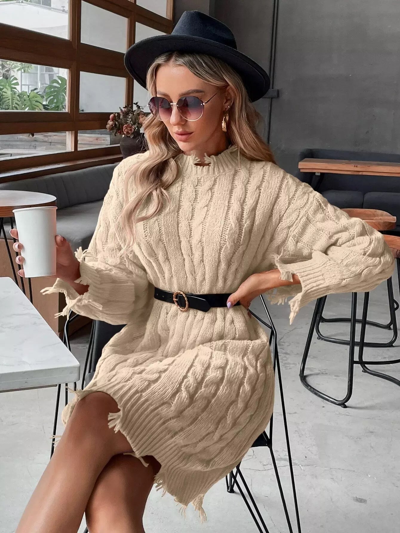 Raw Hem Cable Knit Sweater Dress Without Belt