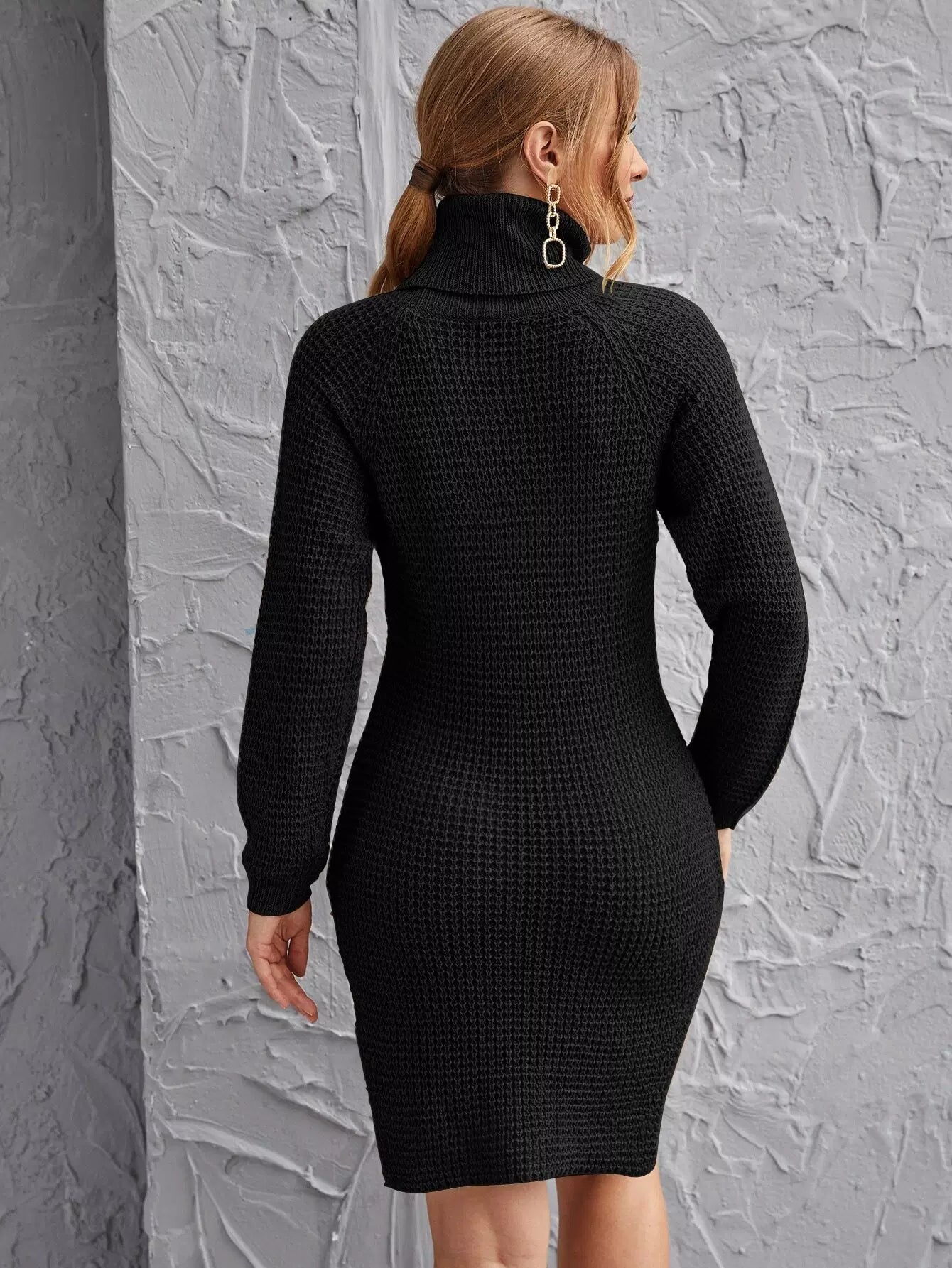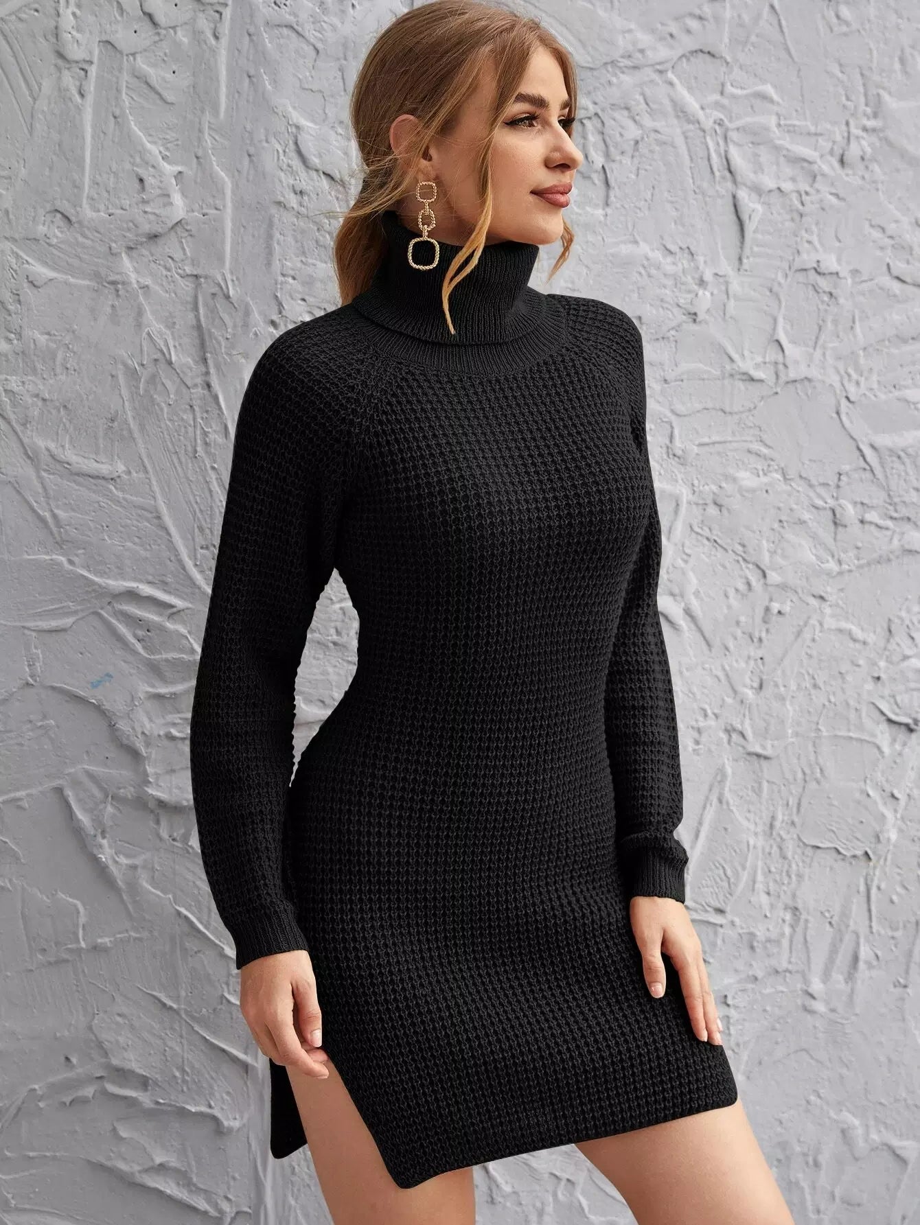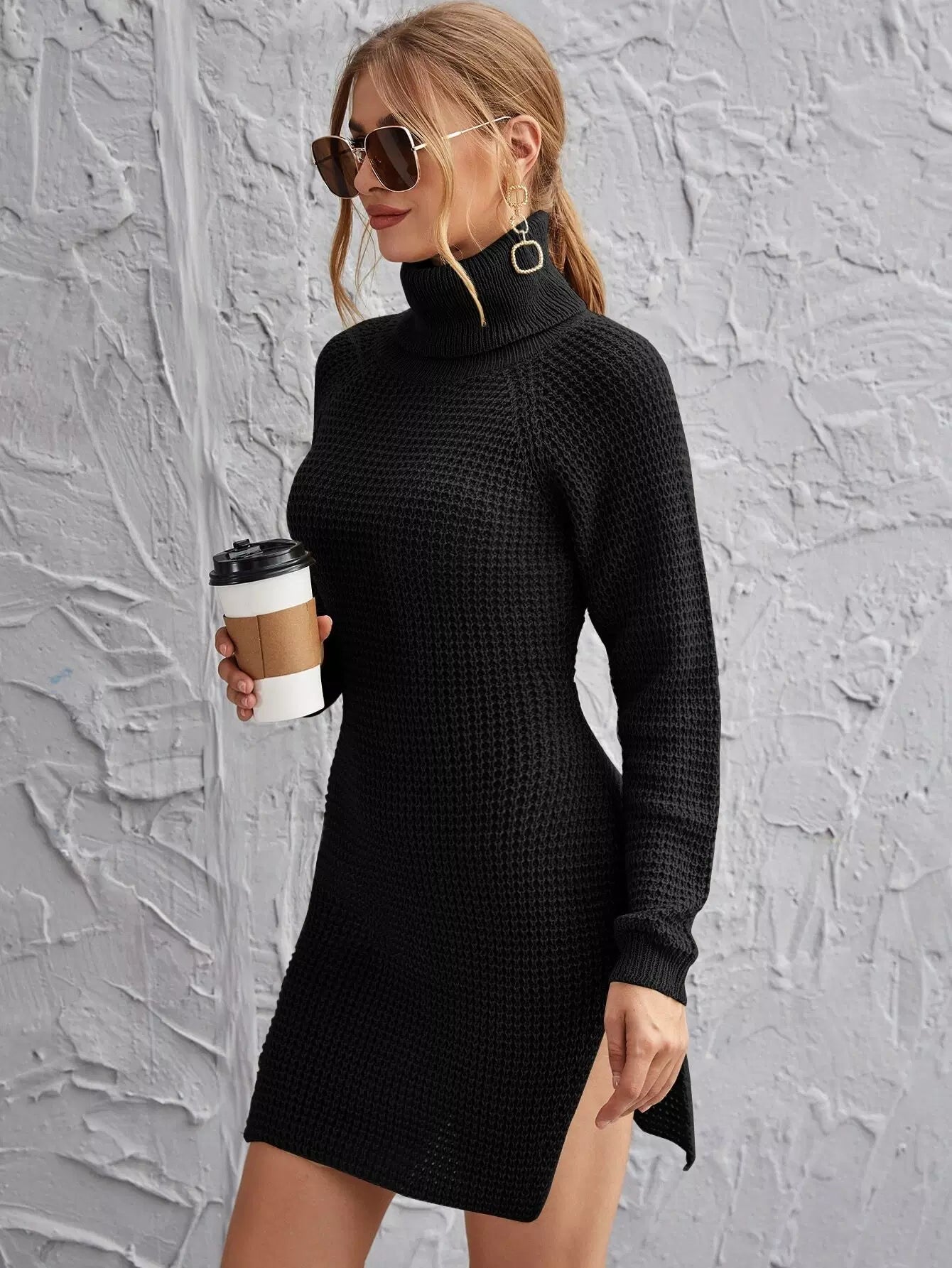 Rolled Neck Raglan Sleeve Split Side Sweater Dress