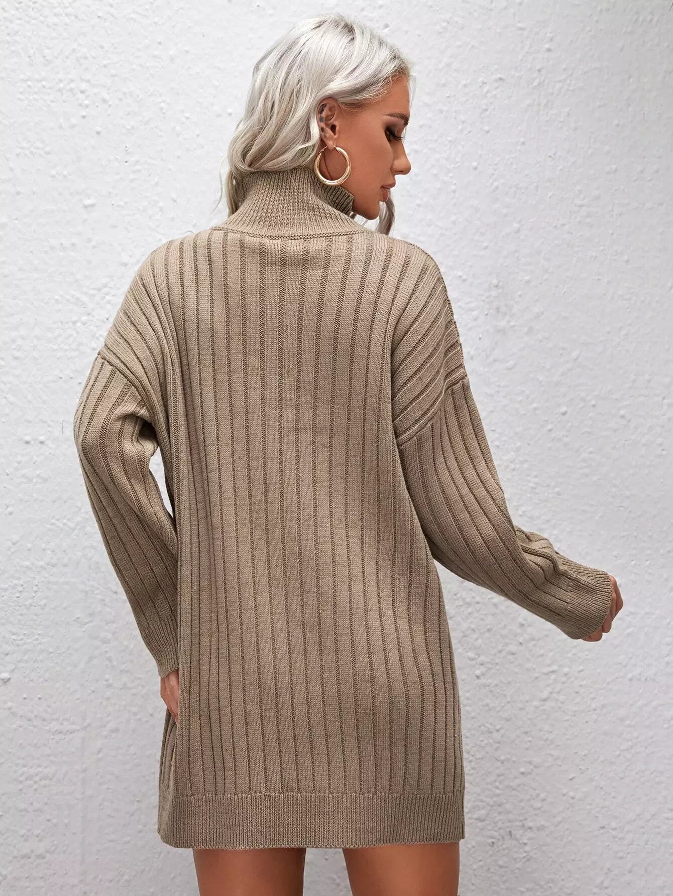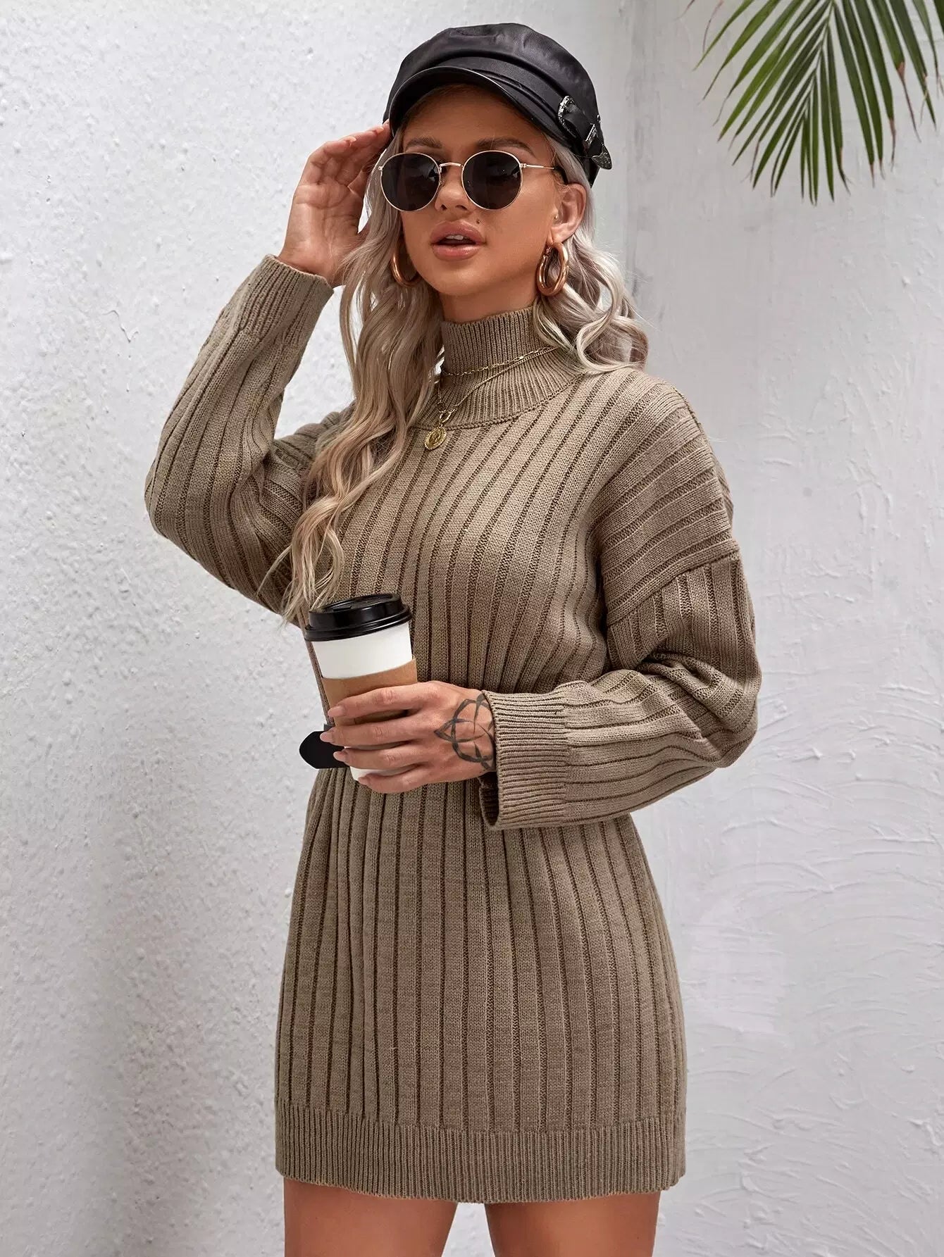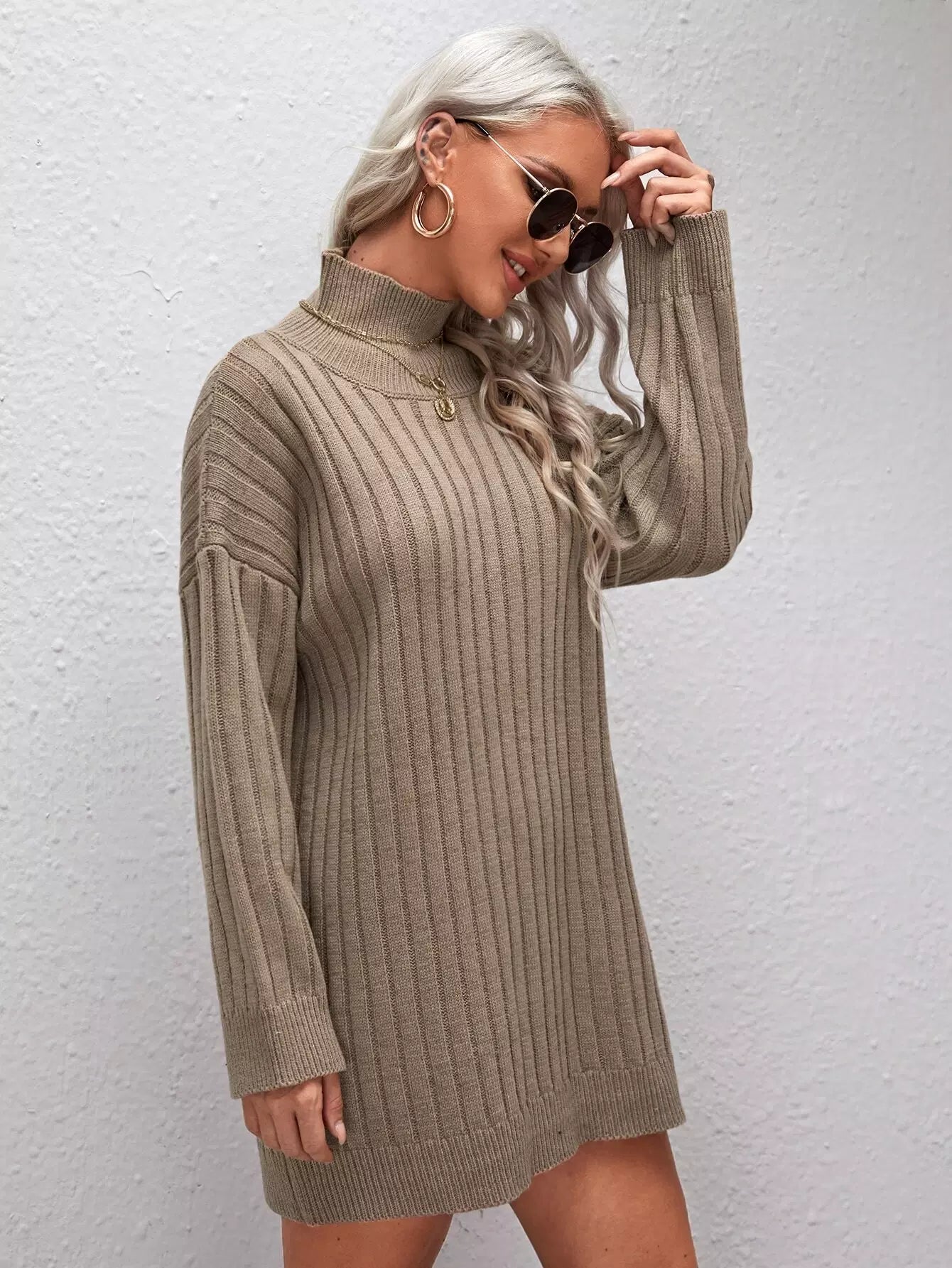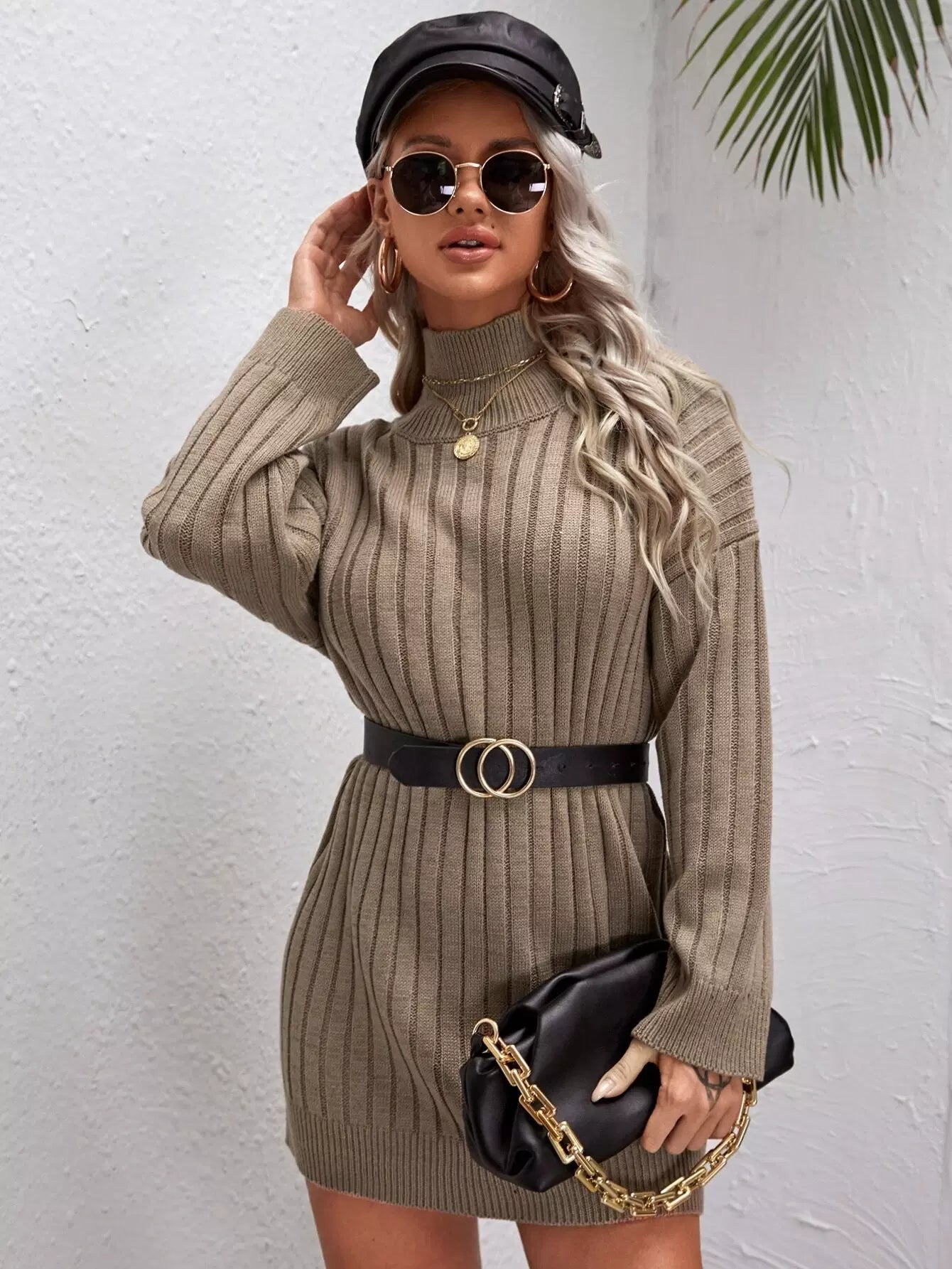 Women - Solid Drop Shoulder High Neck Sweater Dress Without Belt