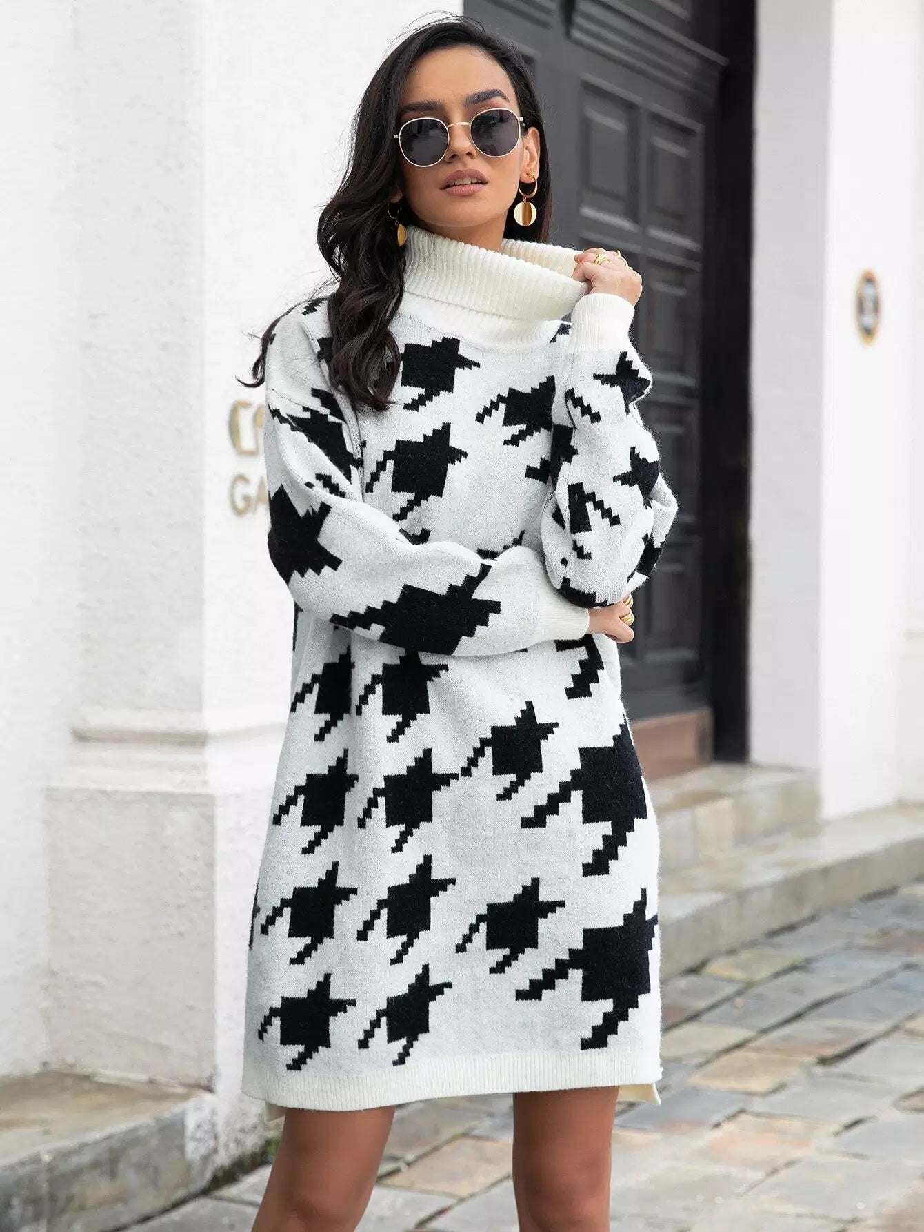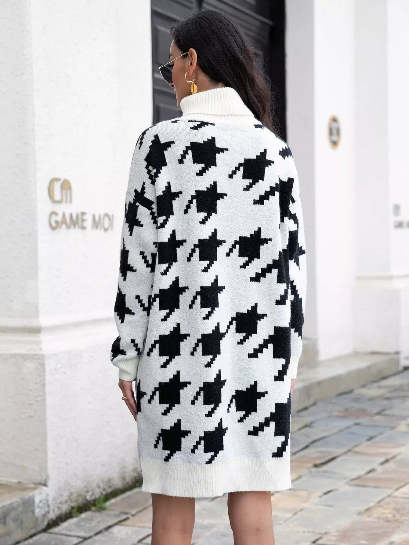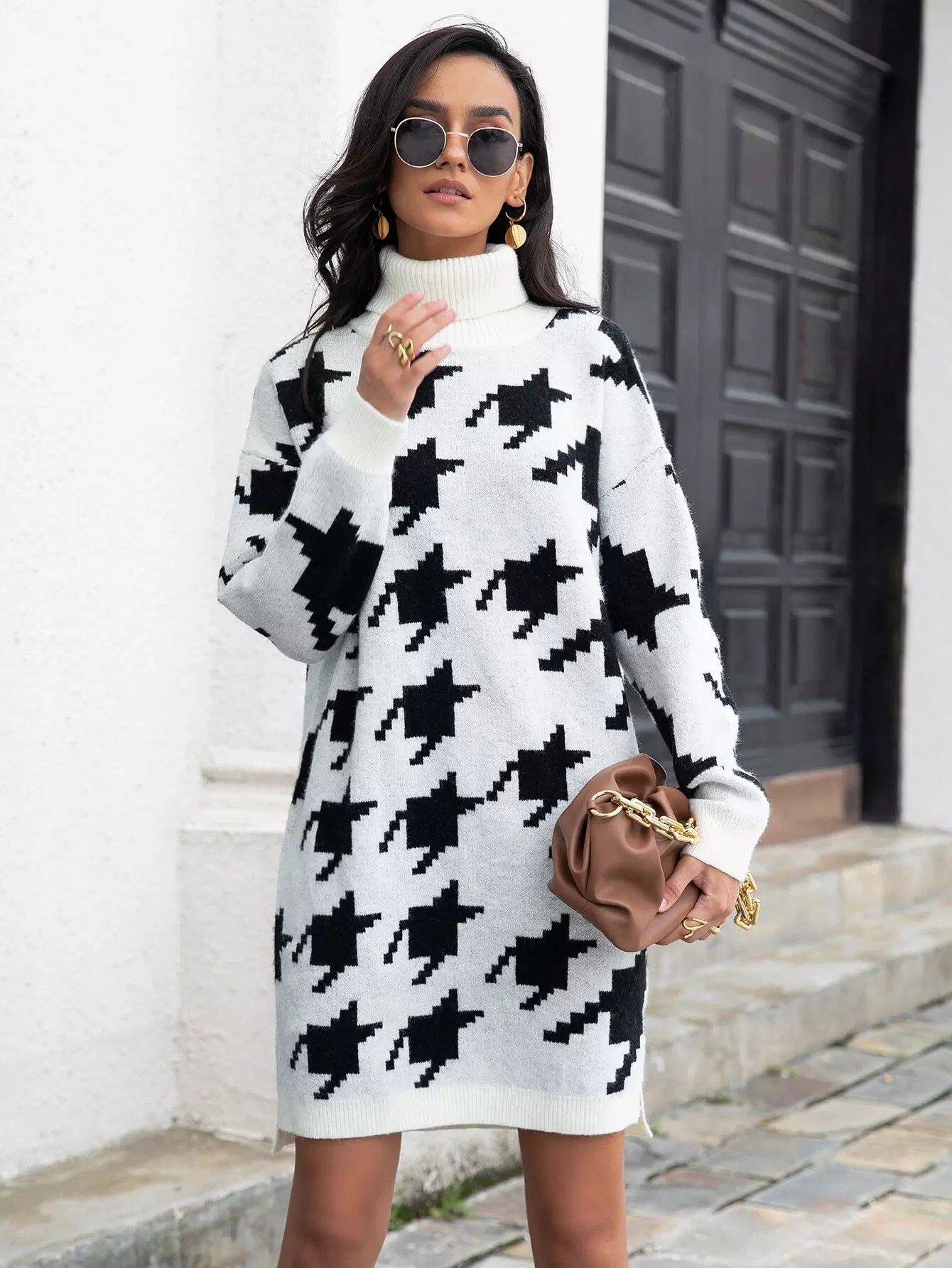 Turtleneck Houndstooth Pattern Drop Shoulder Sweater Dress