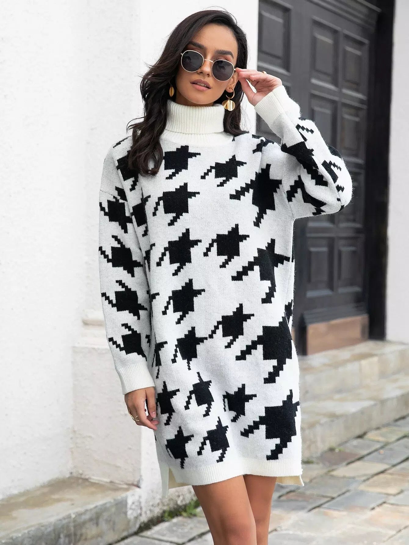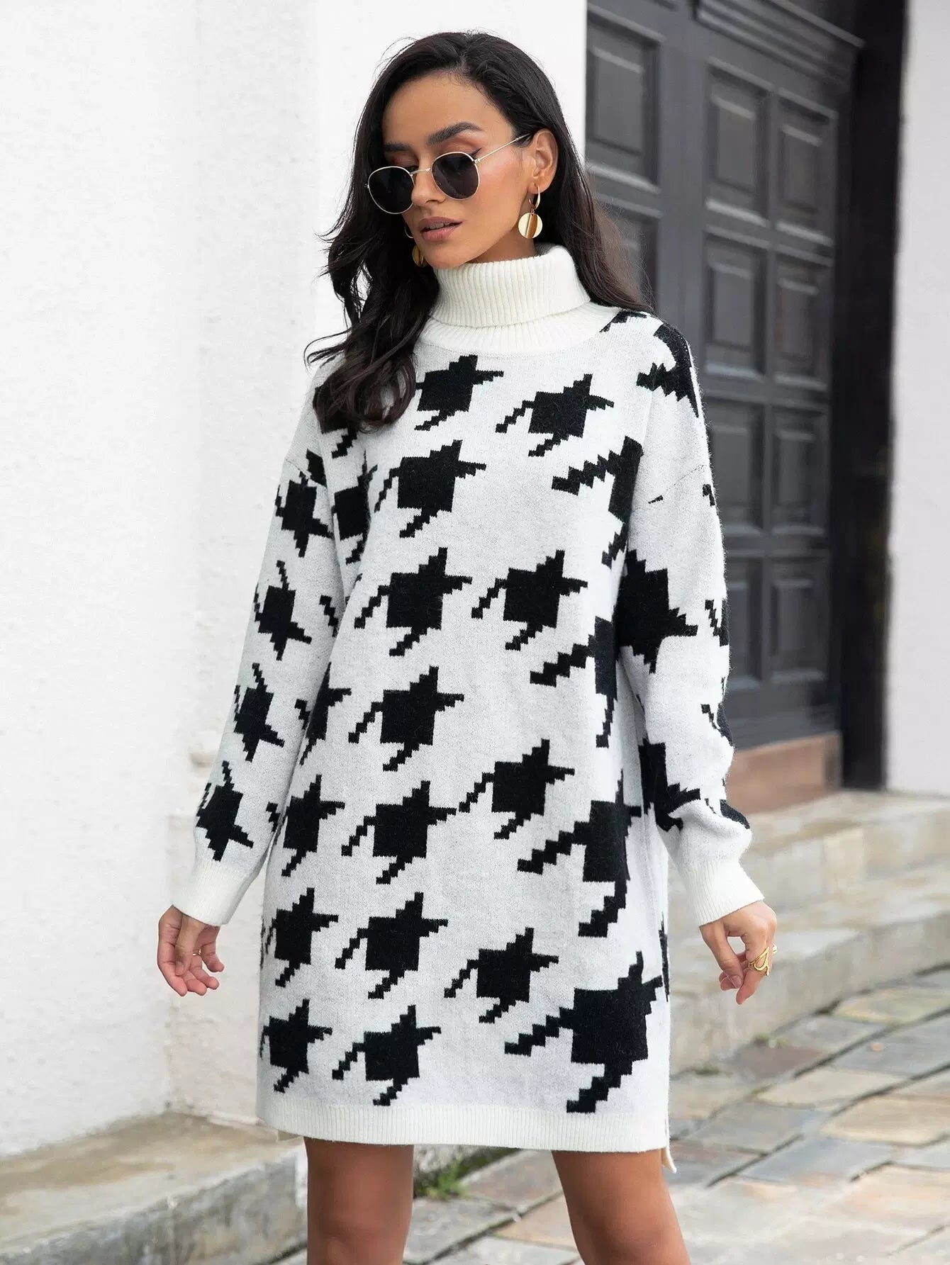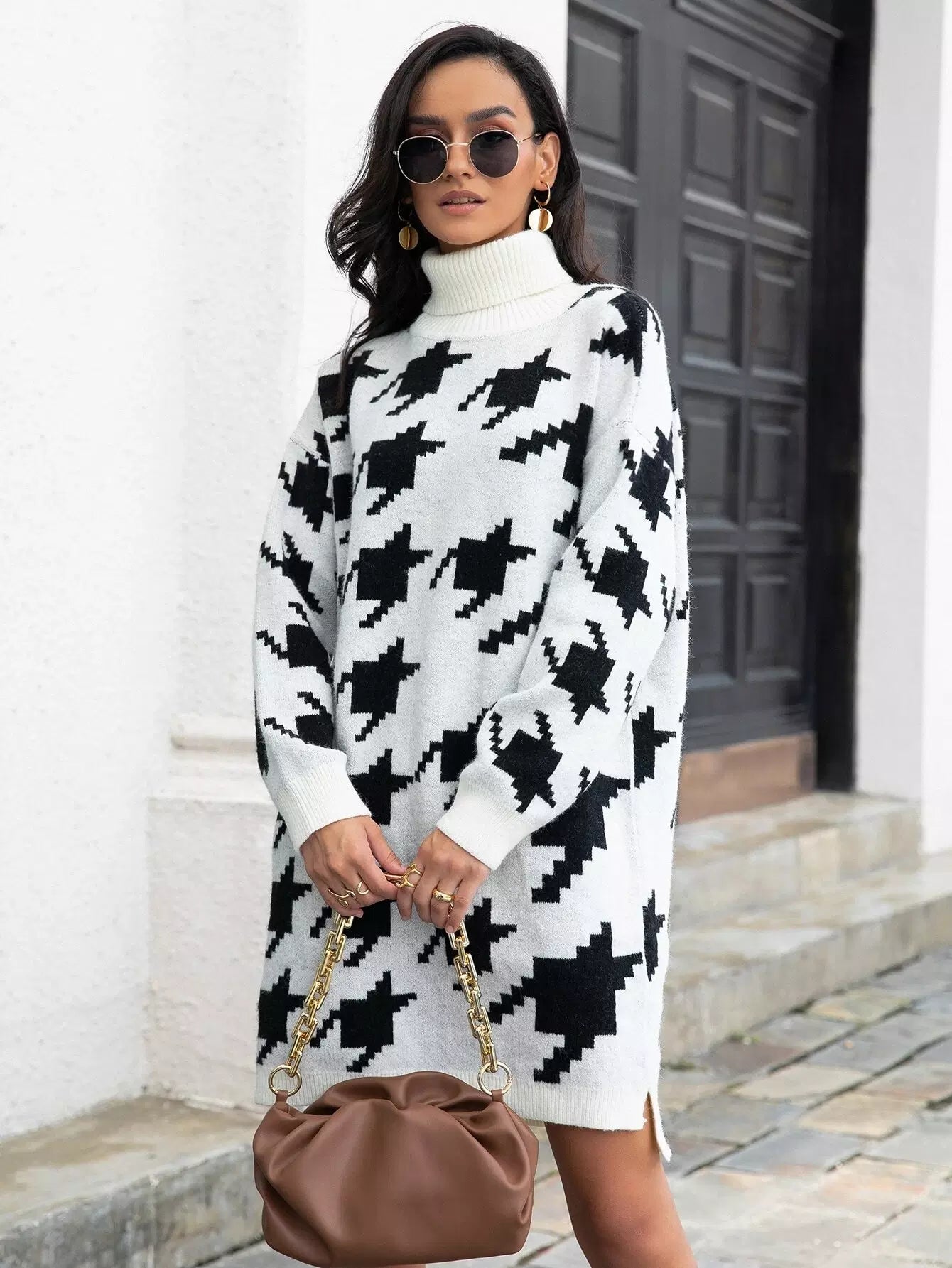 Turtleneck Houndstooth Pattern Drop Shoulder Sweater Dress