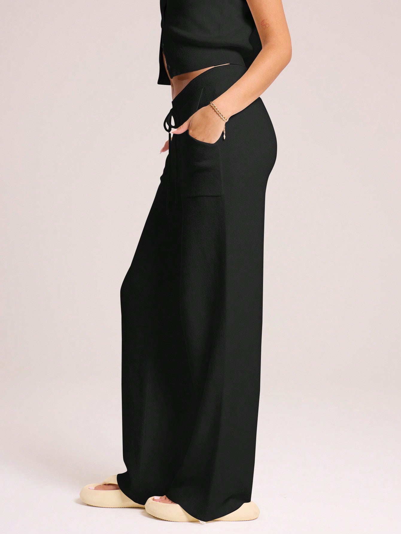 CasuGlow Knitted Large Pocket Detail Drawstring Waist Trousers Wide Leg Old Money