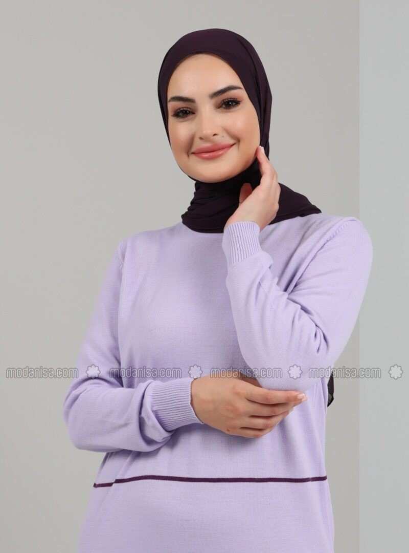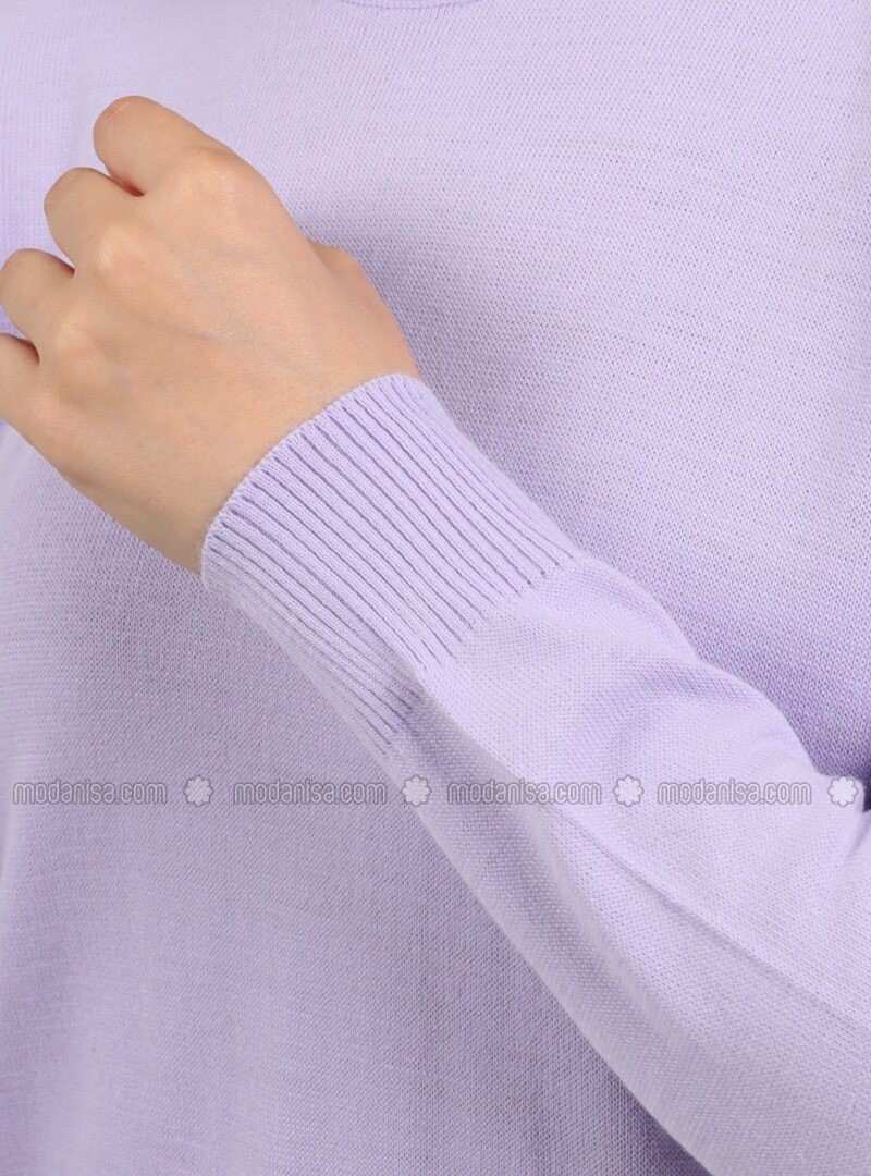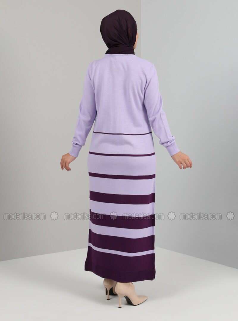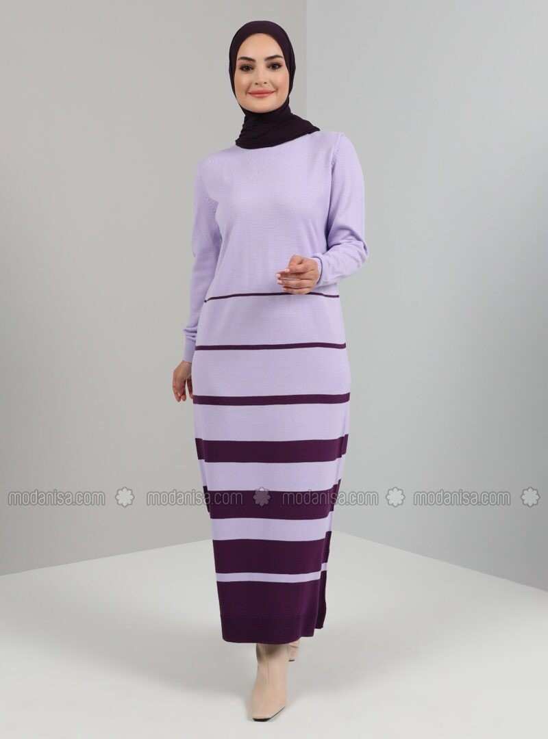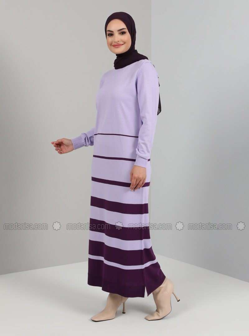 Crew Neck Line Detailed Knitwear Long Dress Lilac Tavin