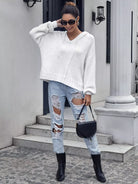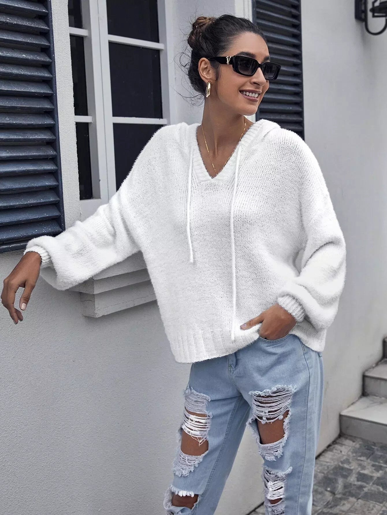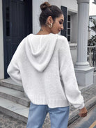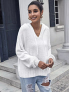 Women - Drop Shoulder Fuzzy Knit Drawstring Hooded Sweater