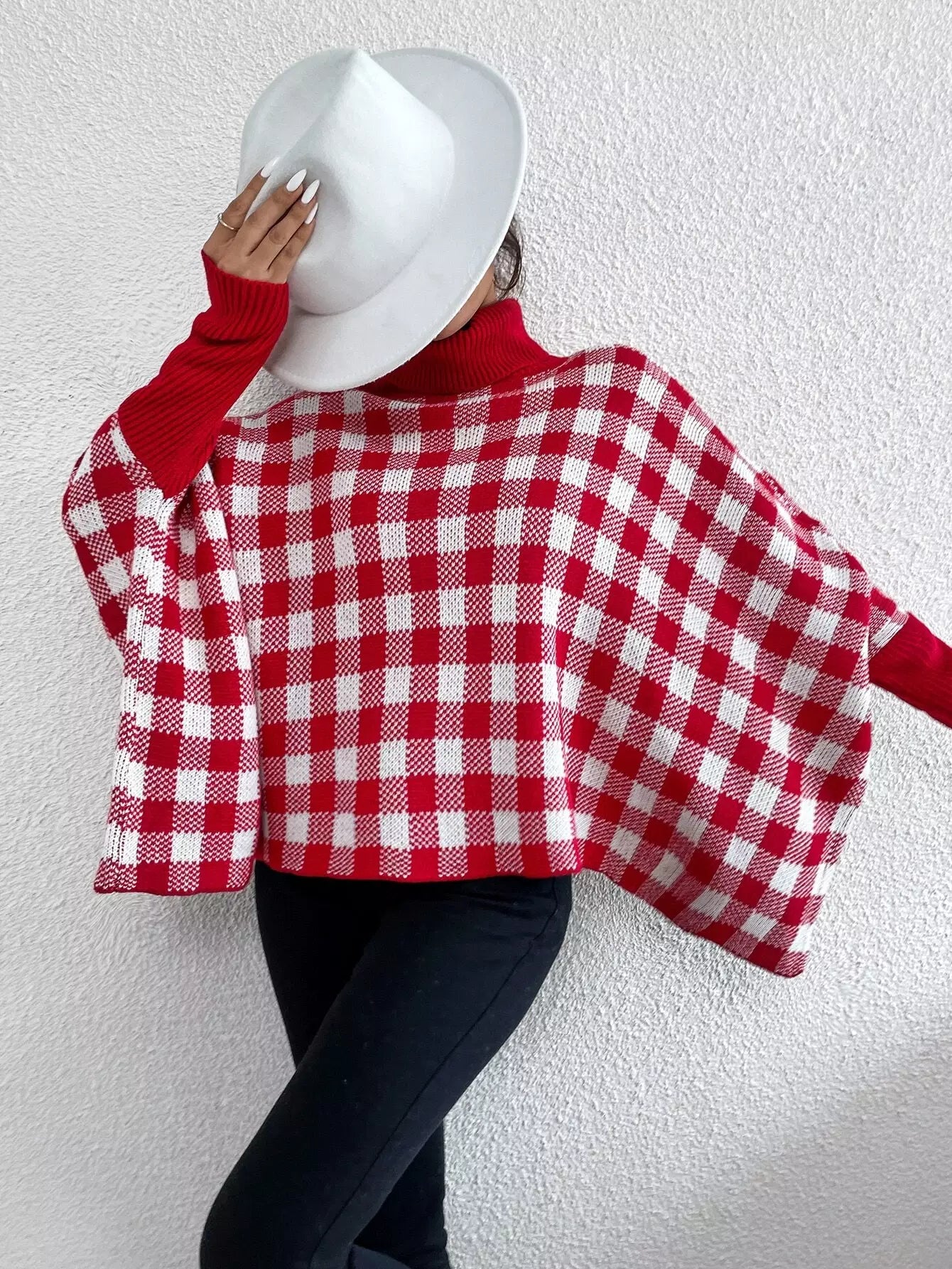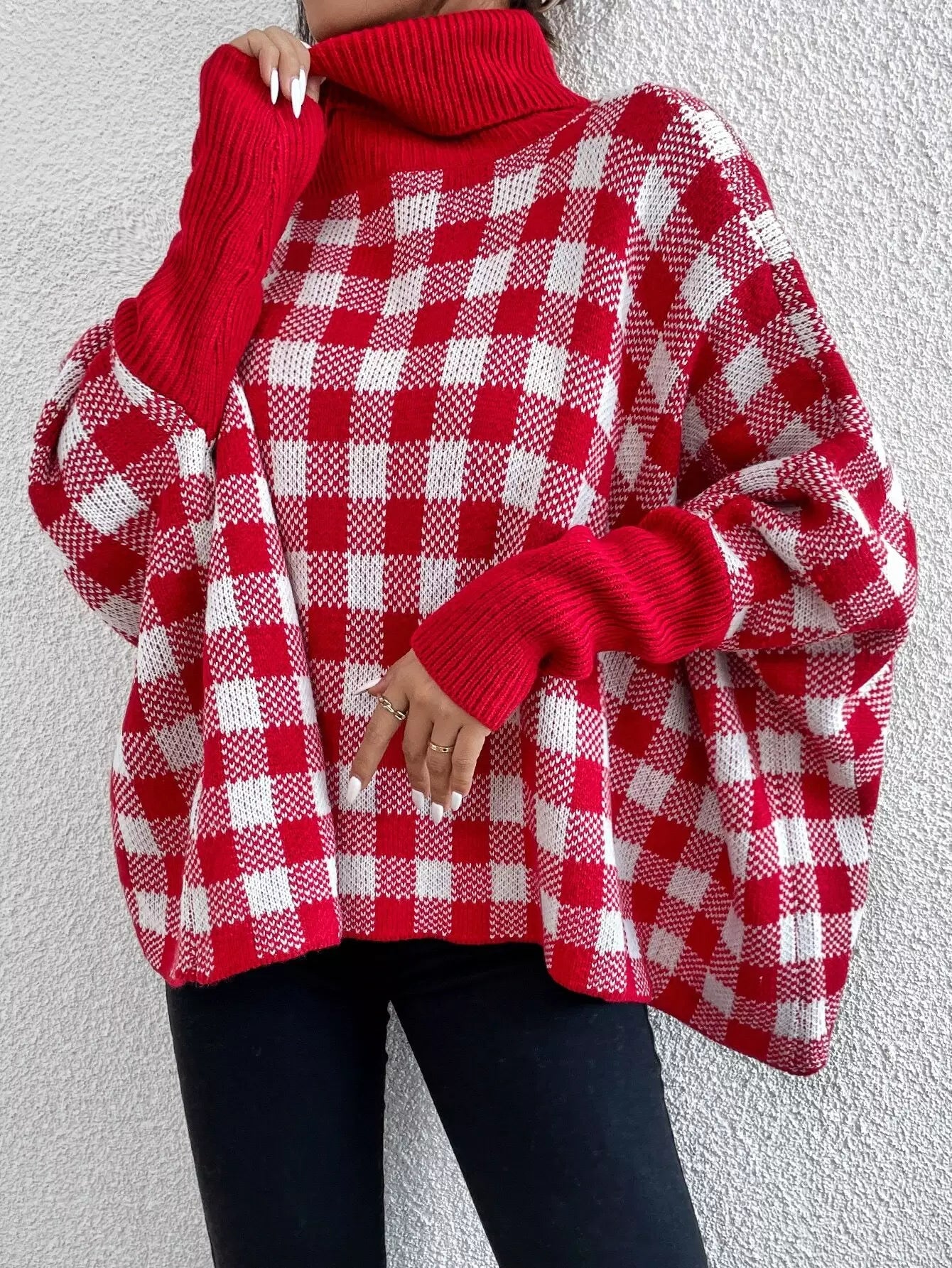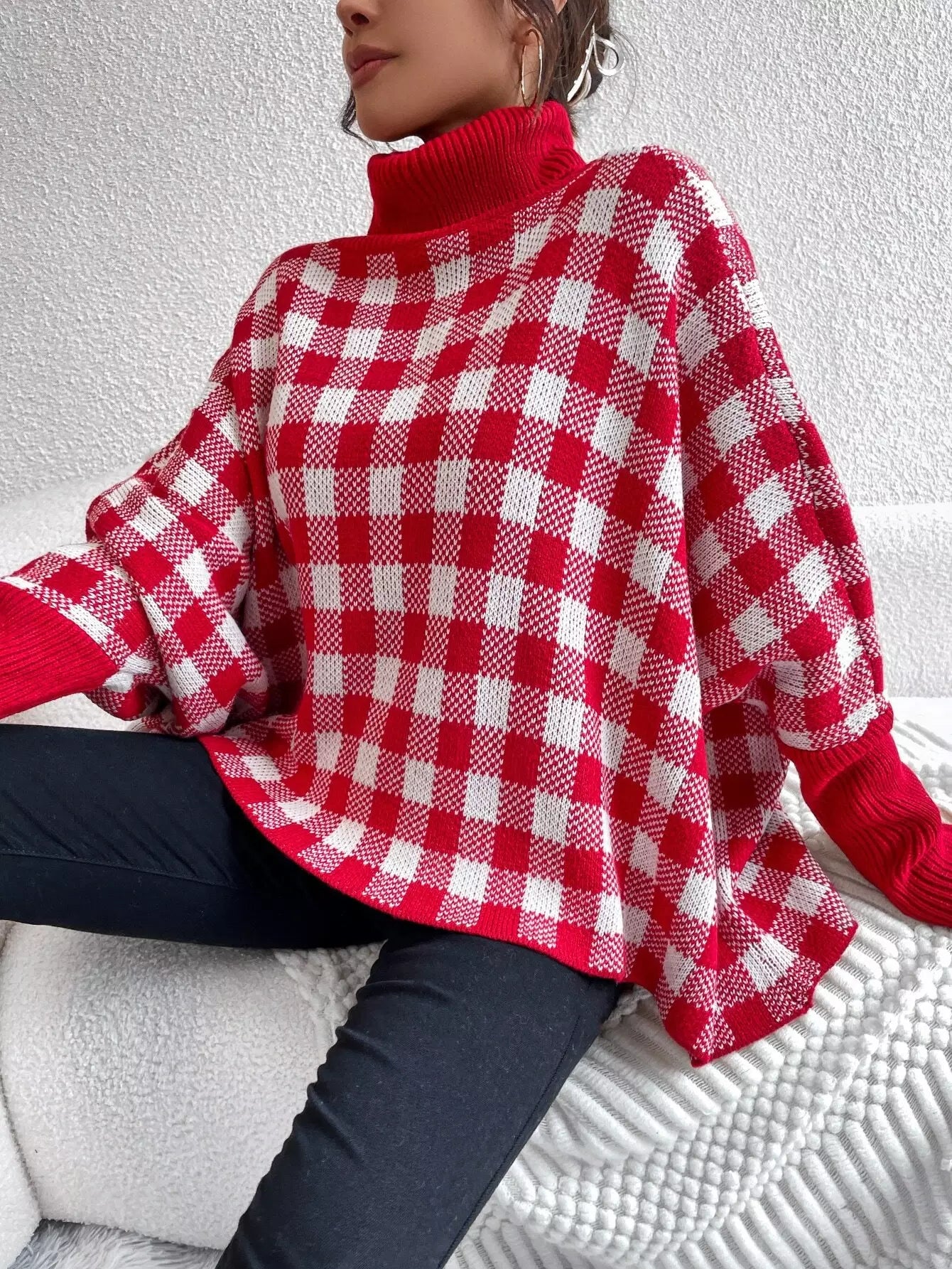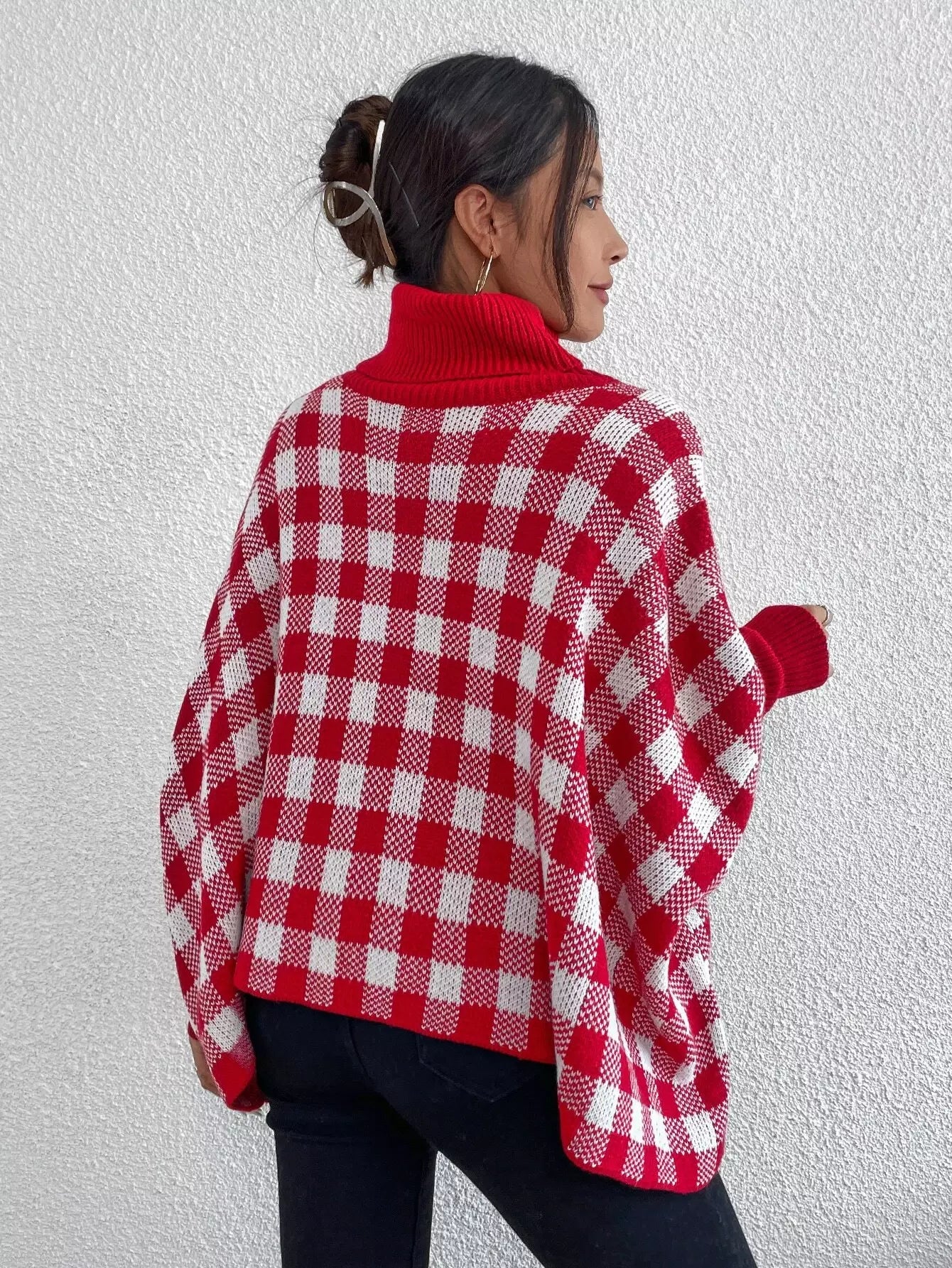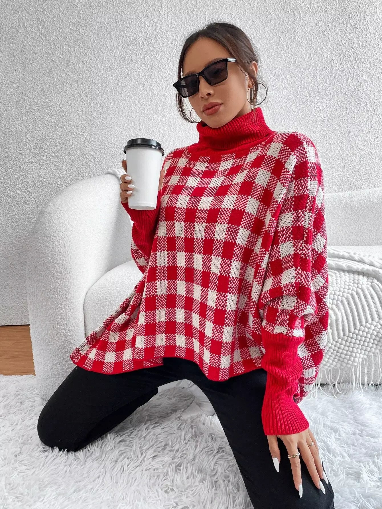 Gingham Pattern High Neck Batwing Sleeve Sweater