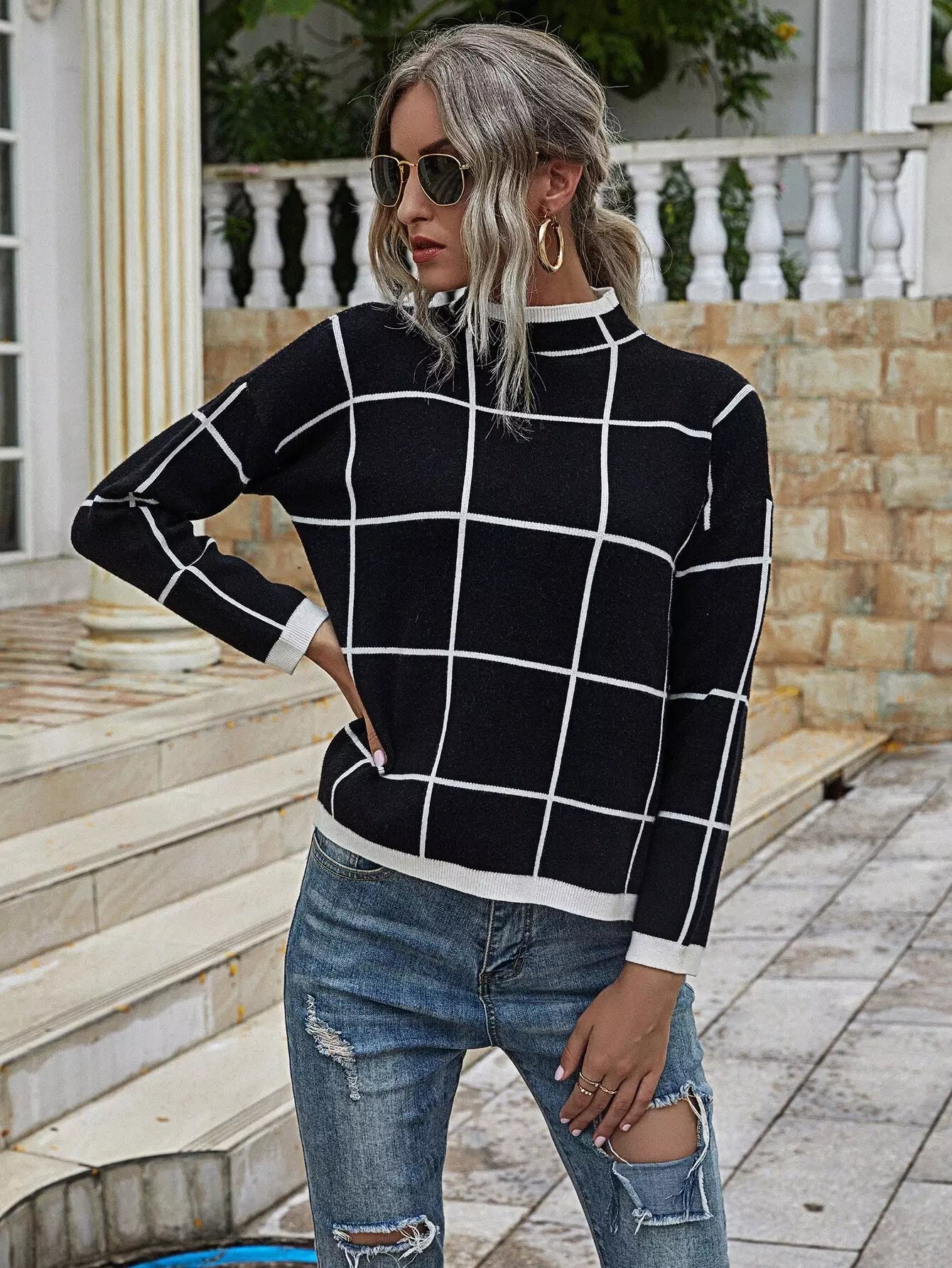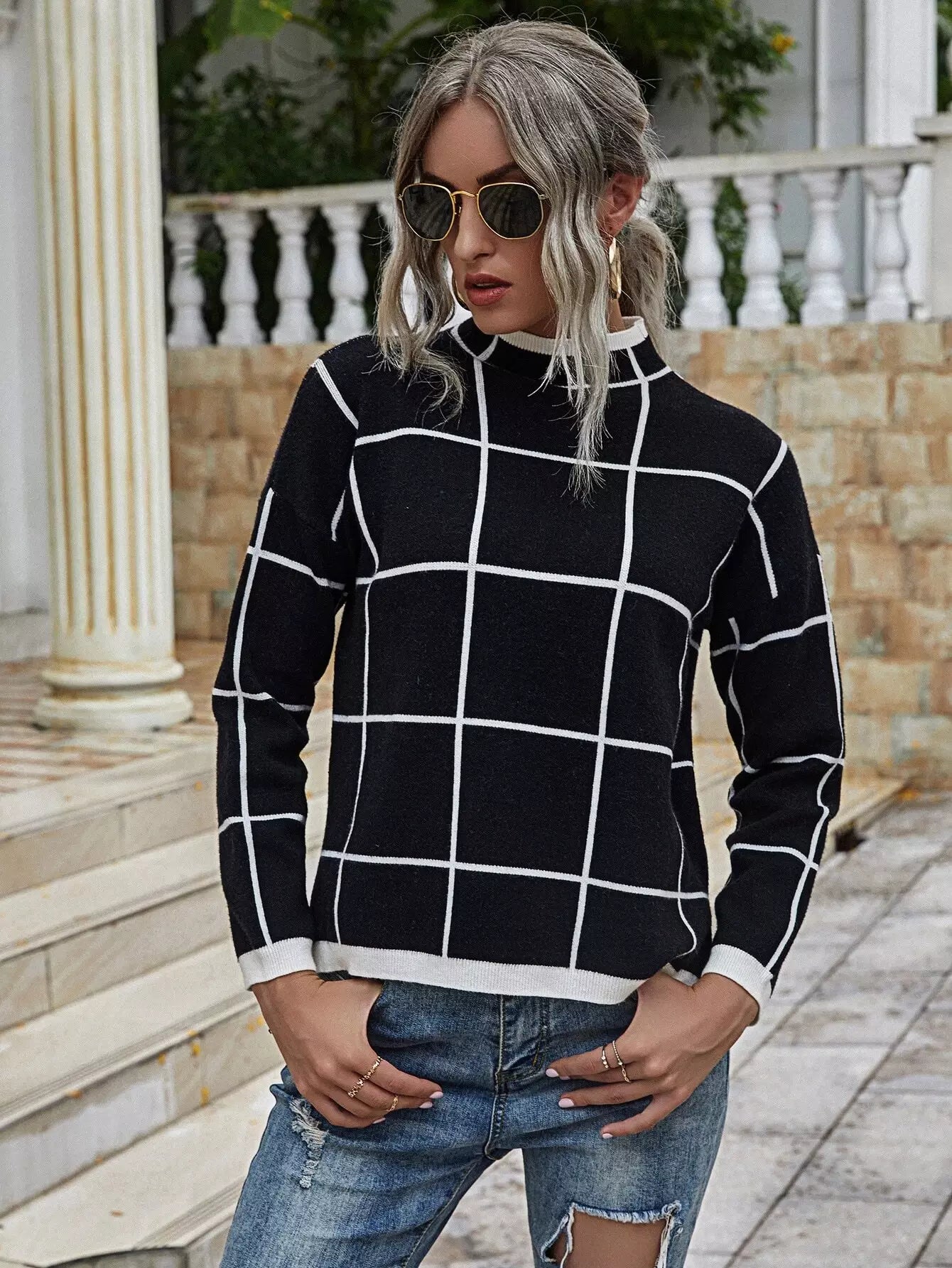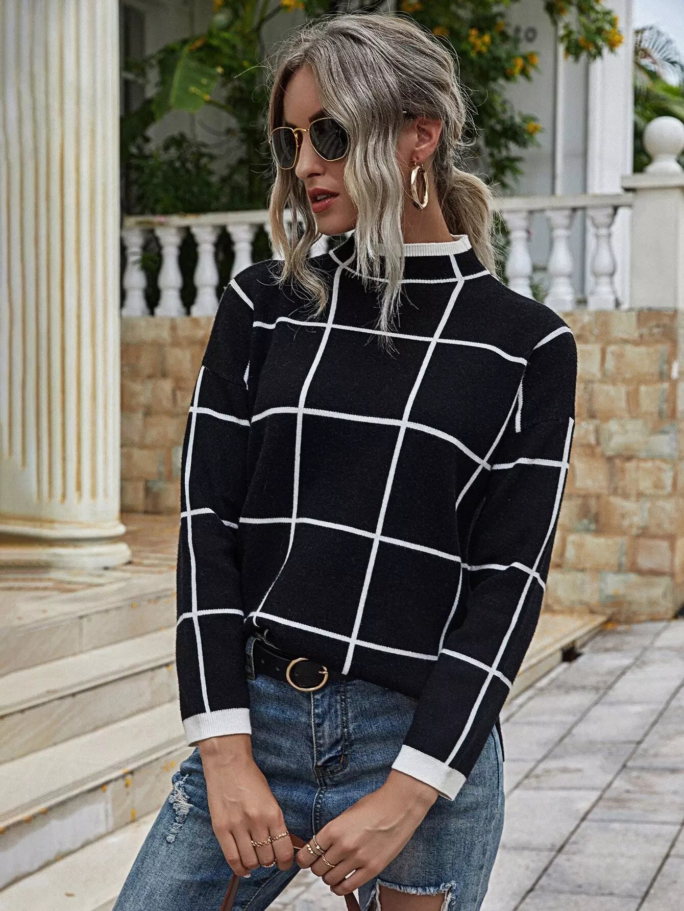 Women - Grid Mock Neck Drop Shoulder Sweater