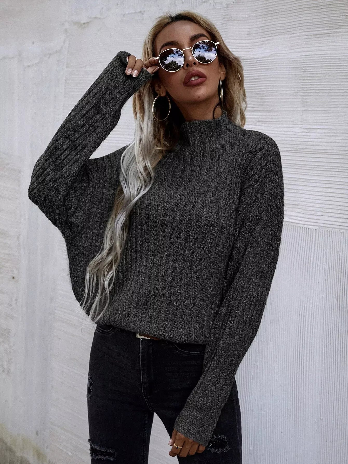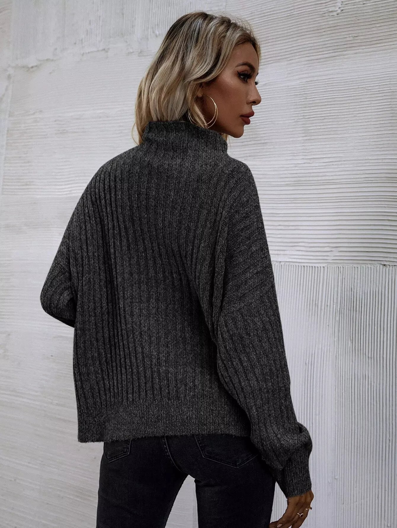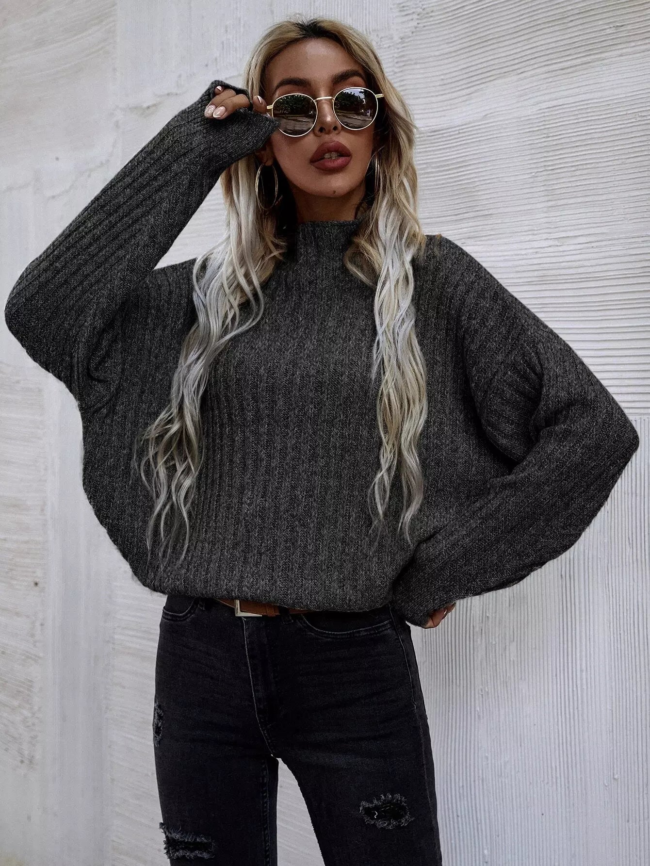 Mock Neck Batwing Sleeve Rib-knit Sweater
