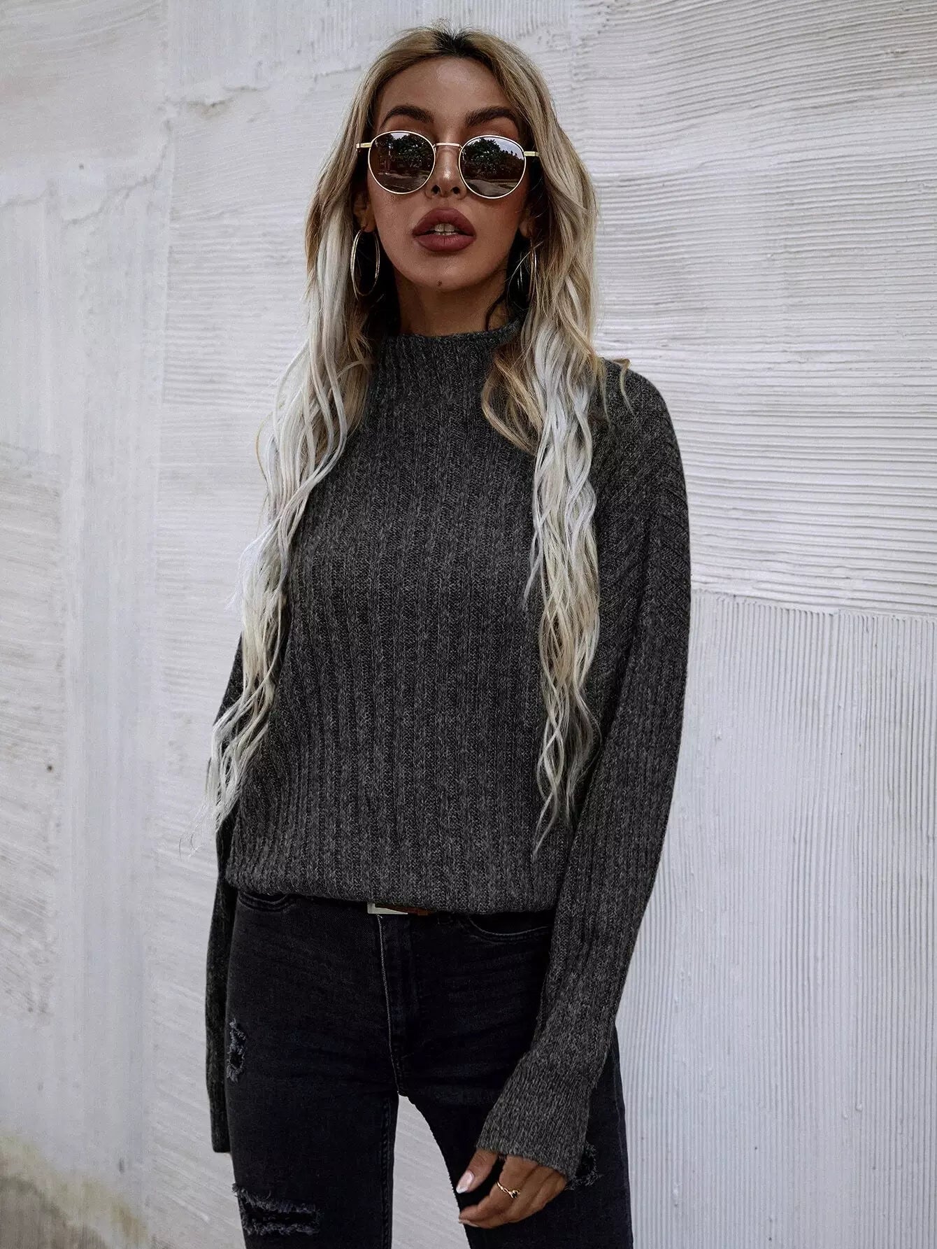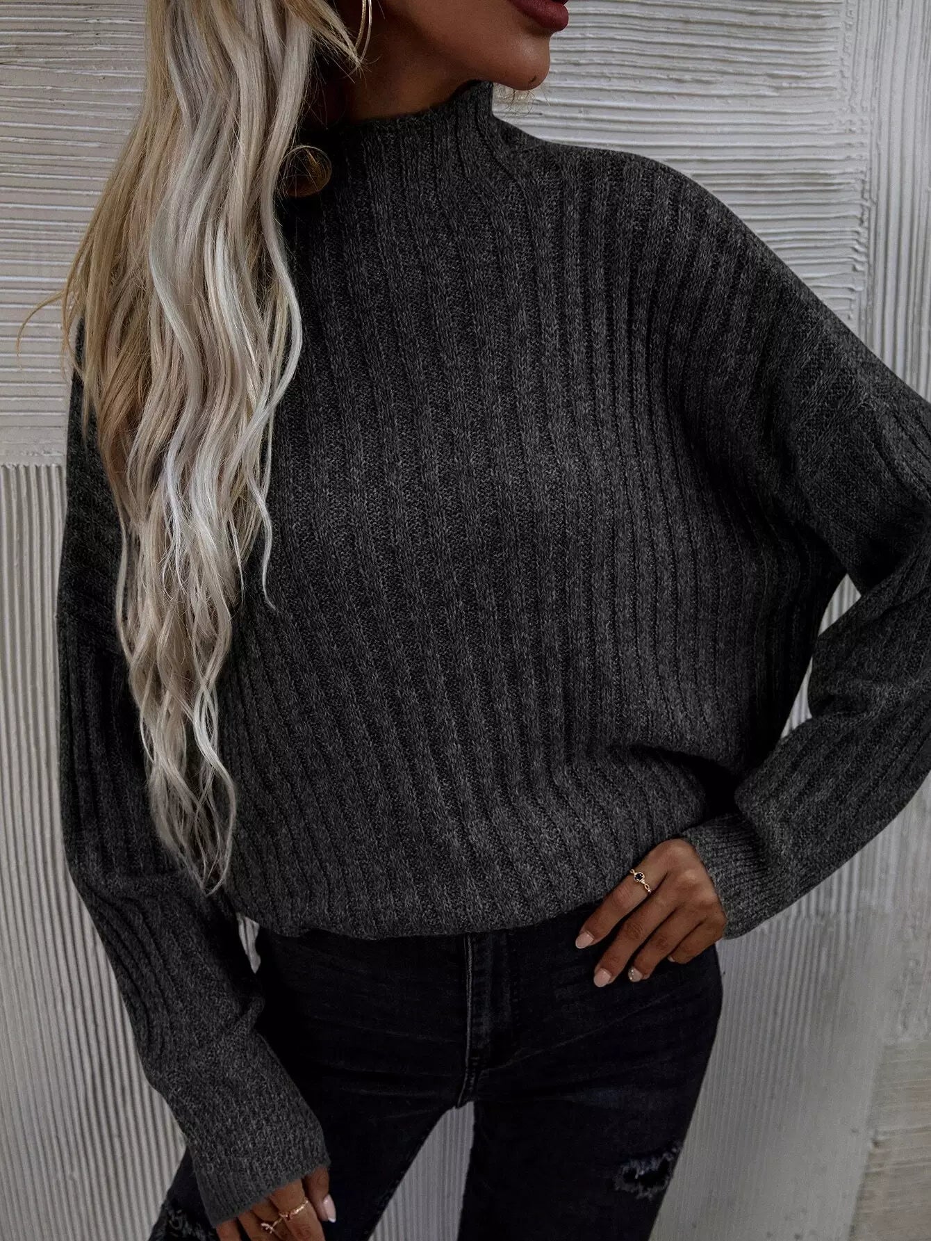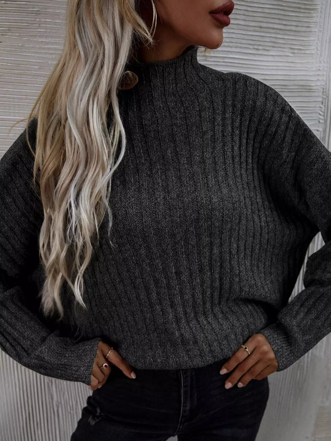 Mock Neck Batwing Sleeve Rib-knit Sweater