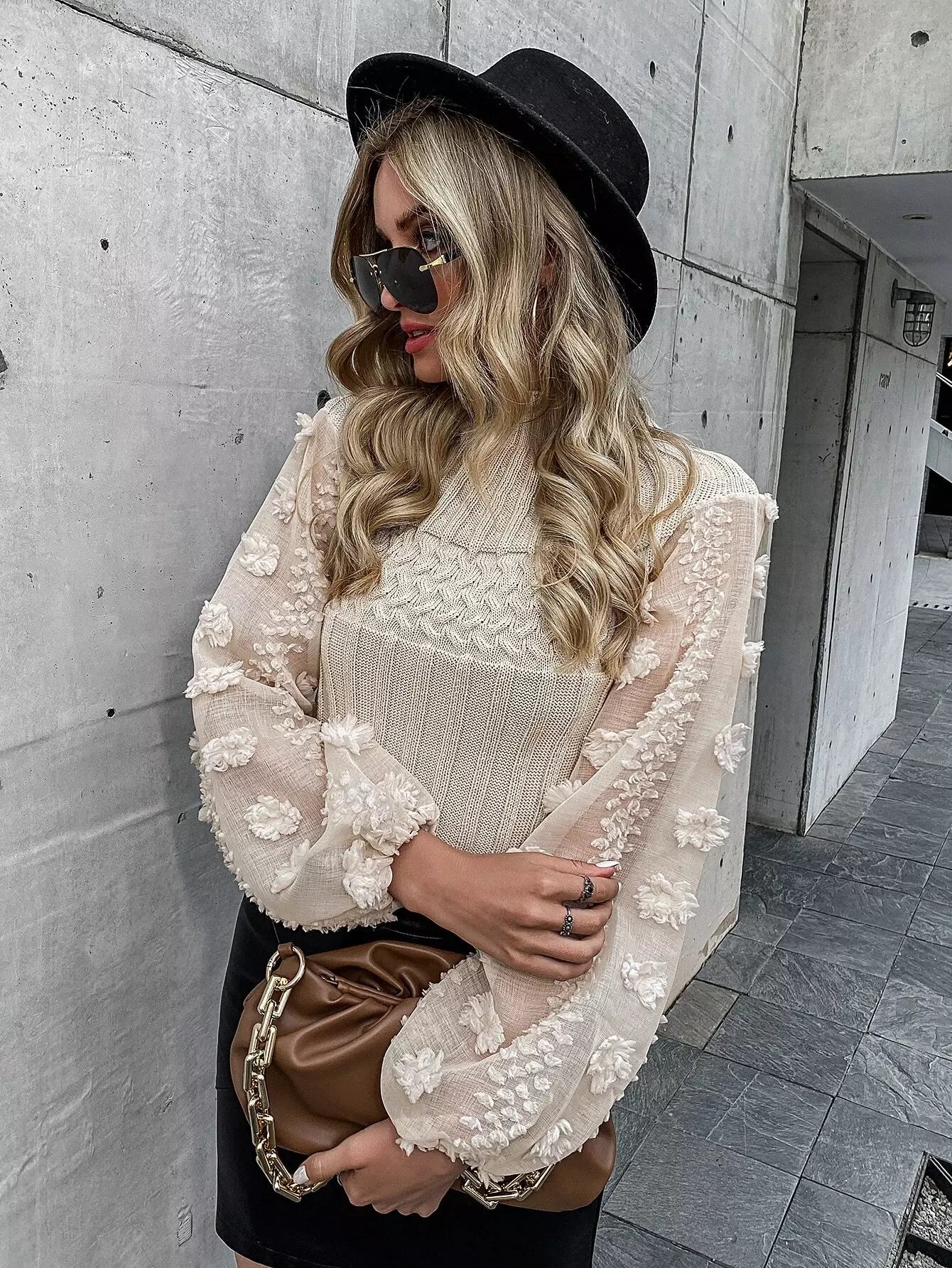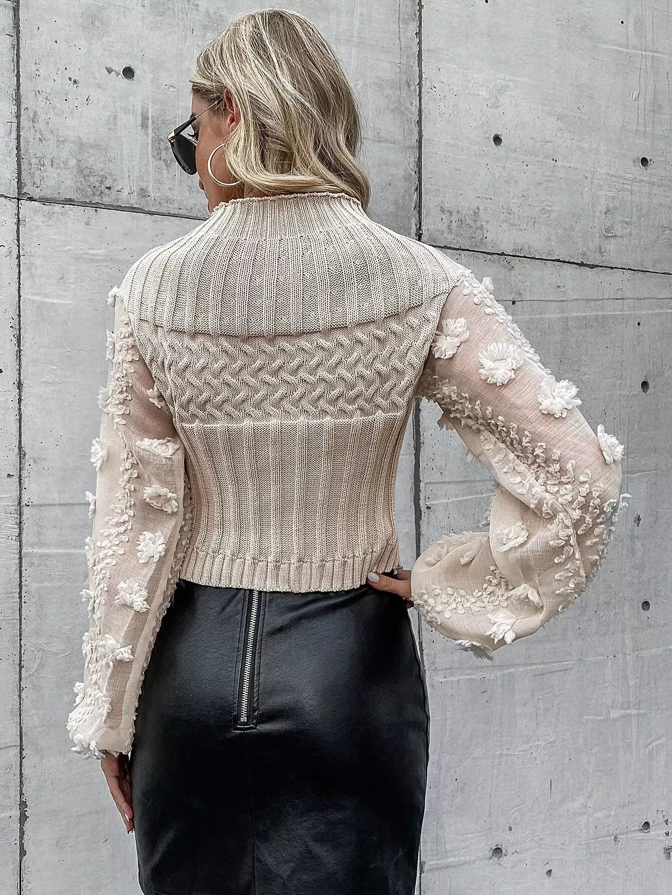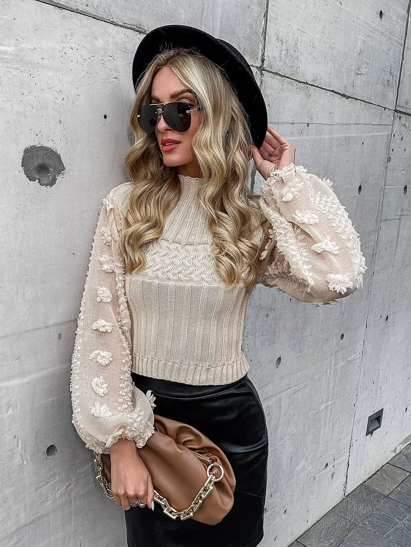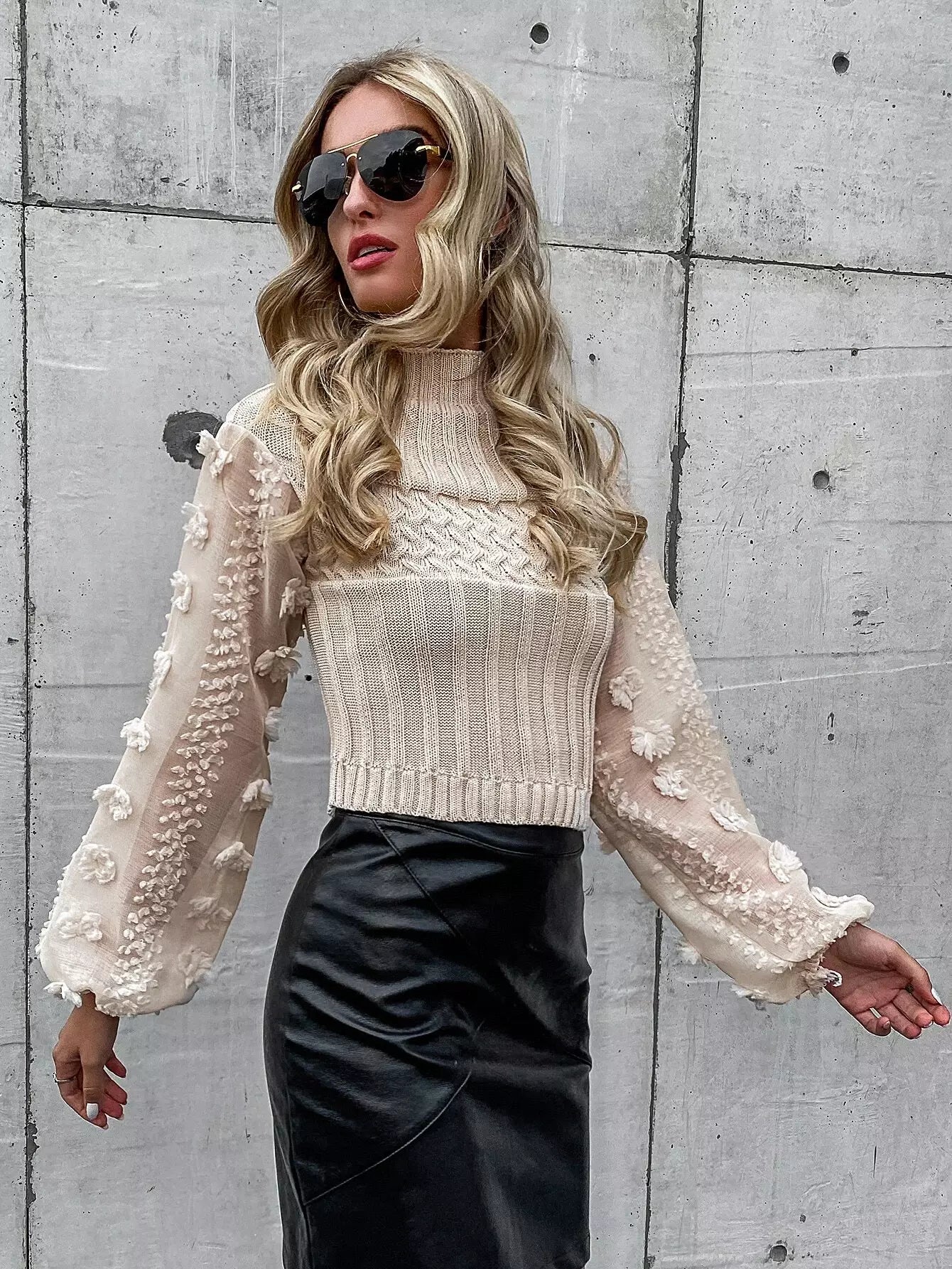 Mock Neck Contrast Swiss Dot Bishop Sleeve Sweater
