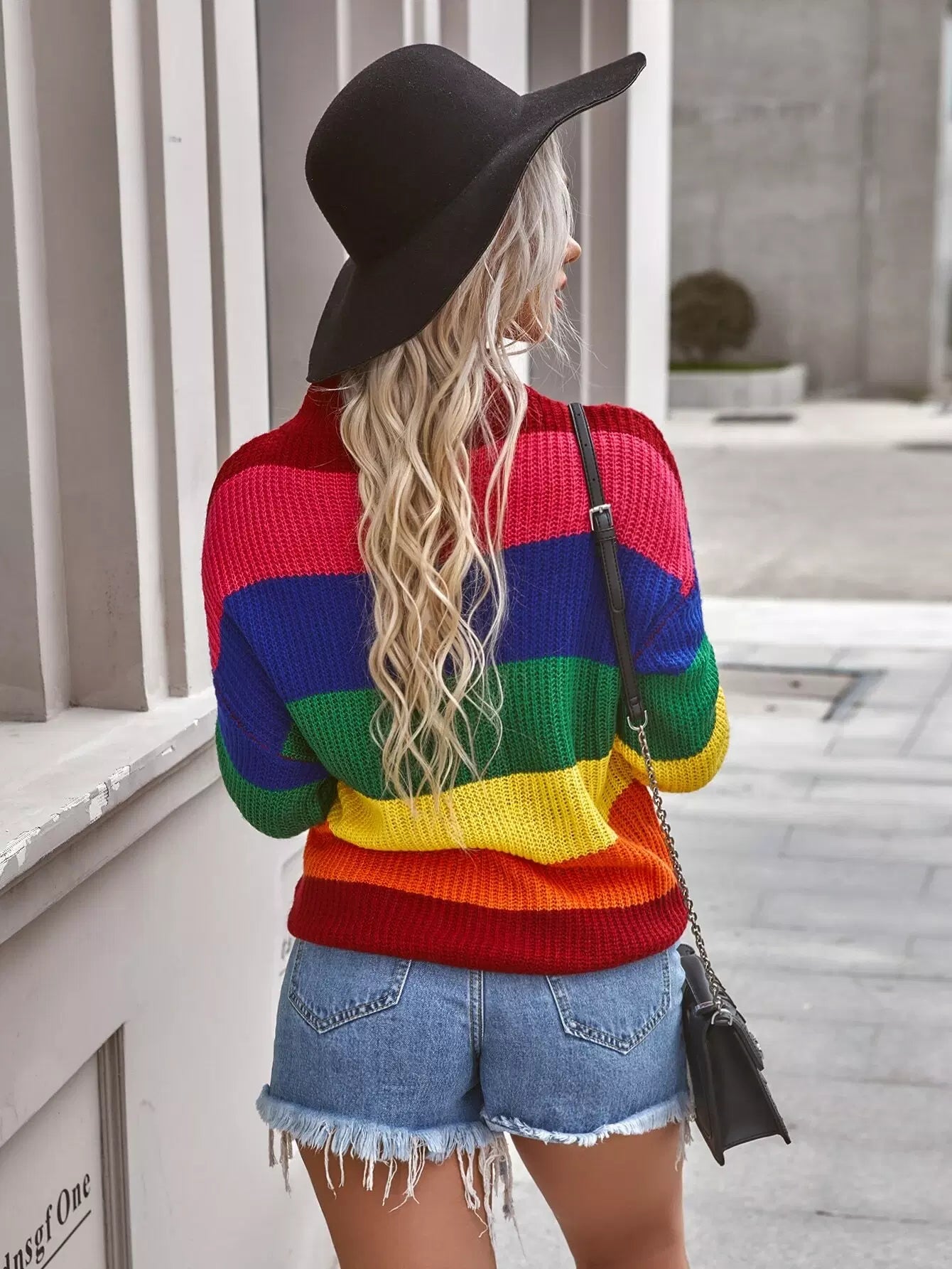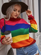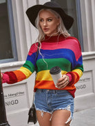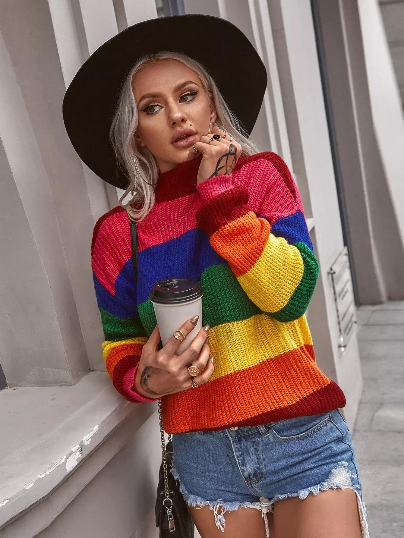 Rainbow Striped Mock Neck Ribbed Knit Sweater