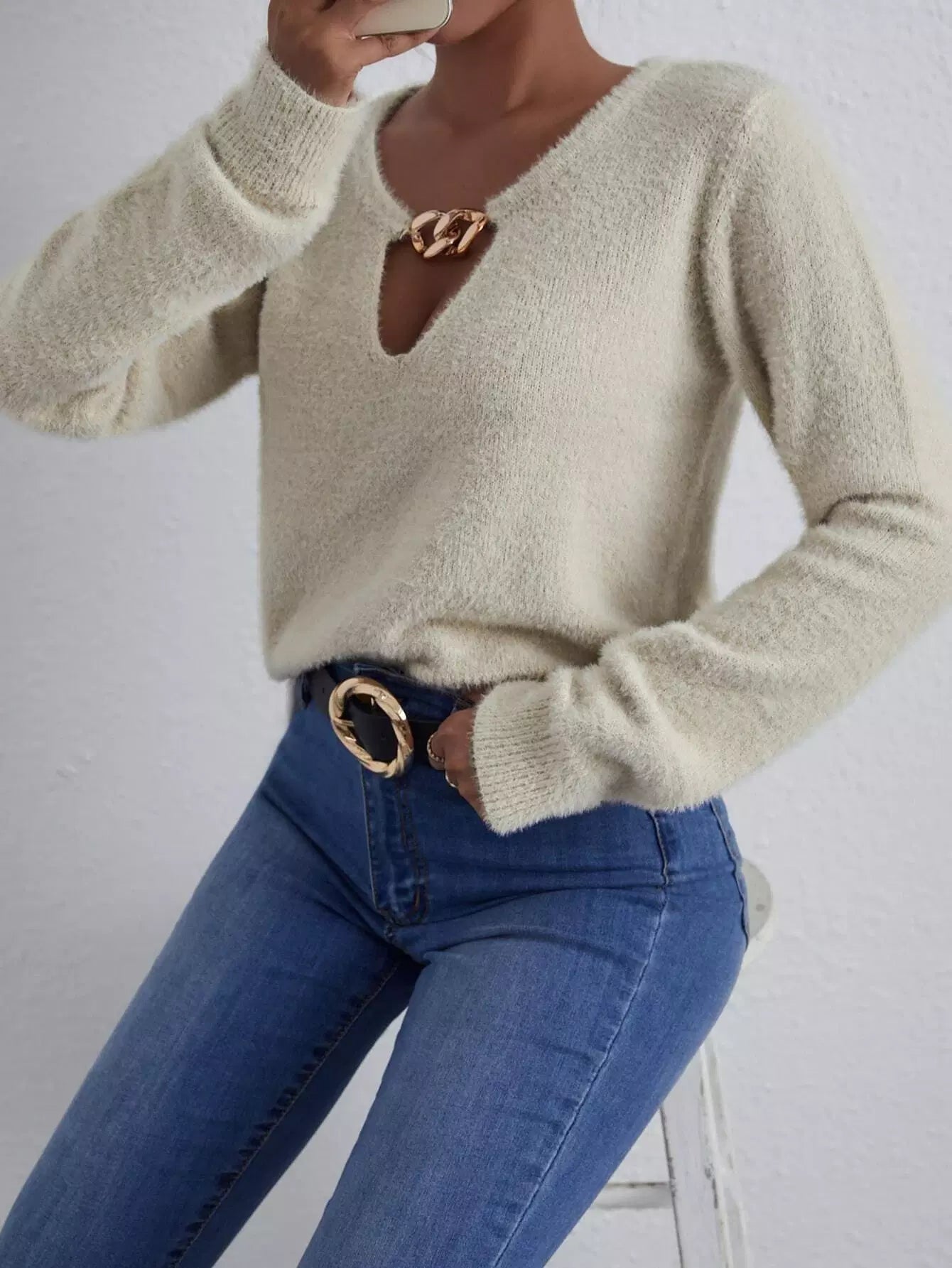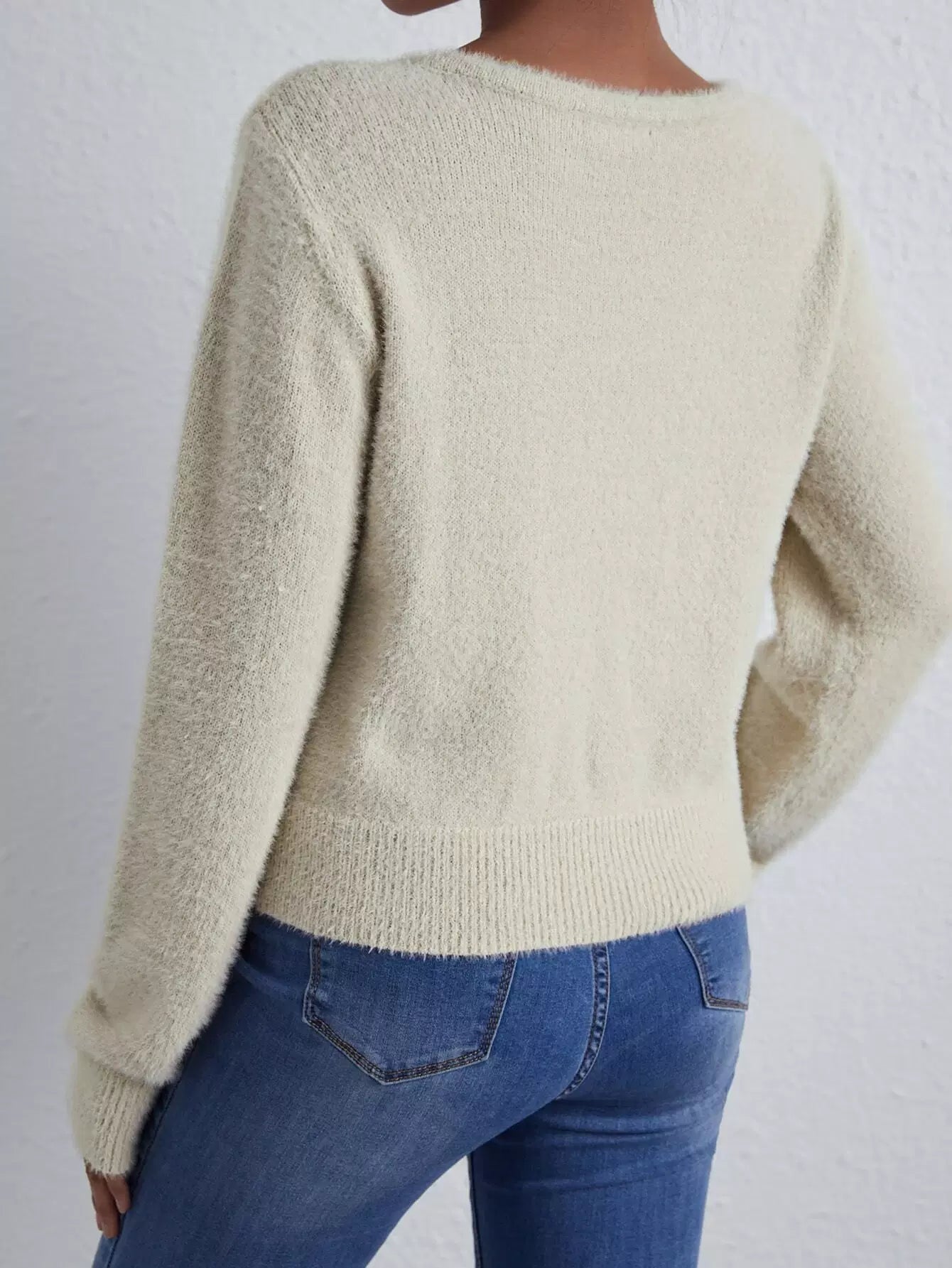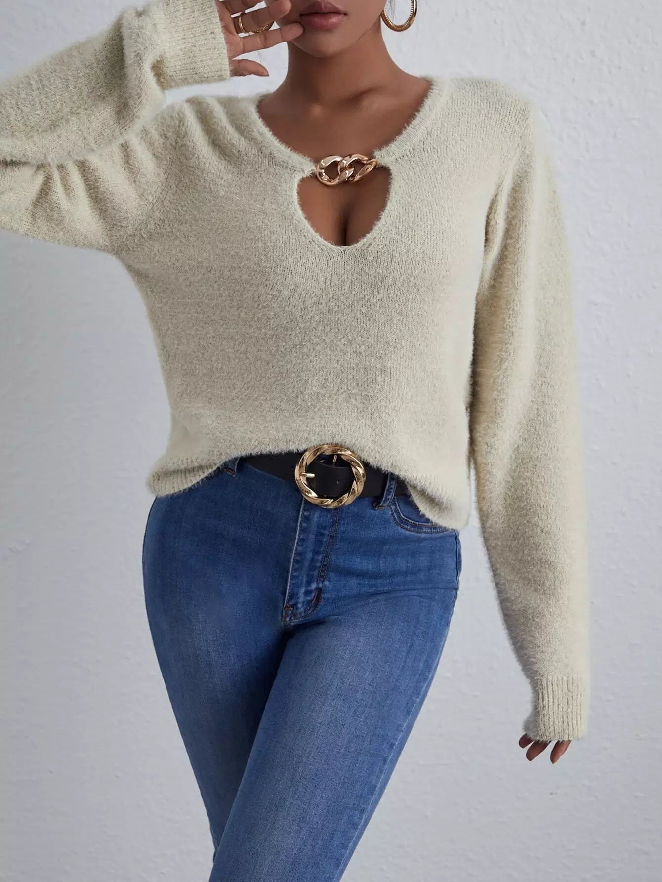 Women - Solid Keyhole Neckline Fuzzy Sweater