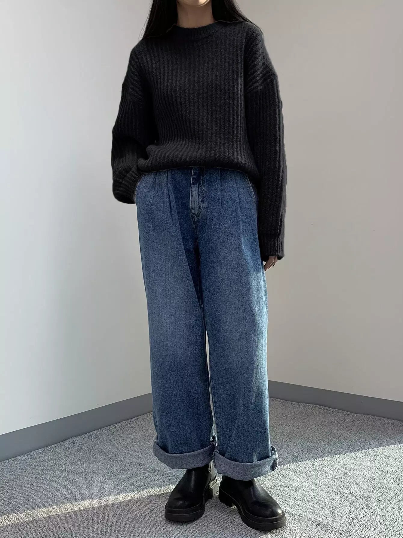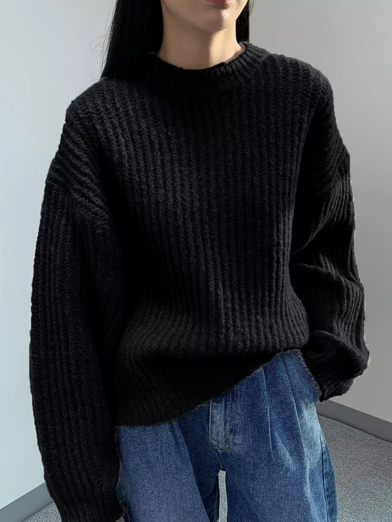 Solid Round Neck Drop Shoulder Sweater