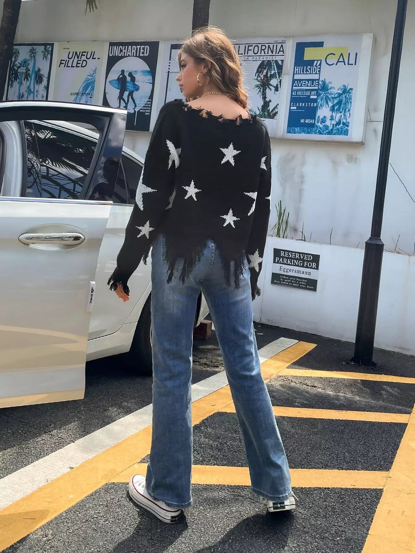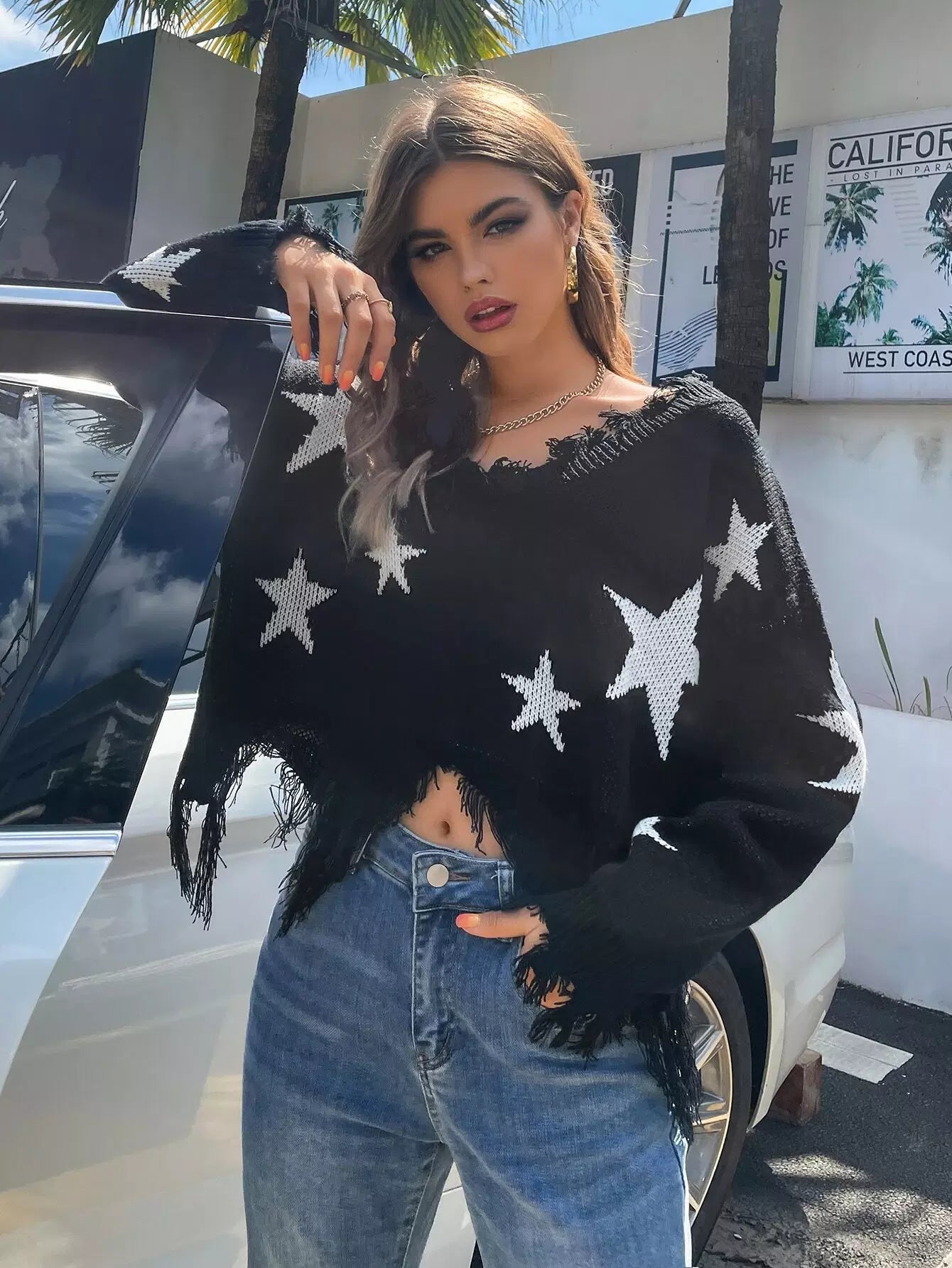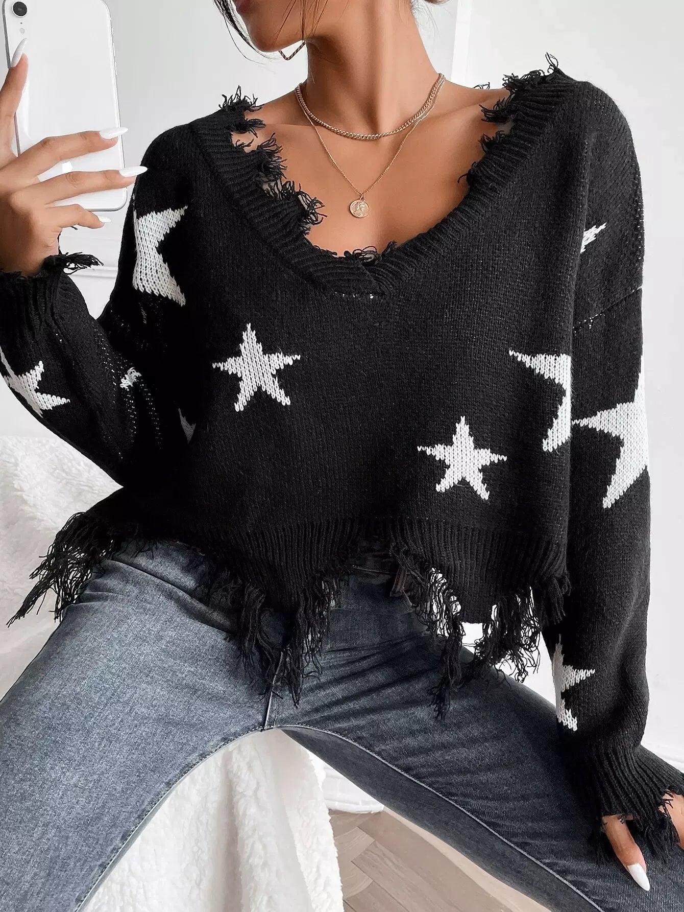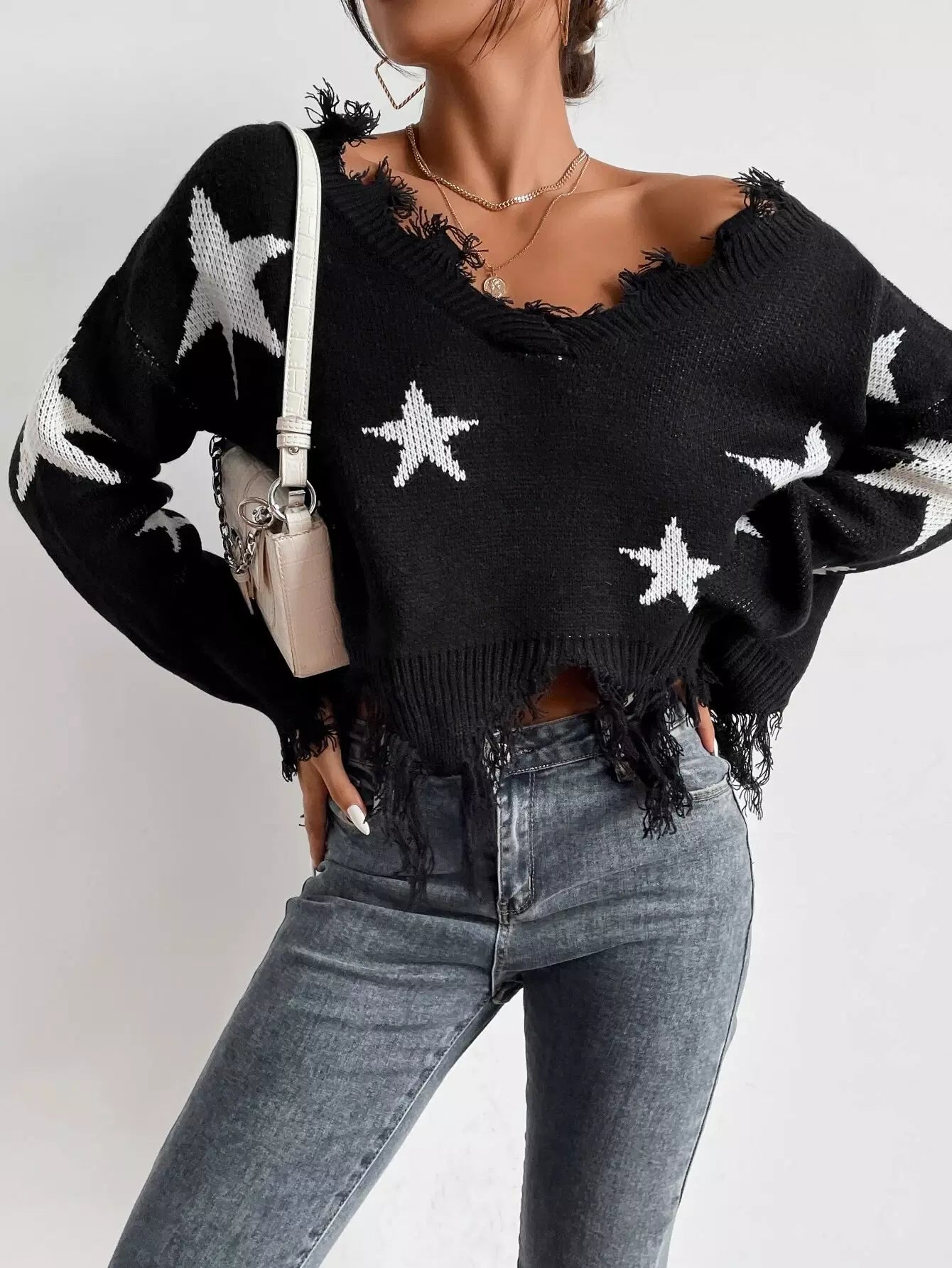 Star Pattern Raw Hem Sweater