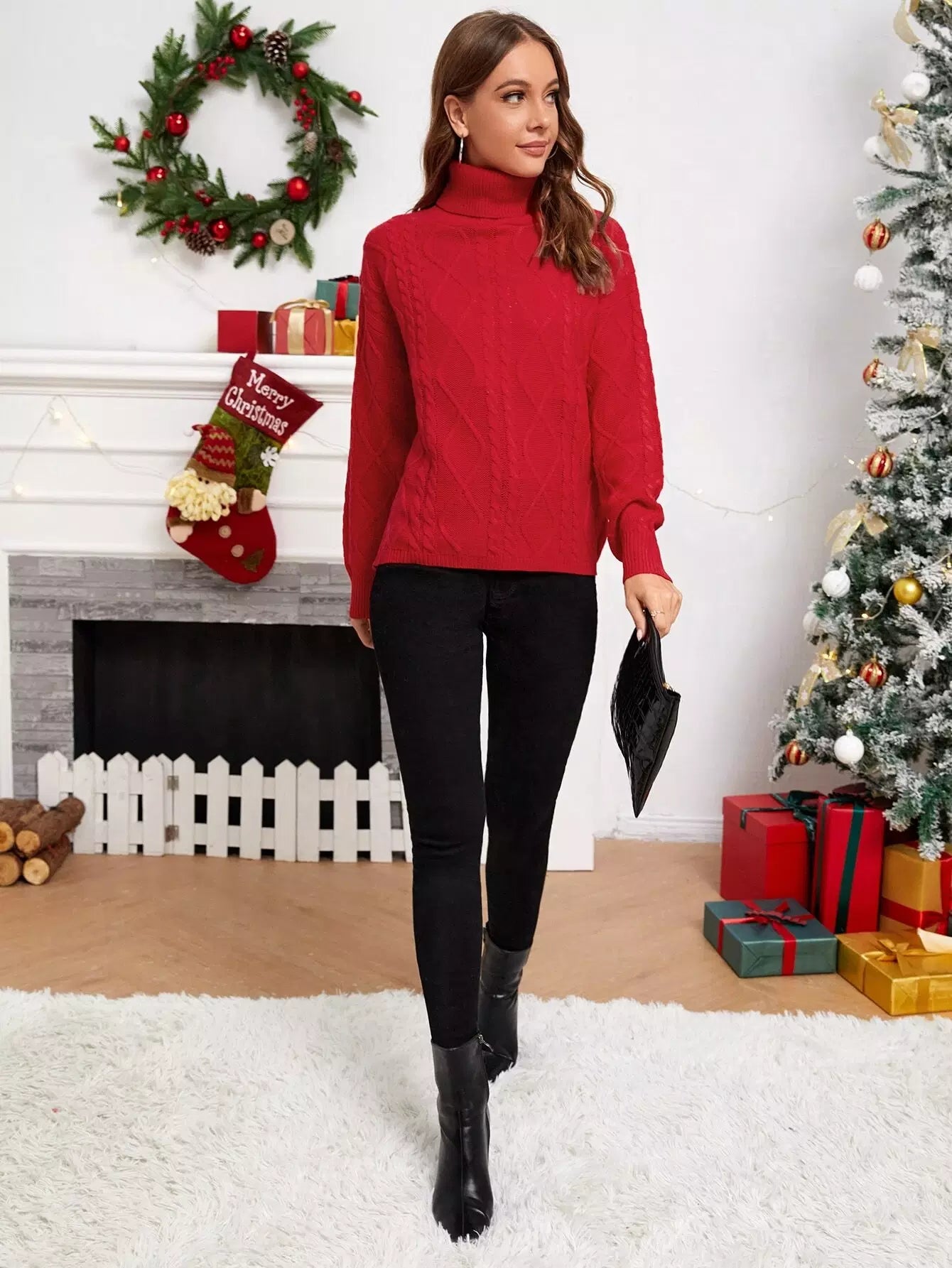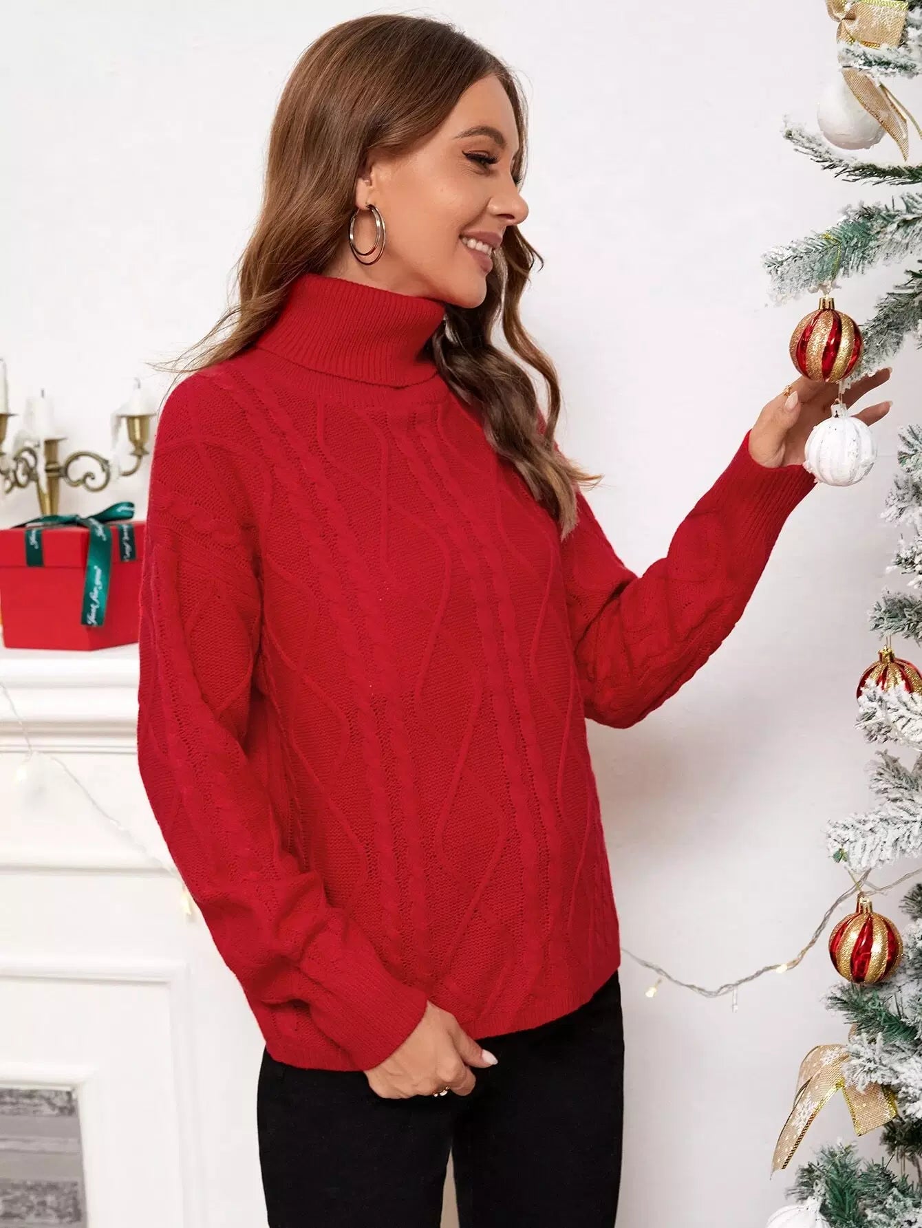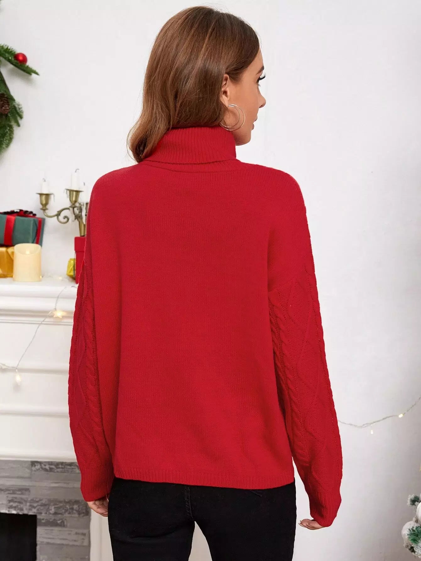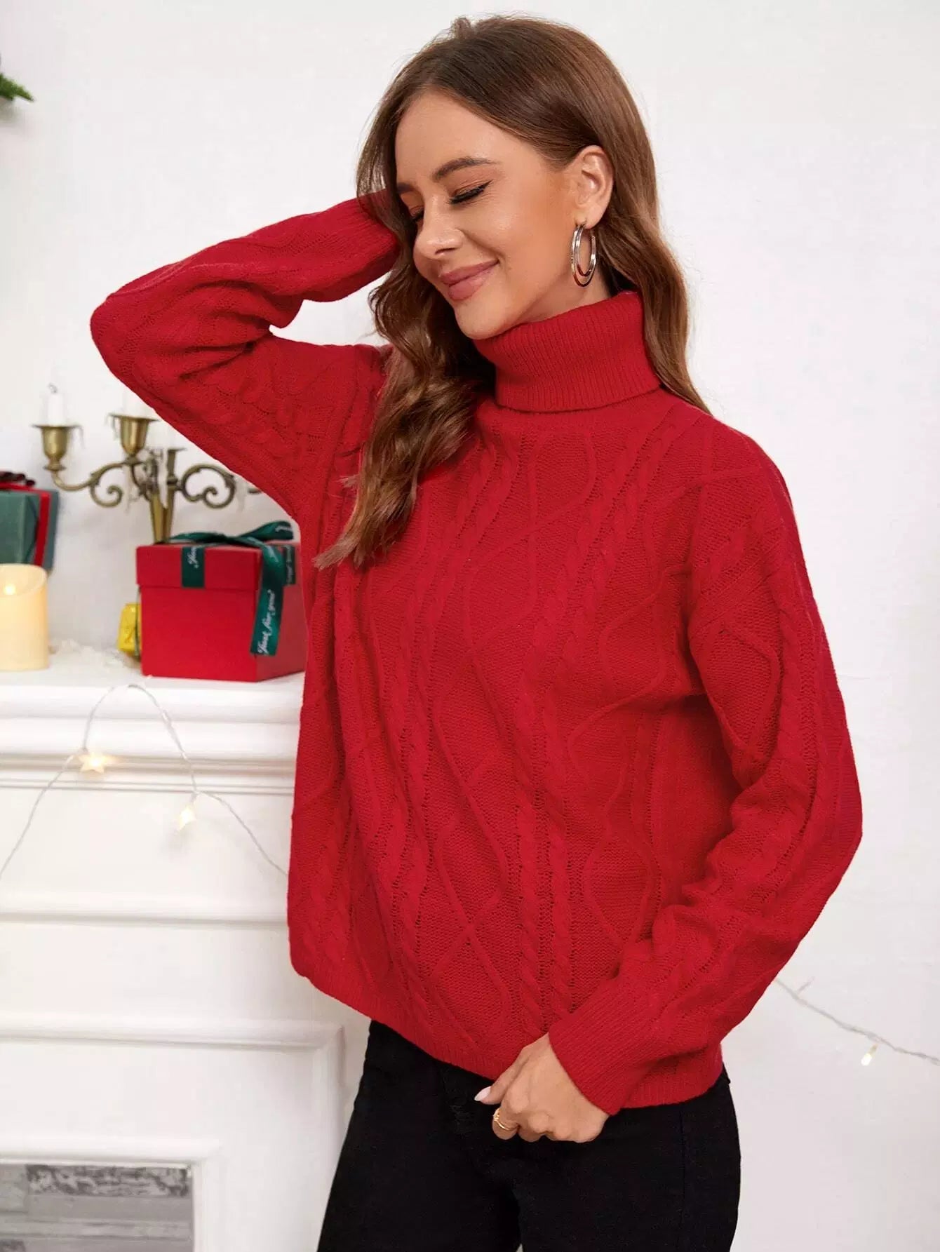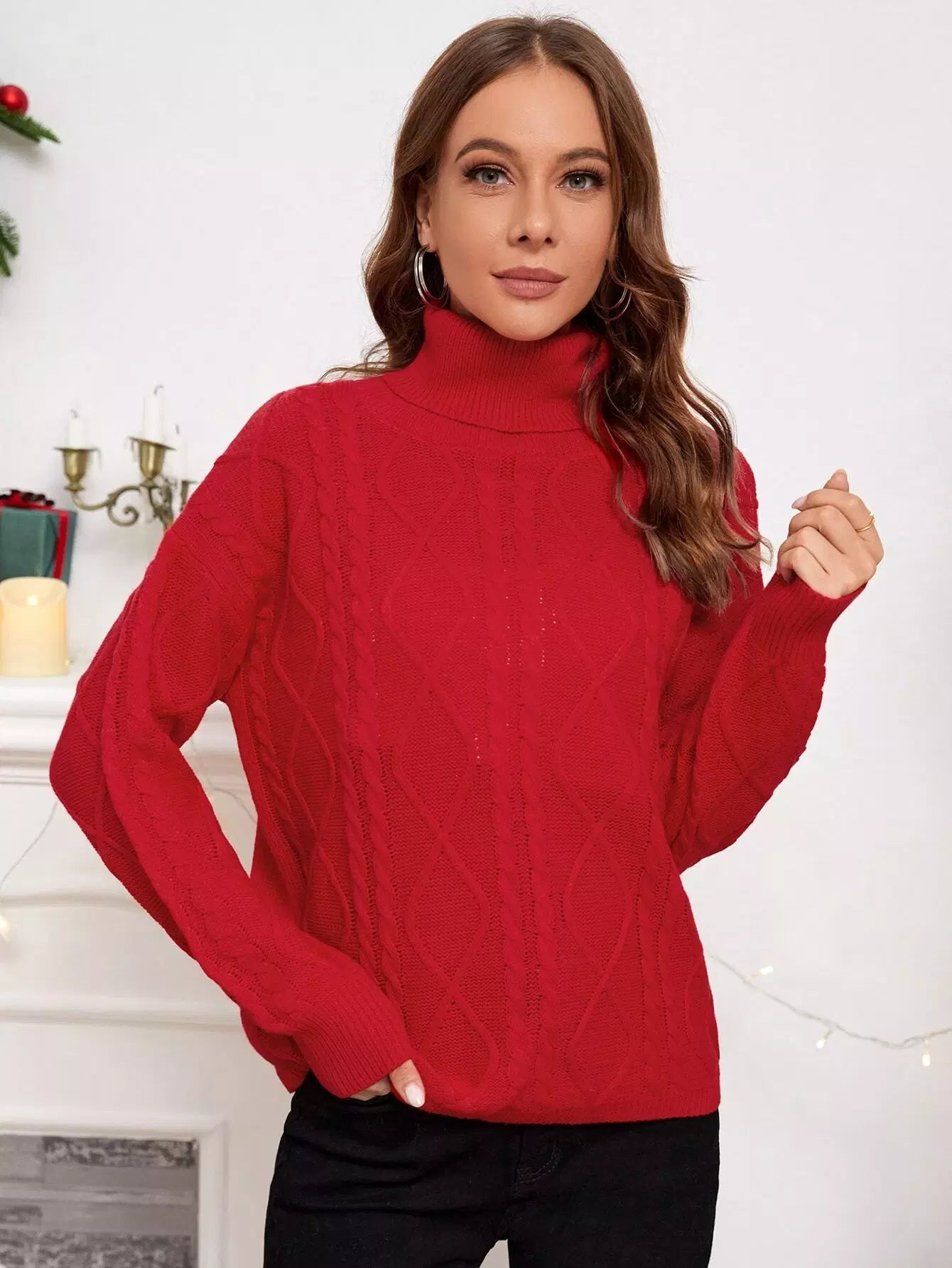 Turtleneck Cable Knit Drop Shoulder Sweater