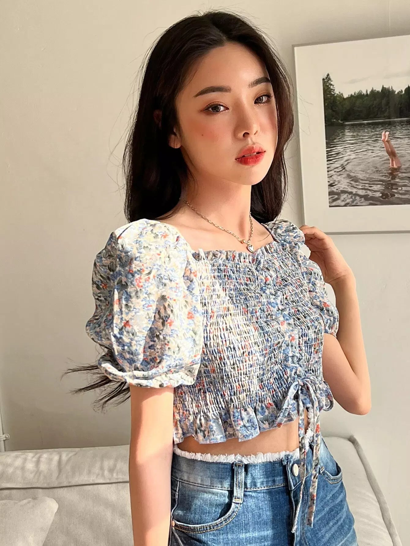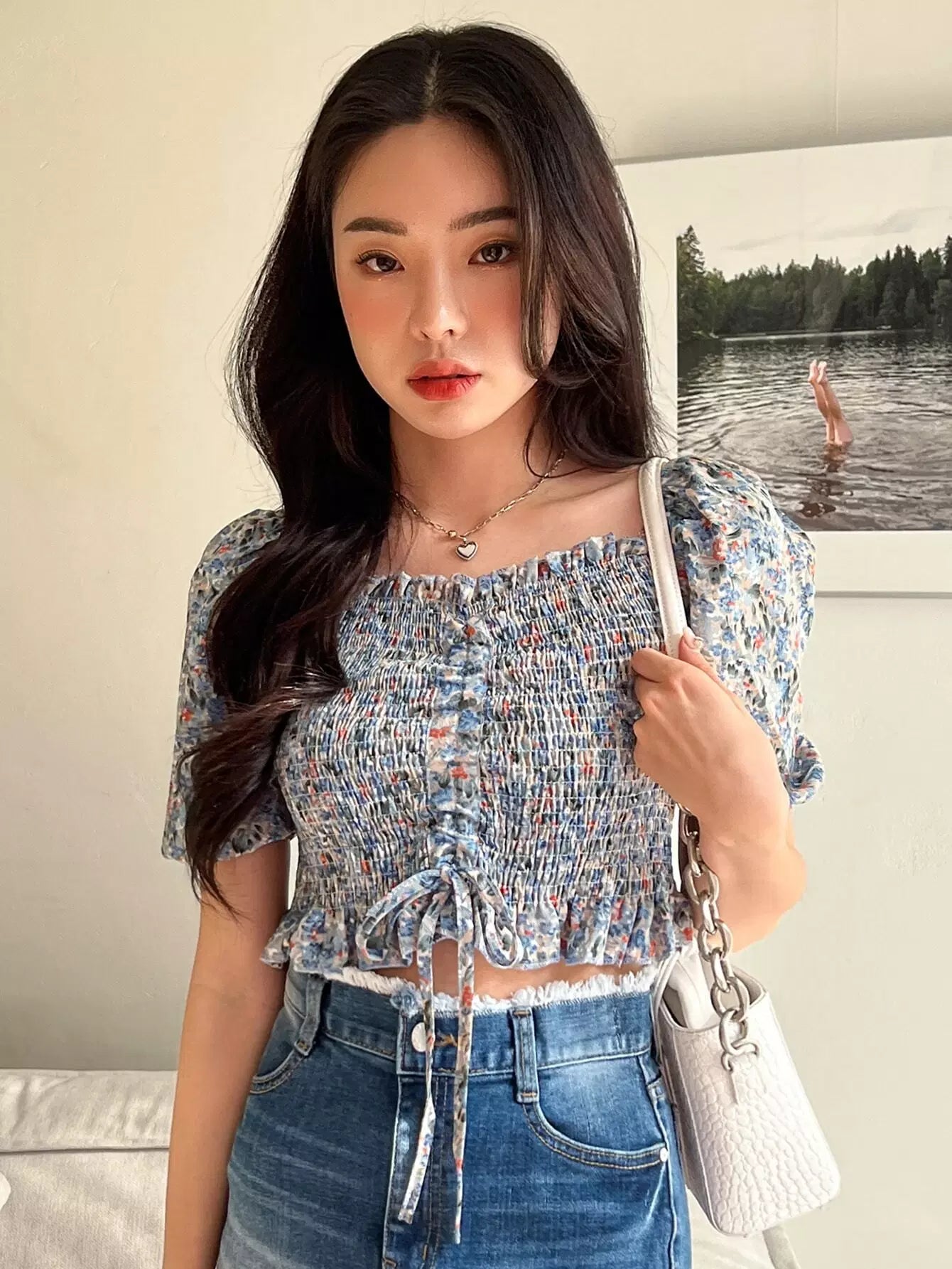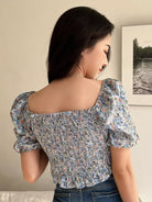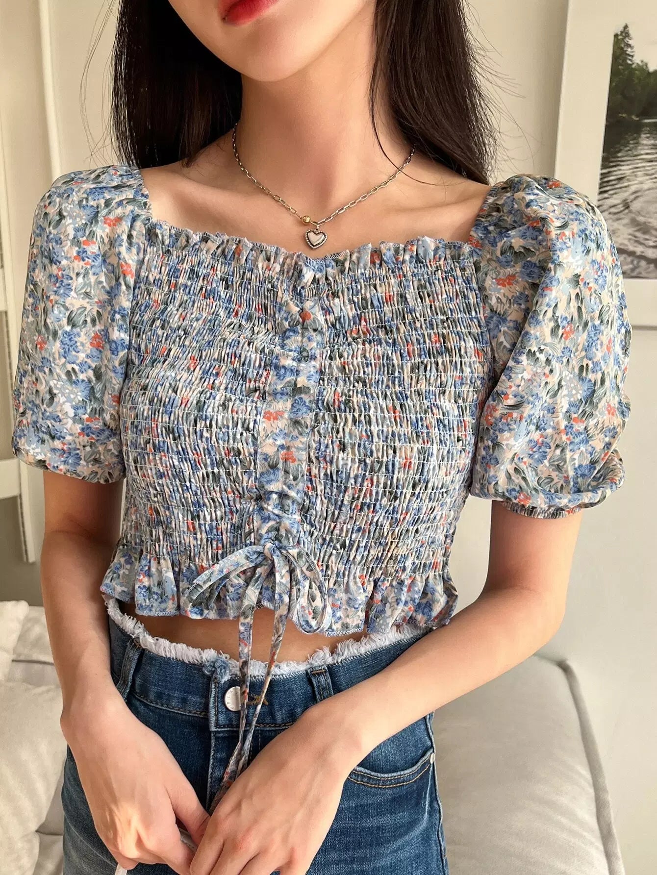 Allover Floral Print Shirred Frill Puff Sleeve Drawstring Ruffle Hem Crop Blouse