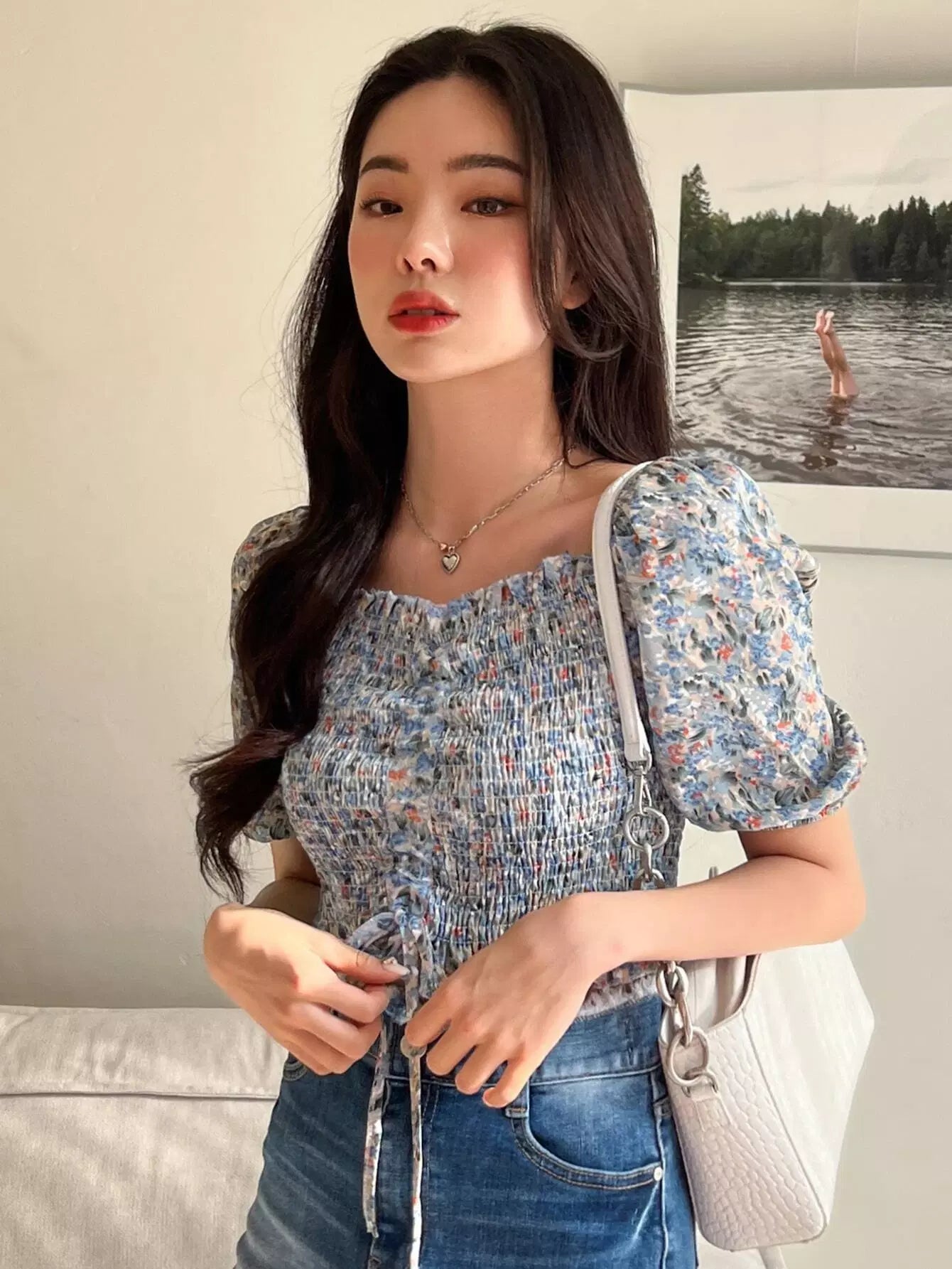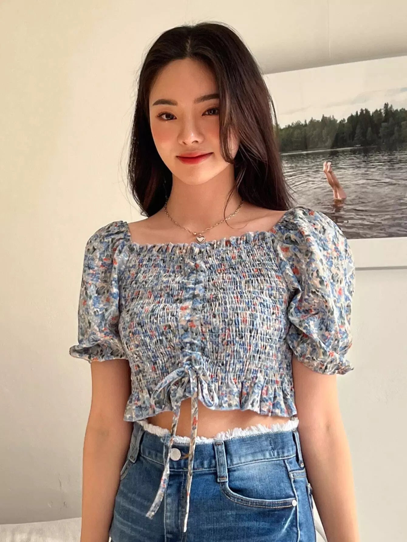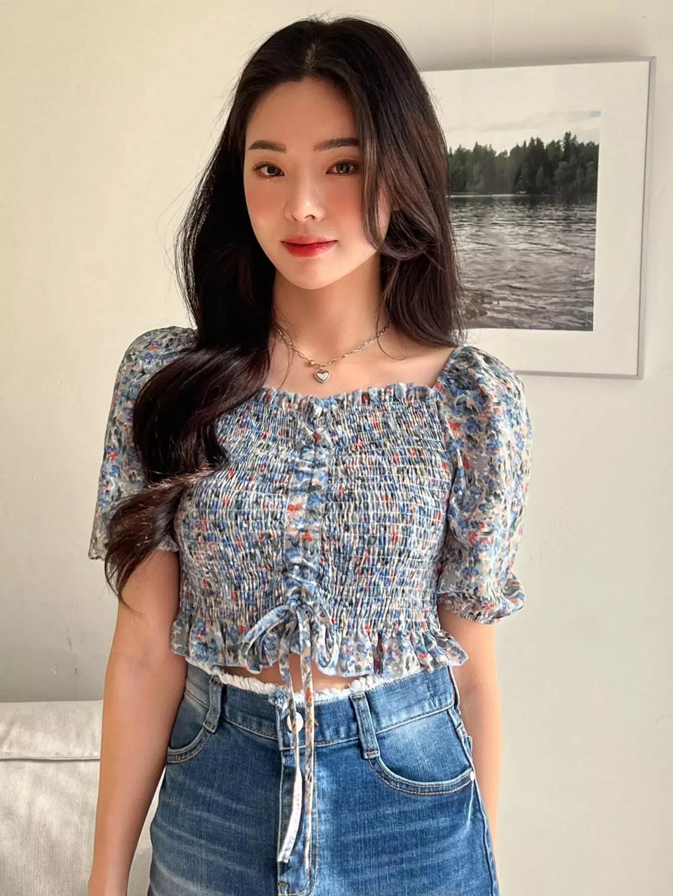 Allover Floral Print Shirred Frill Puff Sleeve Drawstring Ruffle Hem Crop Blouse