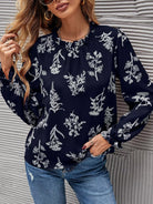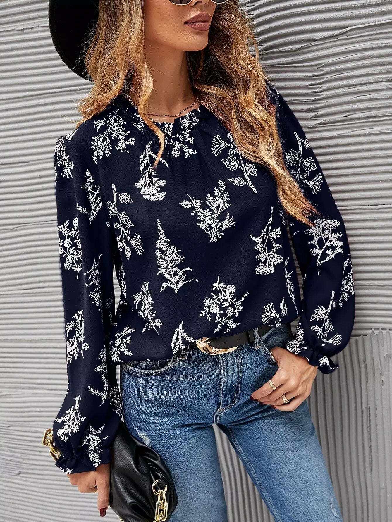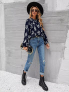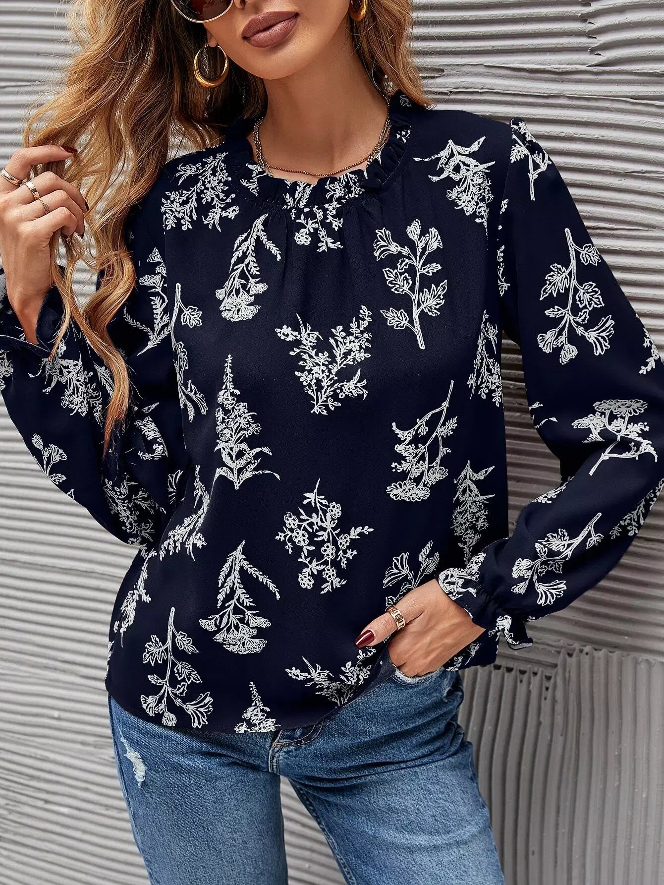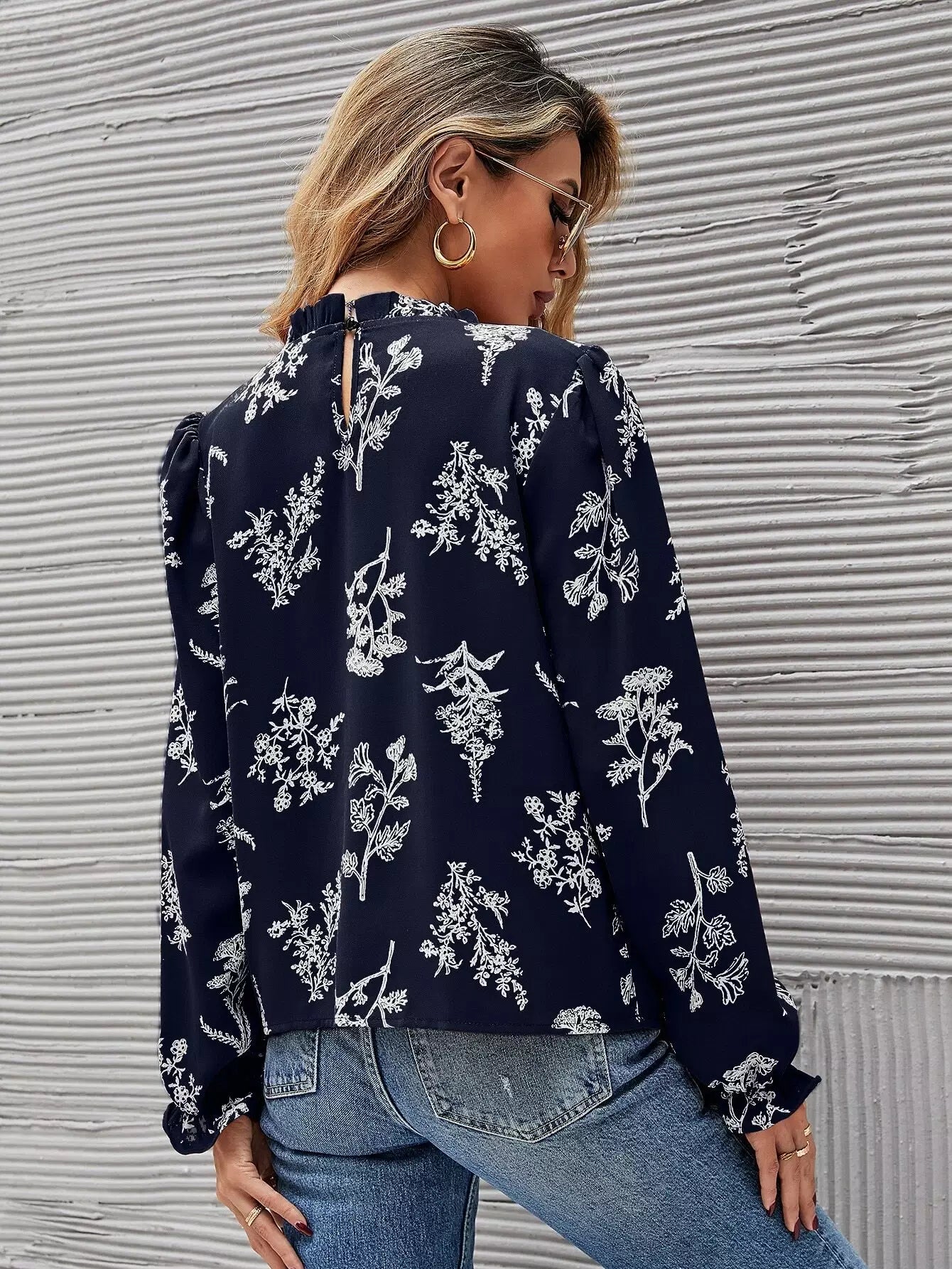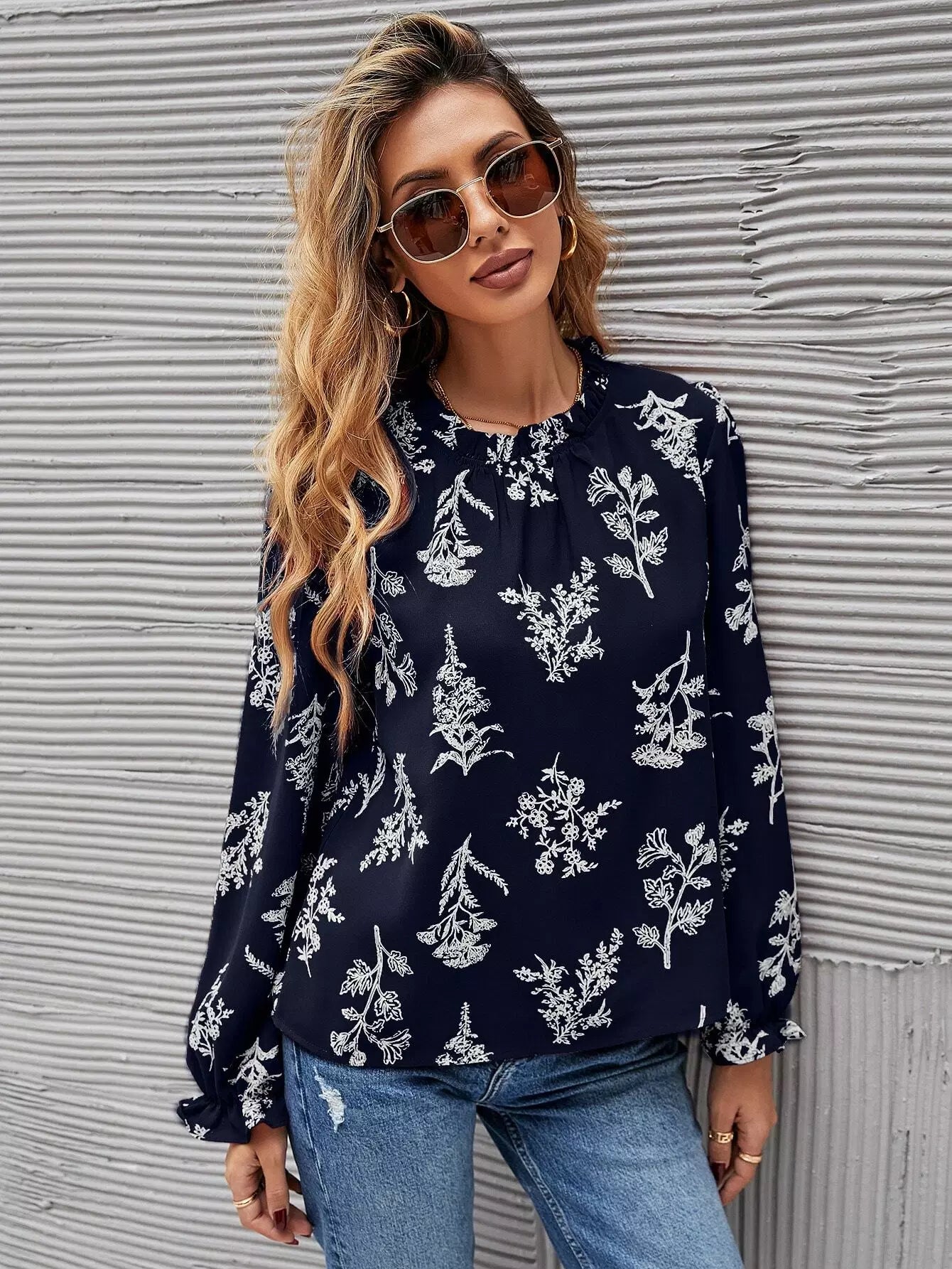 Allover Print Flounce Sleeve Frill Neck Blouse