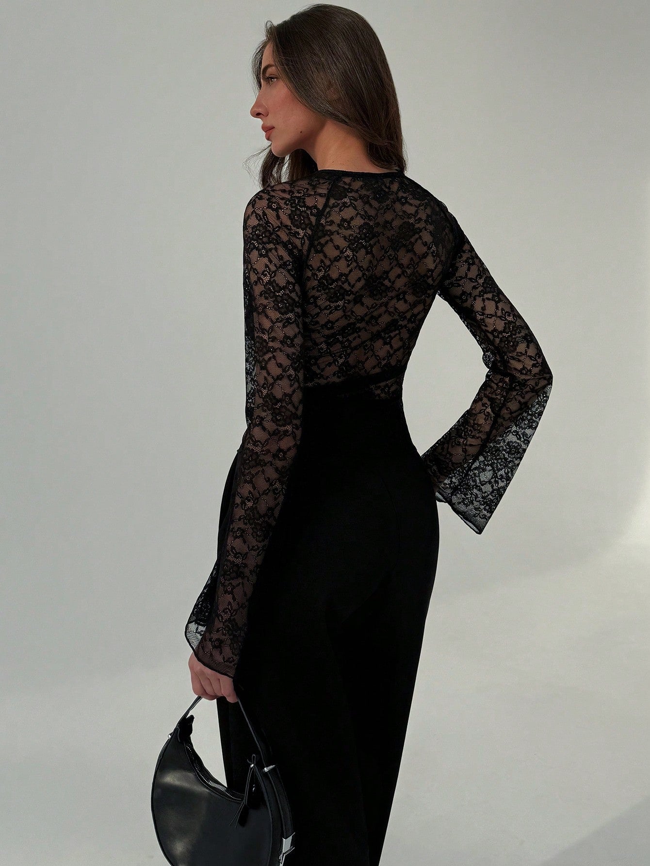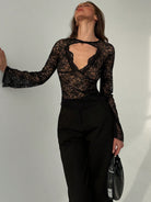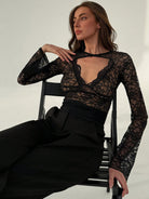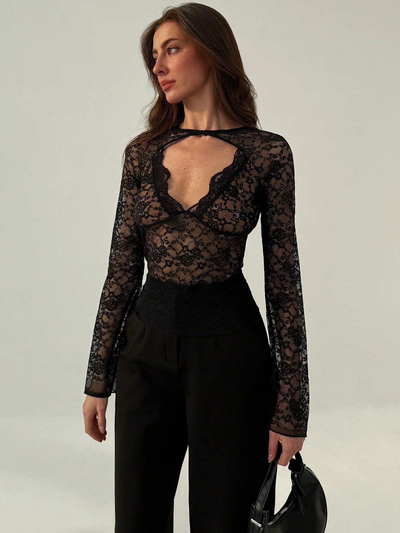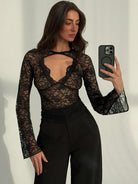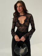Aloruh Black Lace Sheer Cutout Long Sleeve Blouse, Sexy For Music Festival, Christmas