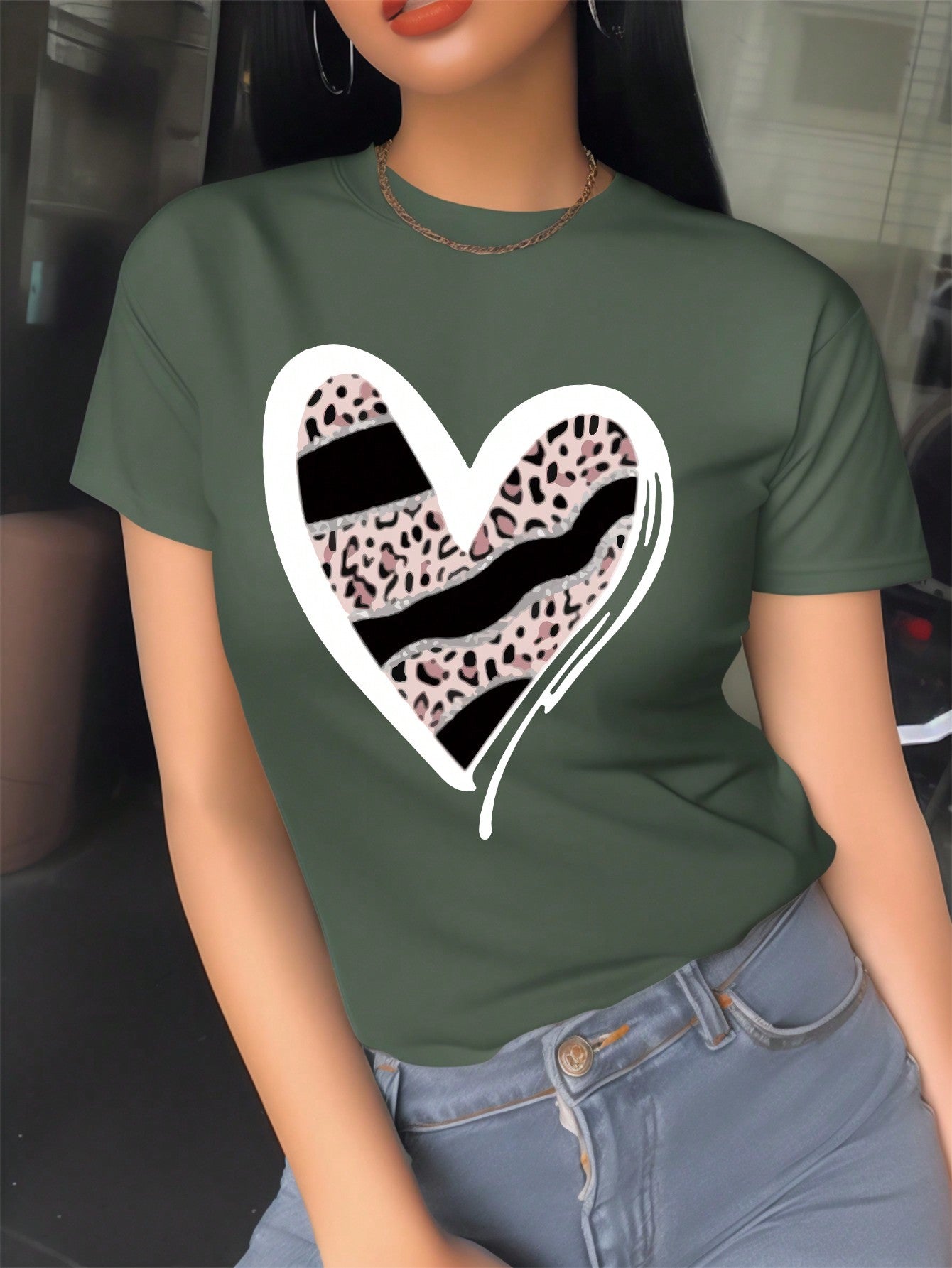 Chiquease Leopard Heart Print Round Neck Short Sleeve T-Shirt