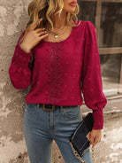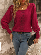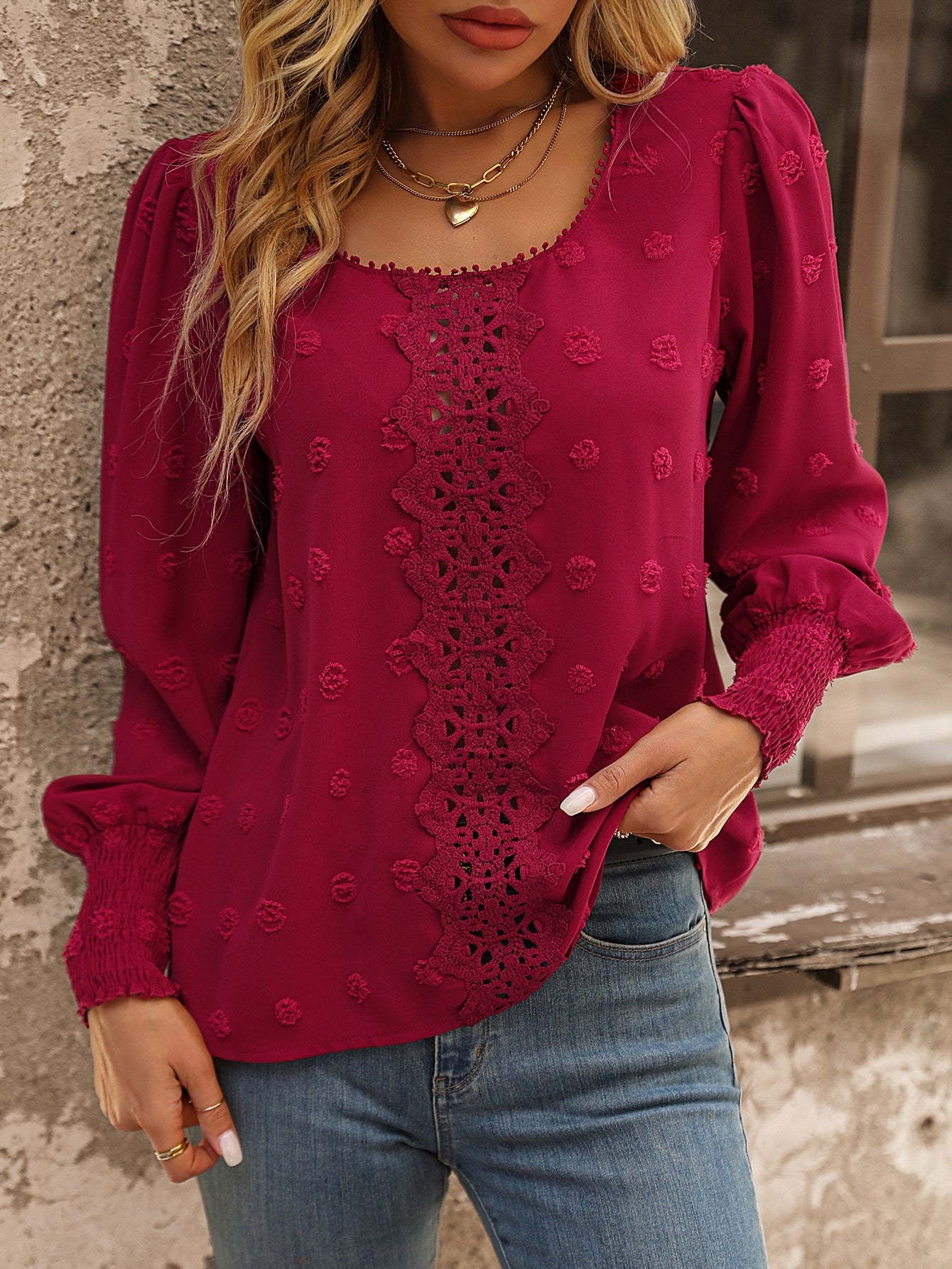Clasi Swiss Dot Guipure Lace Insert Lantern Sleeve Blouse For New Year Clothes,Long Sleeve Tops