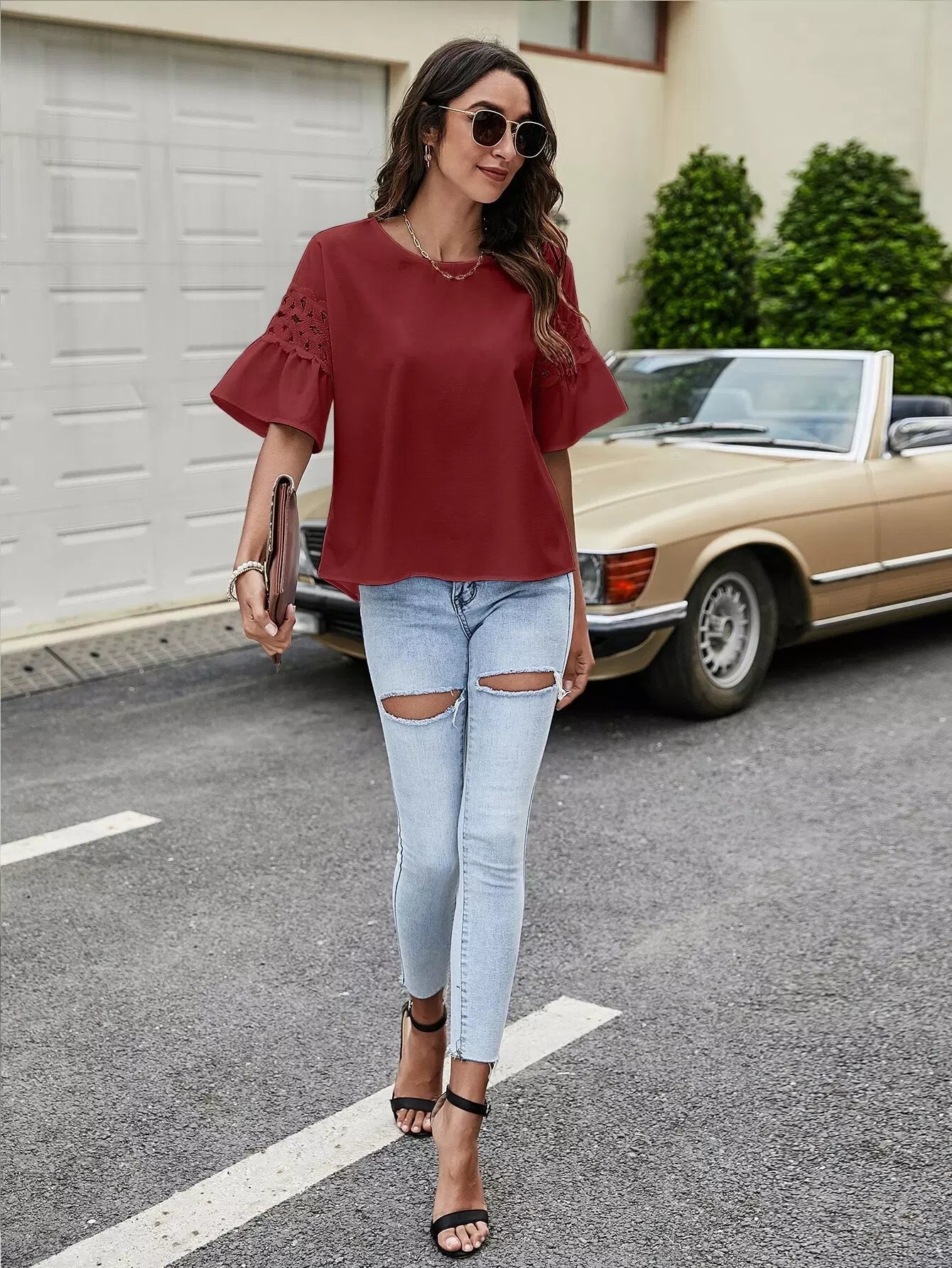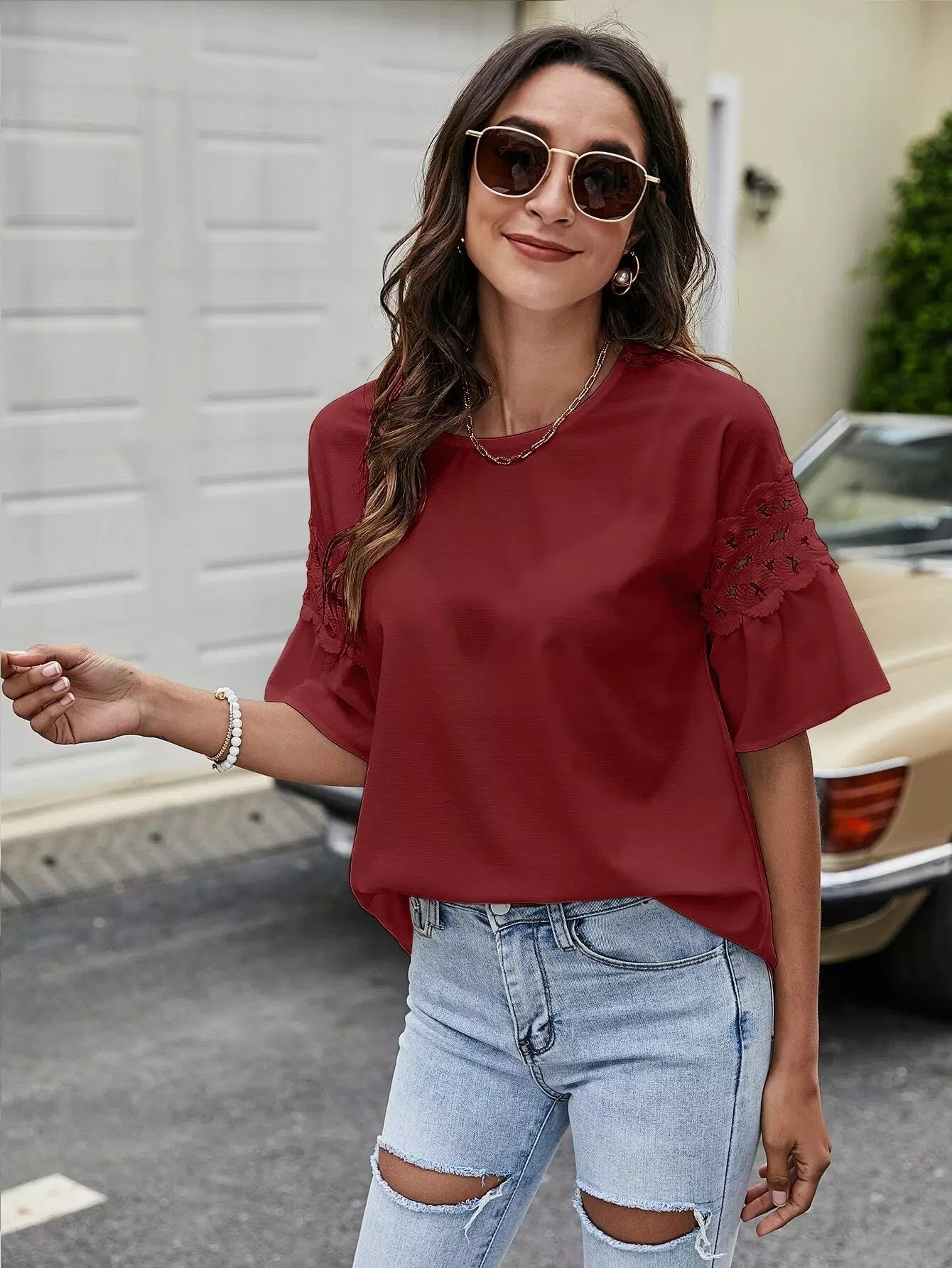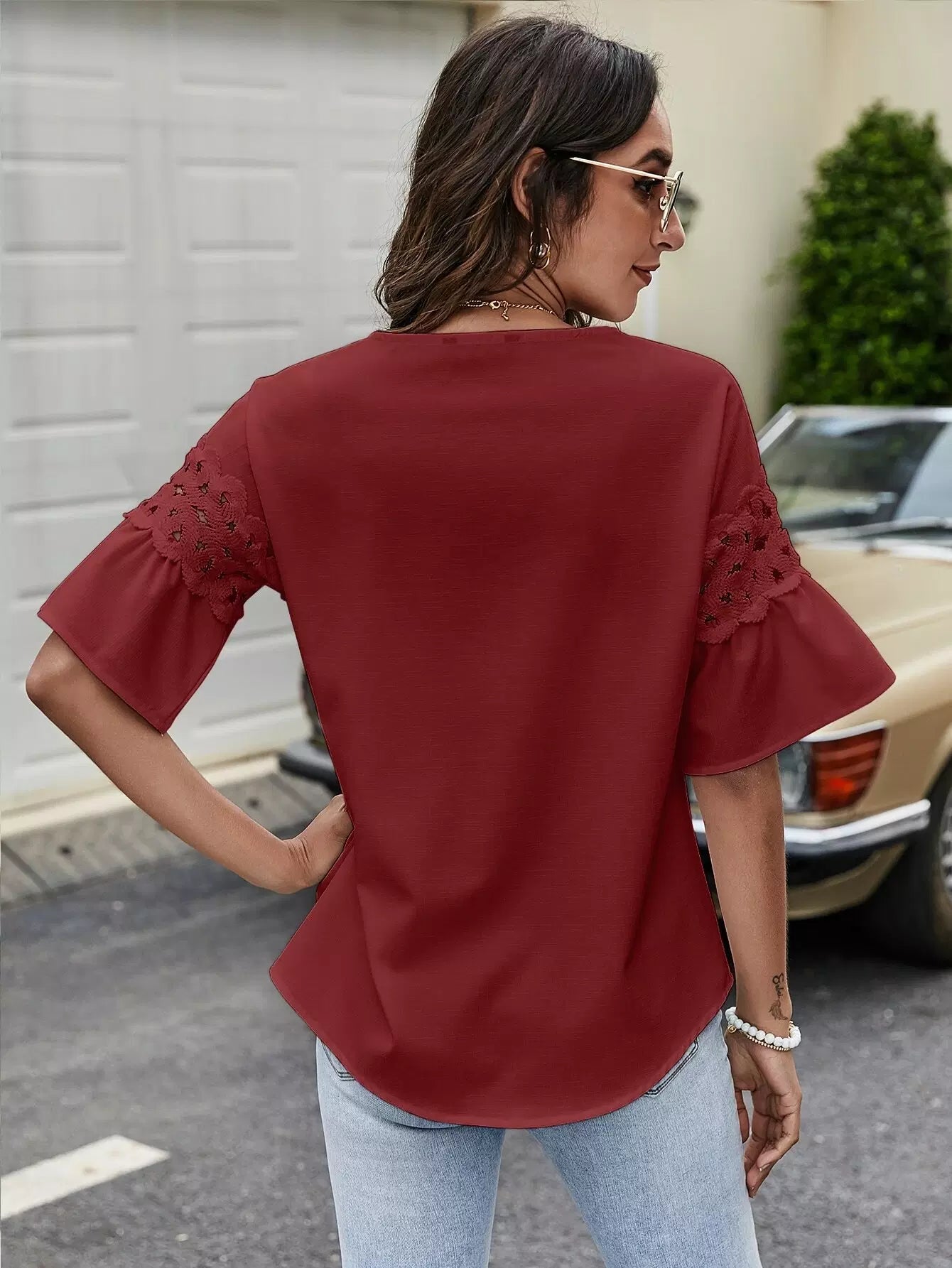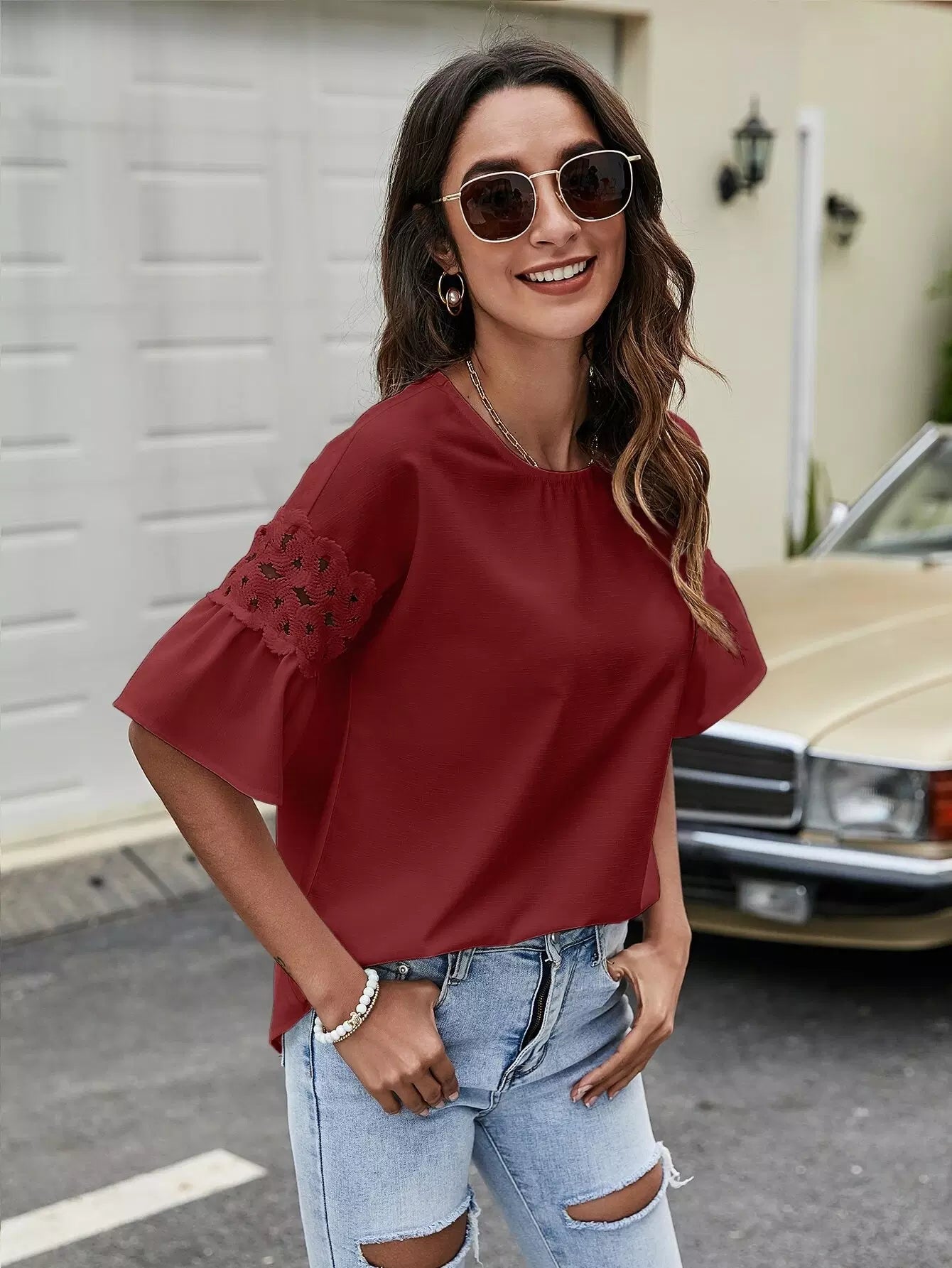 Women - Contrast Guipure Lace Flounce Sleeve Blouse