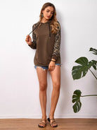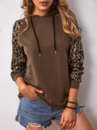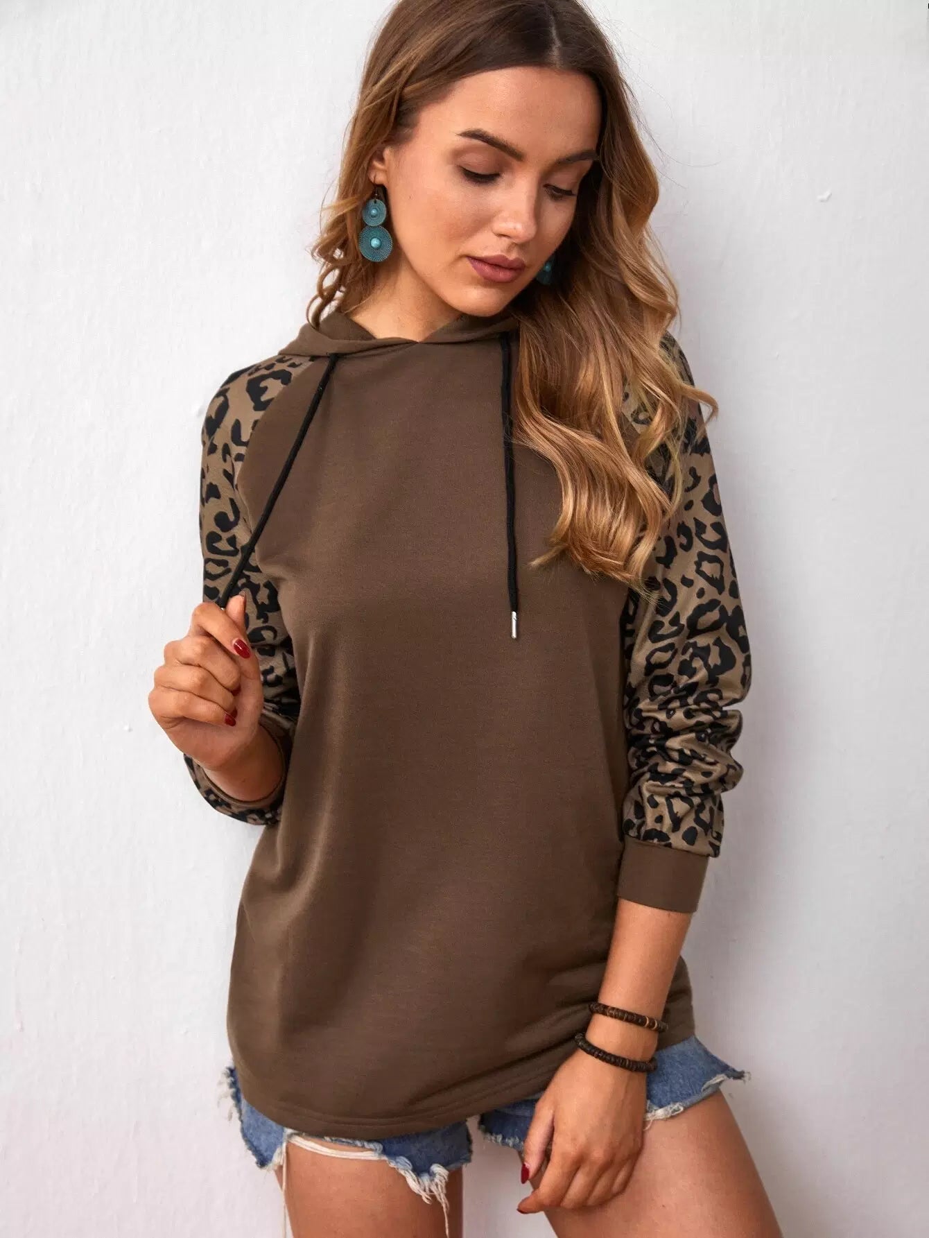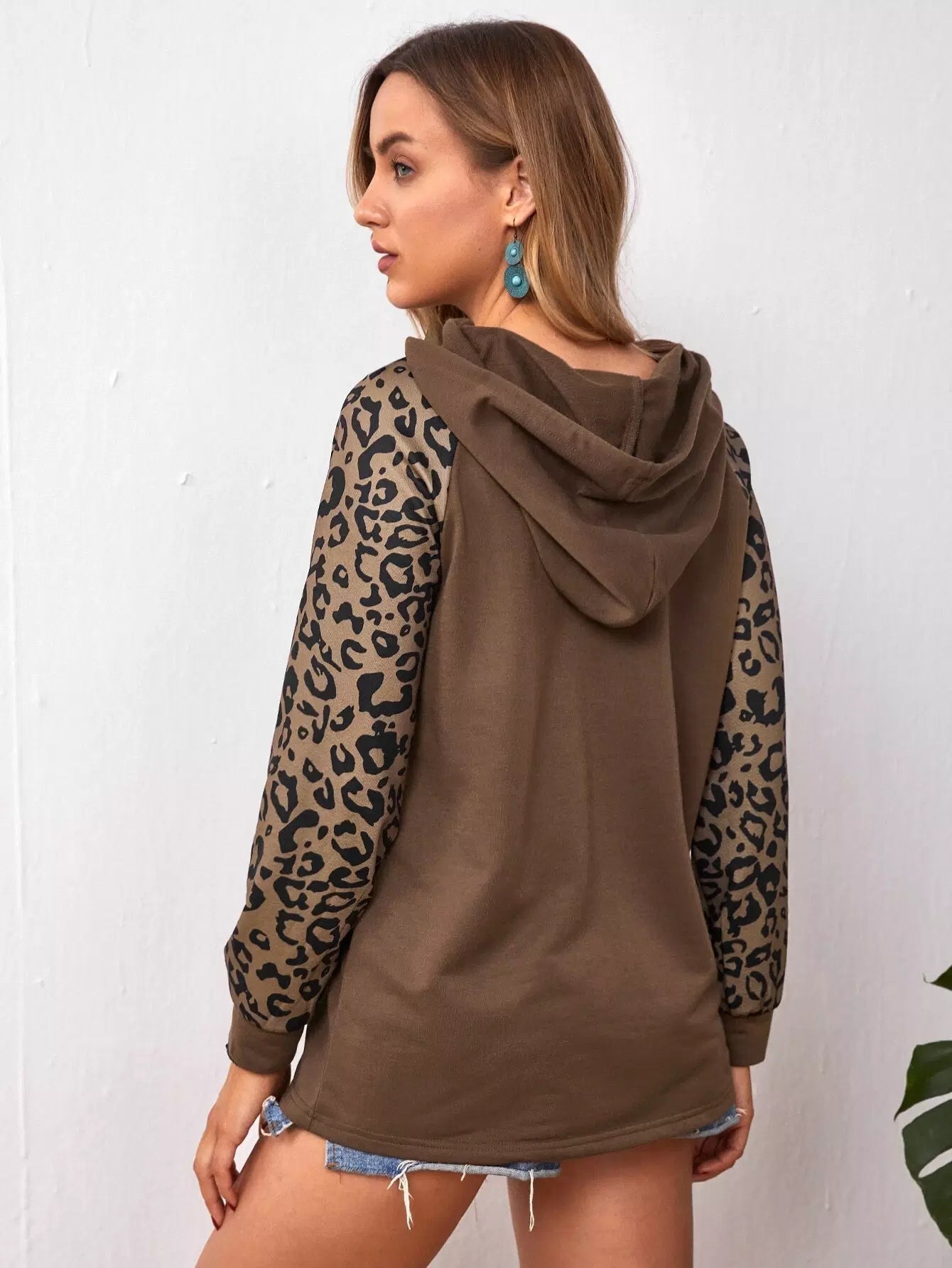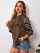 Contrast Leopard Raglan Sleeve Drawstring Hoodie