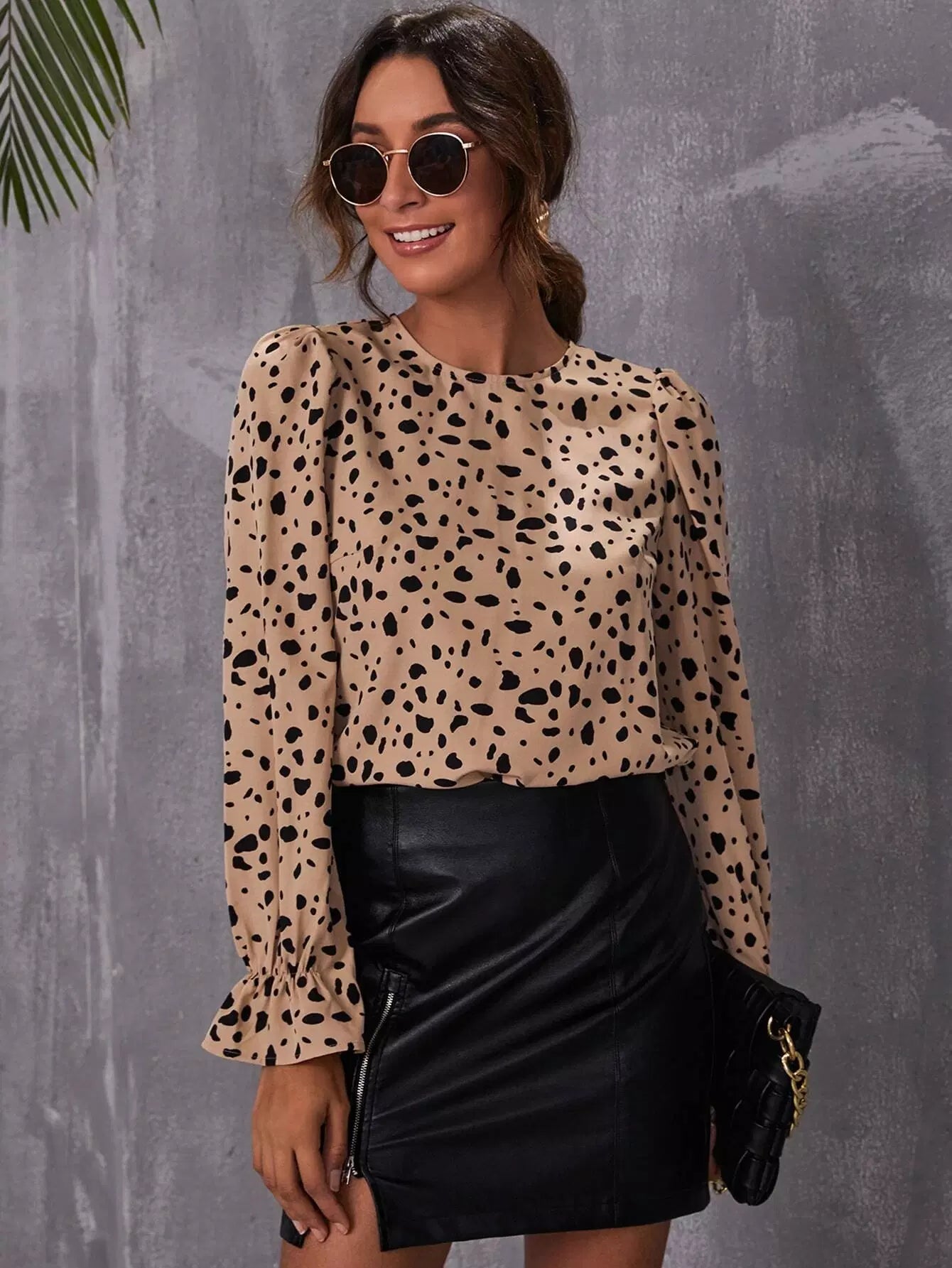 Dalmatian Print Keyhole Back Flounce Sleeve Blouse