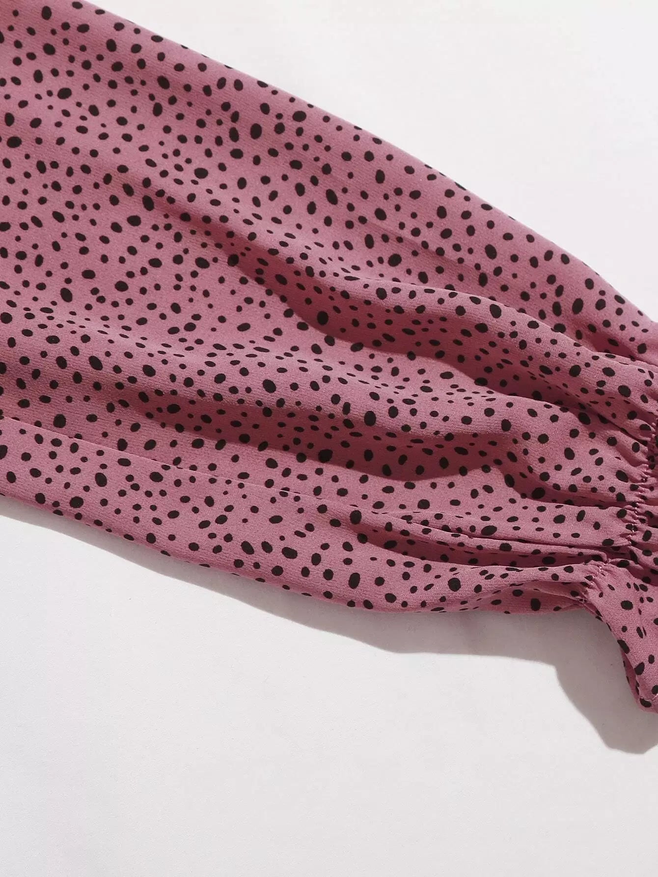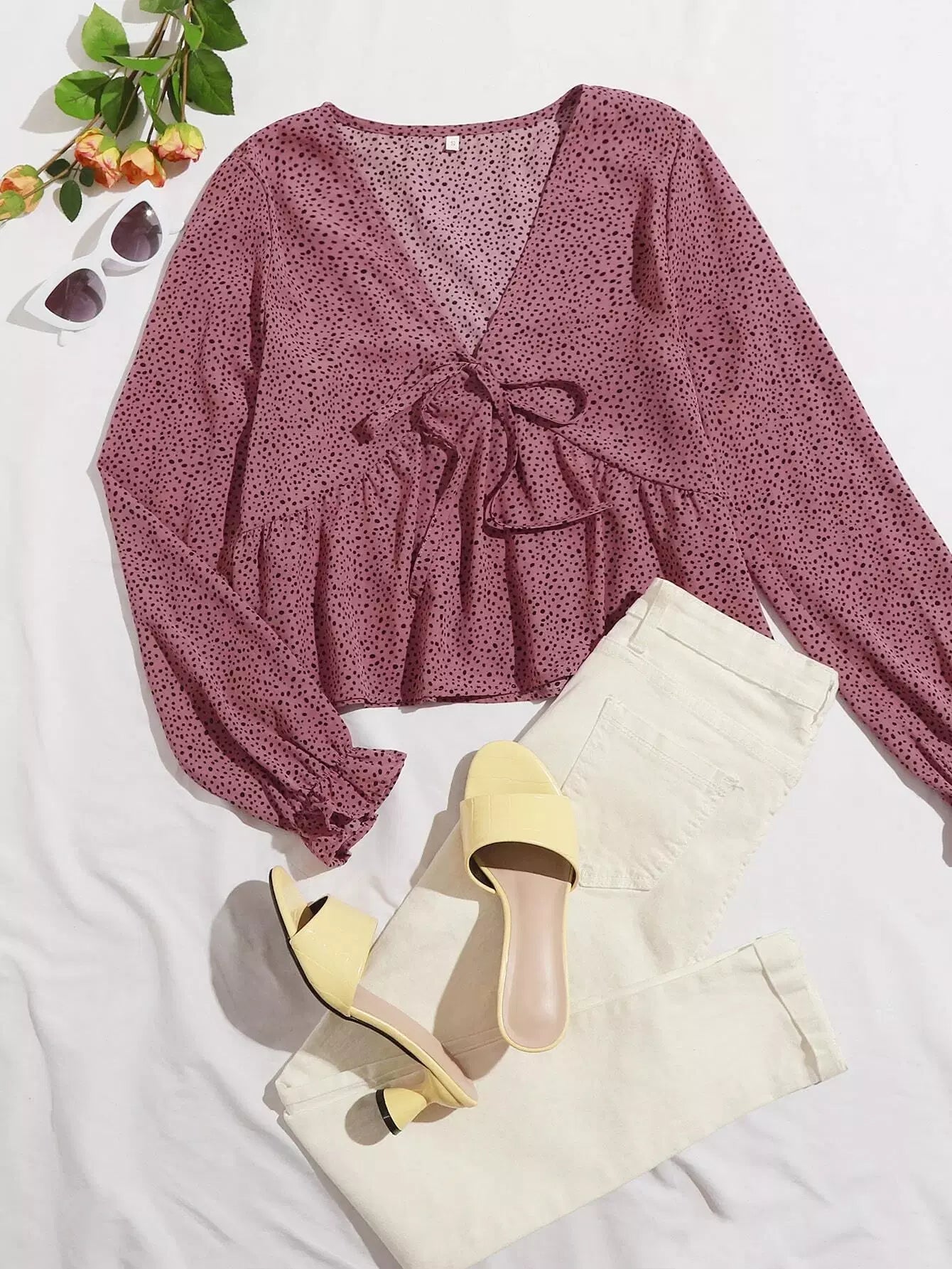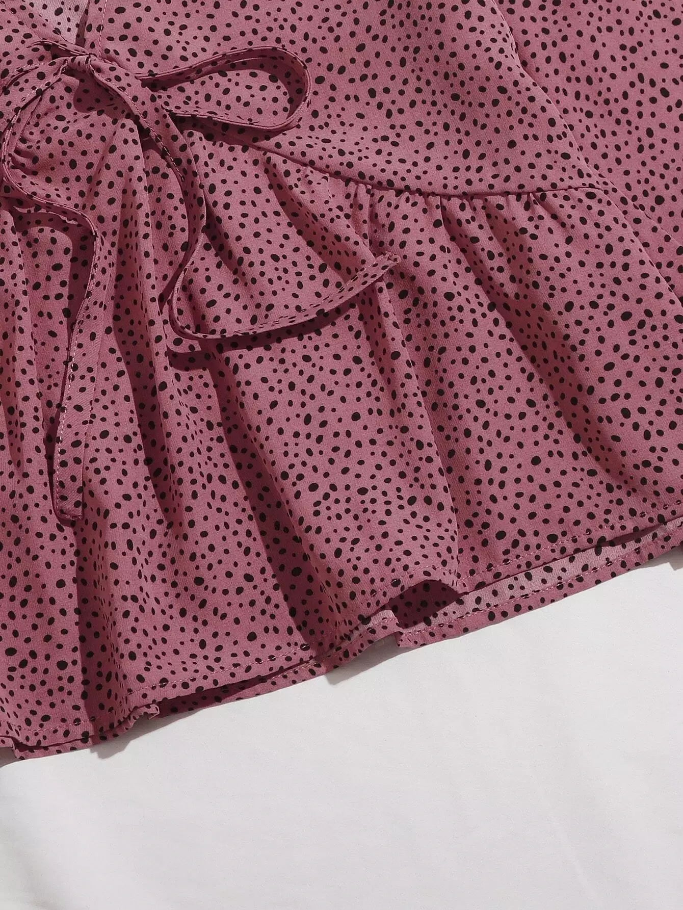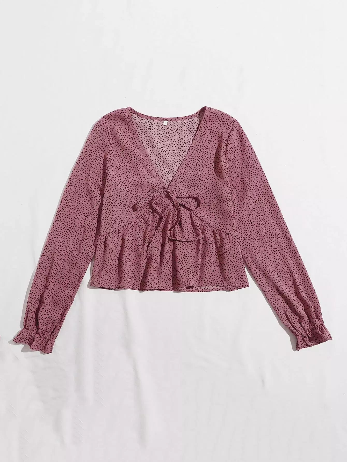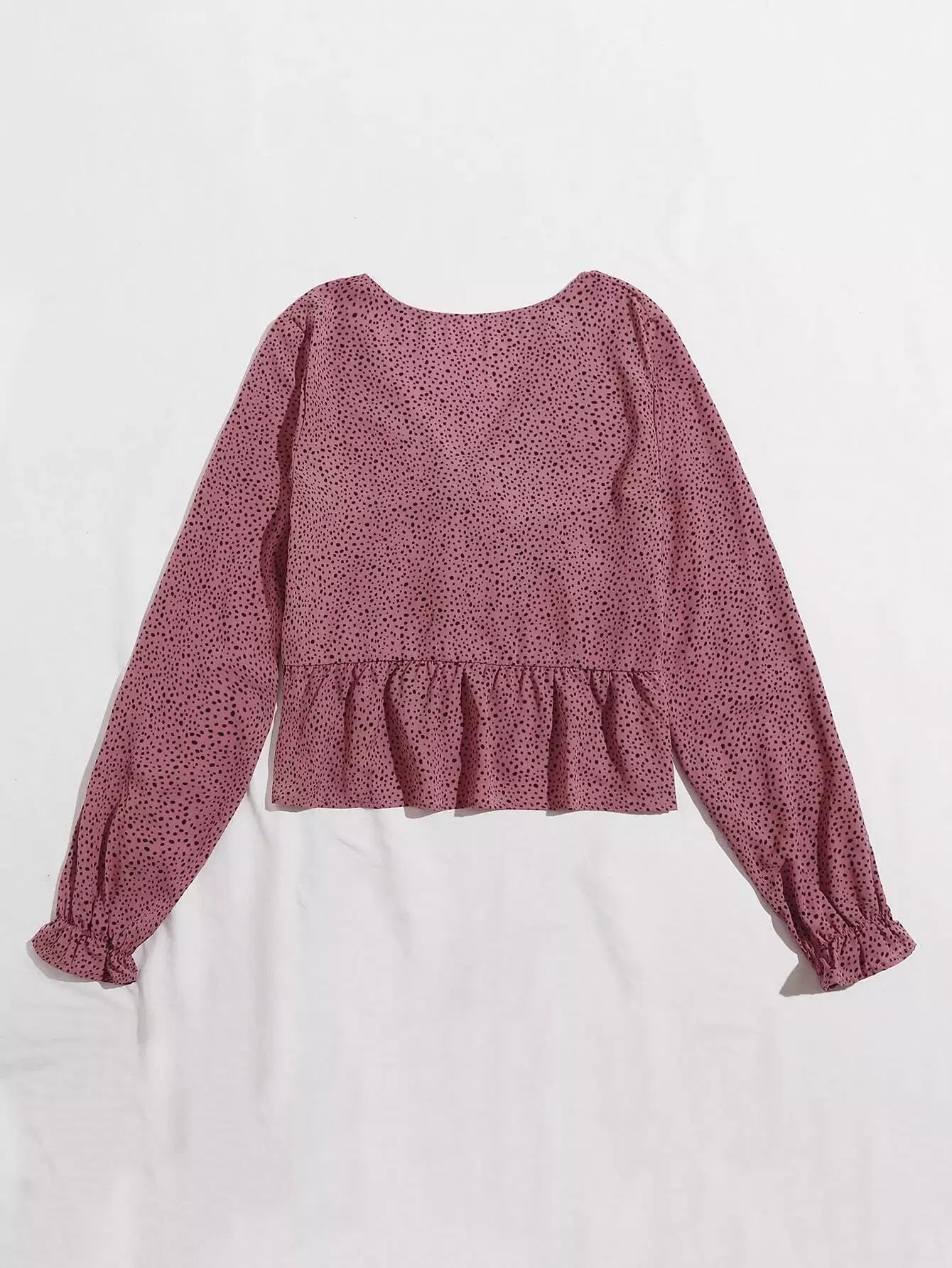 Dalmatian Print Knot Front Ruffle Hem Blouse