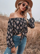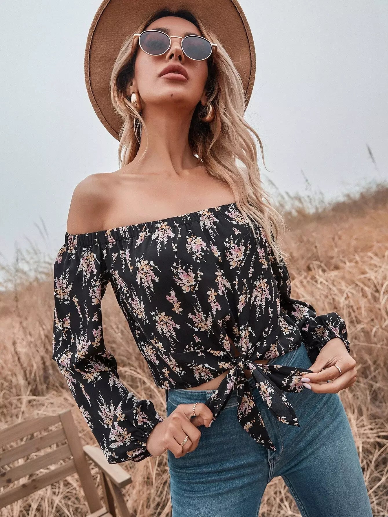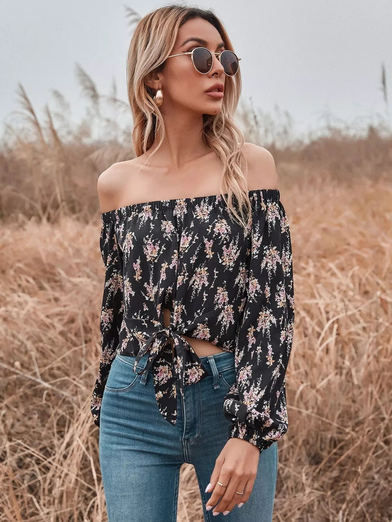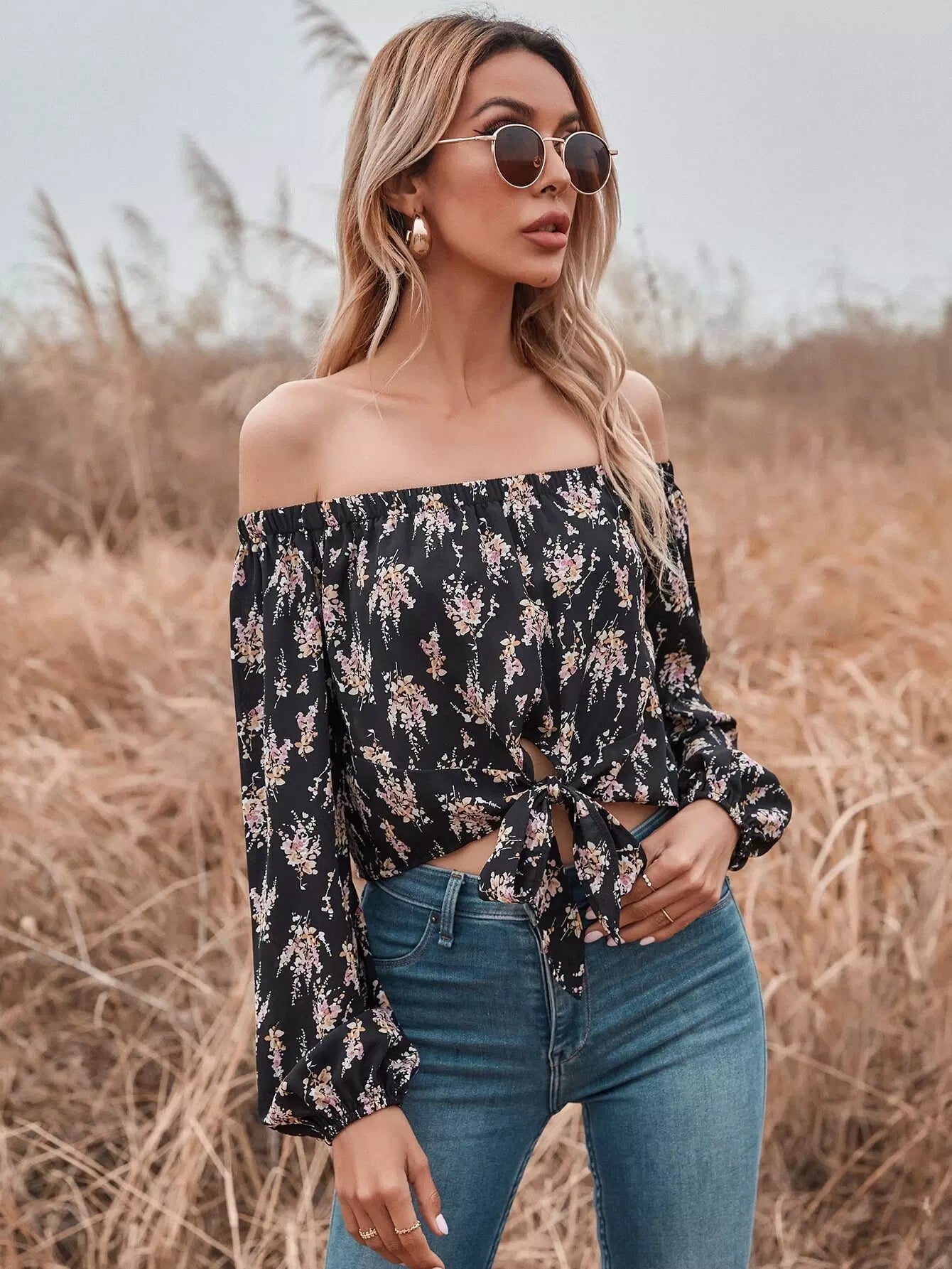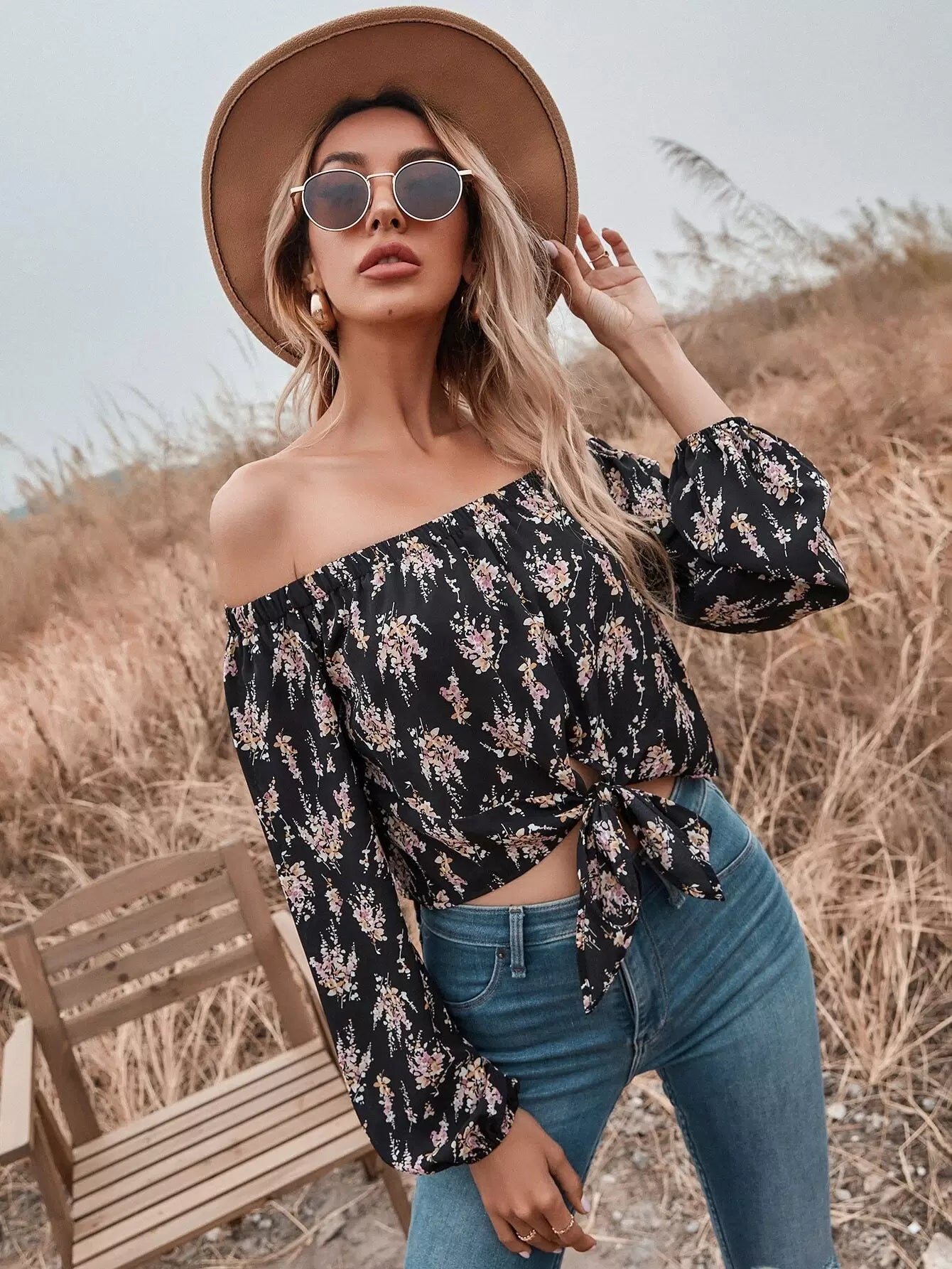 Ditsy Floral Knot Hem Chiffon Bardot Blouse