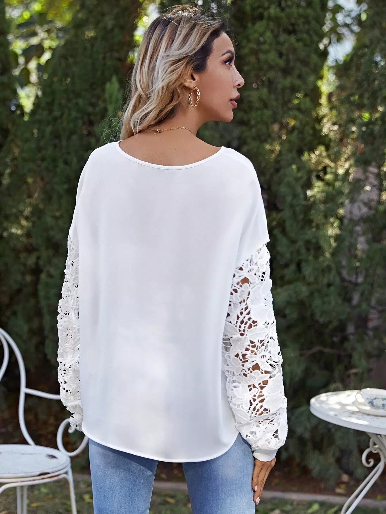 Drop Shoulder Guipure Lace Sleeve Solid Top