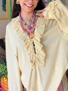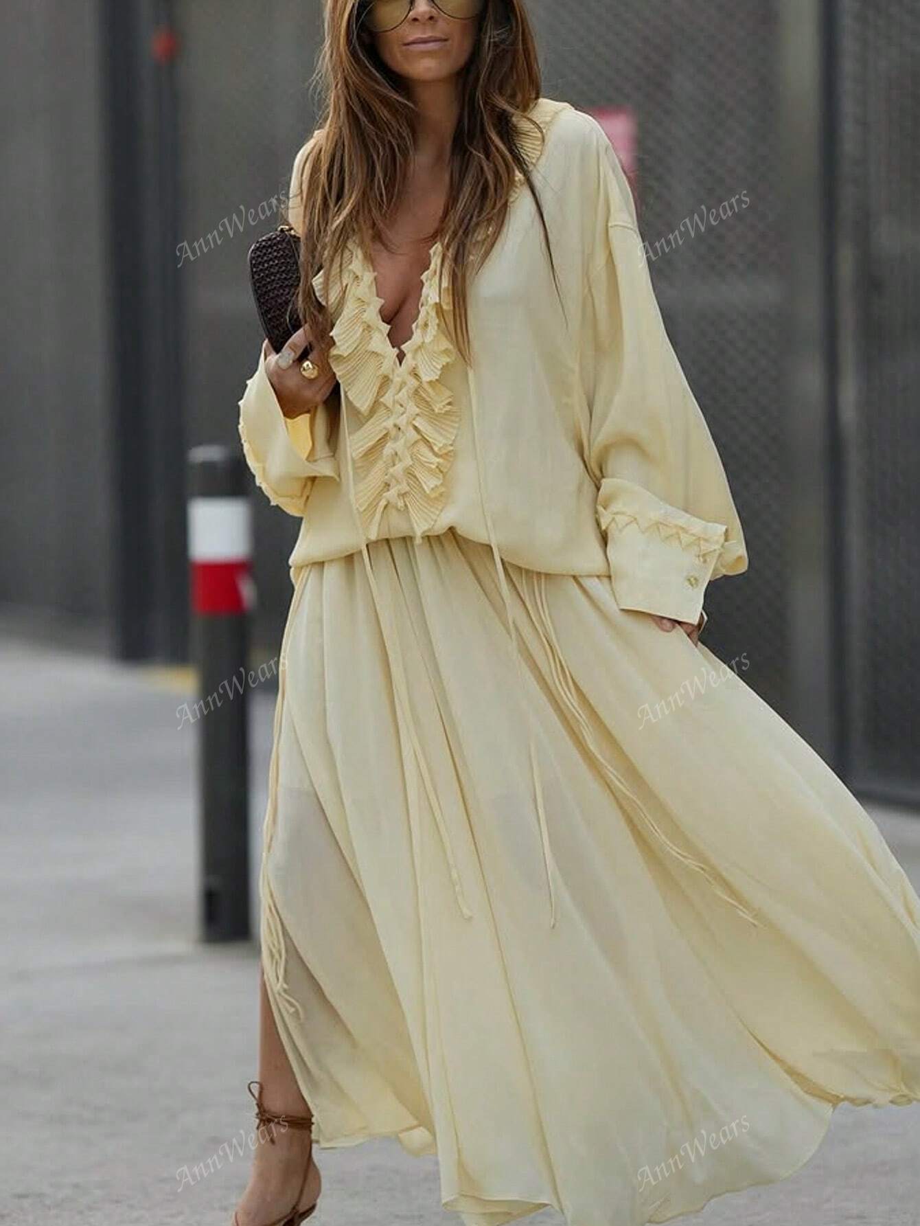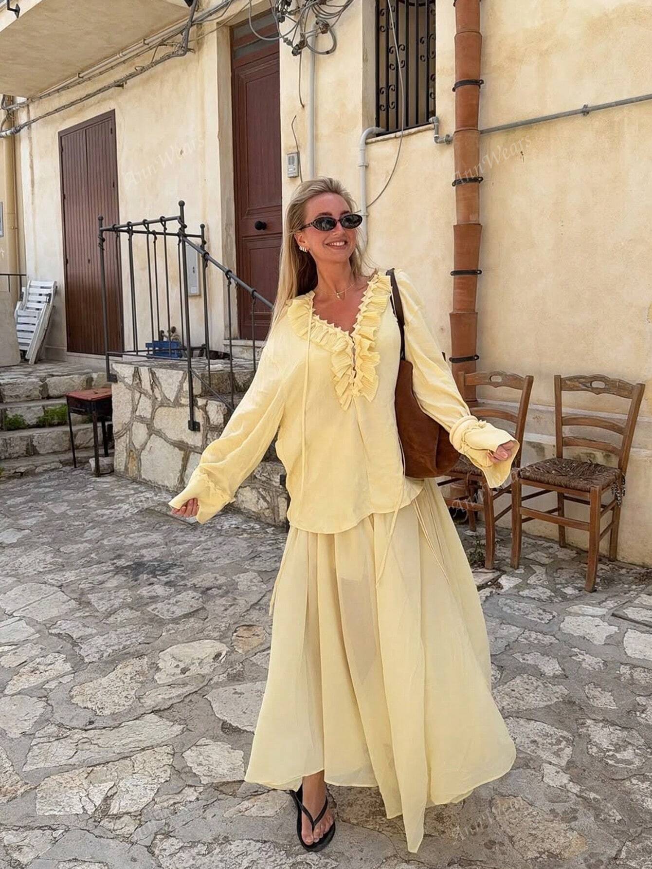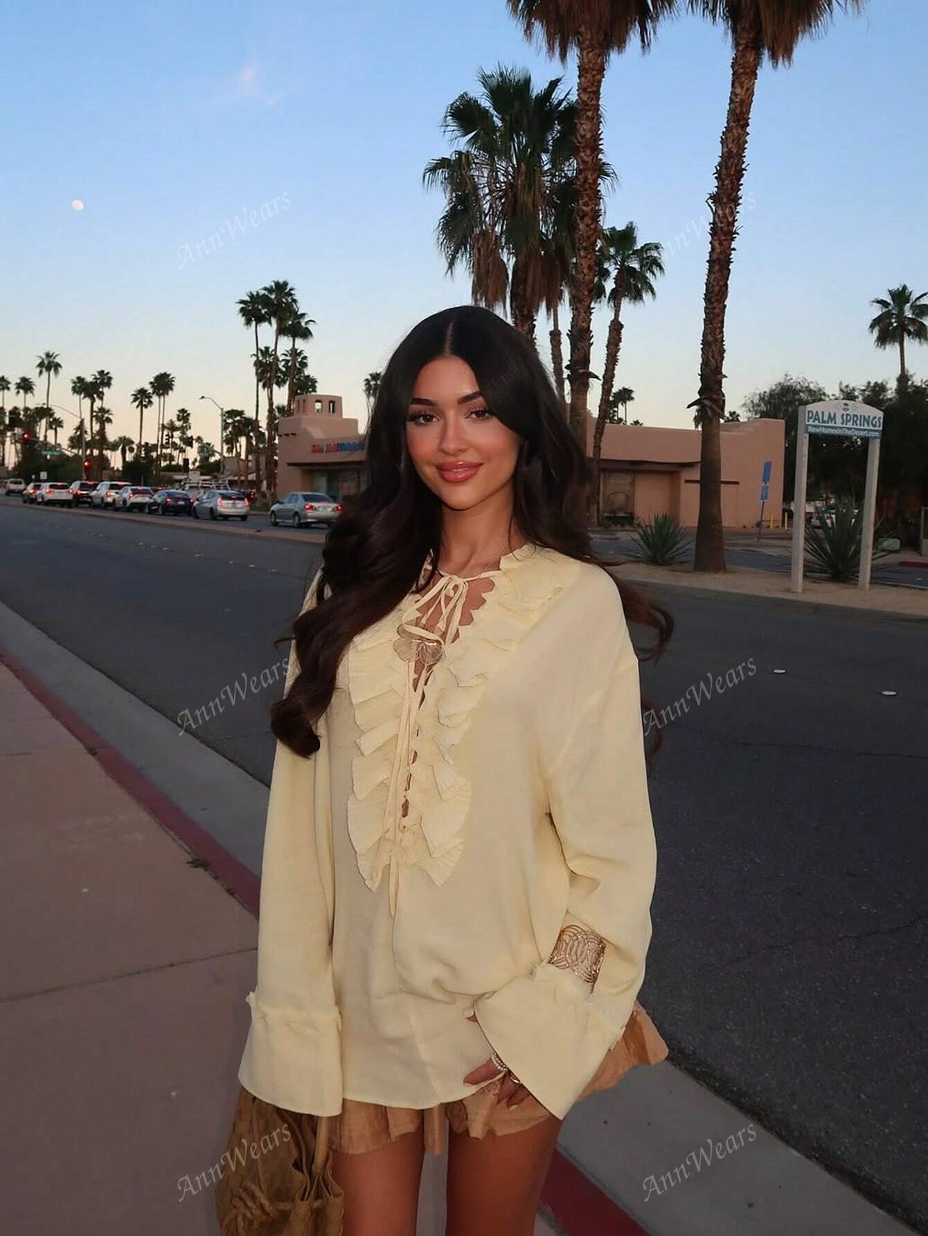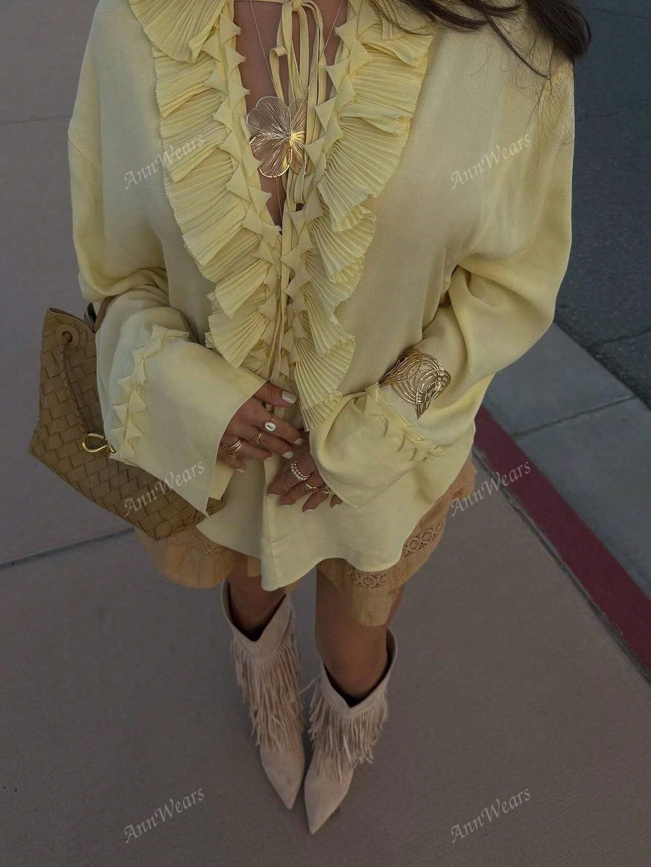 Elegant French Woven Lantern Sleeve V-Neck Ruffled Hem Loose Regular Women's Shirt, Lantern Sleeve V-Neck