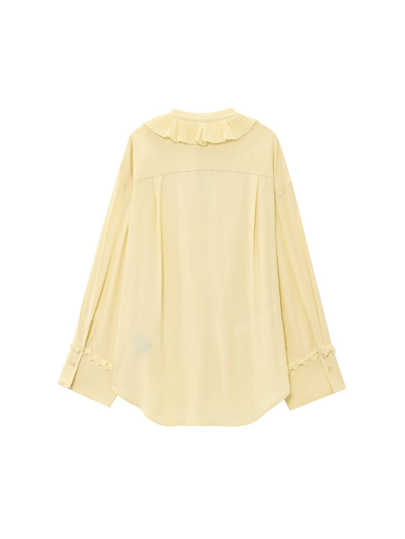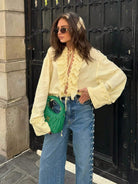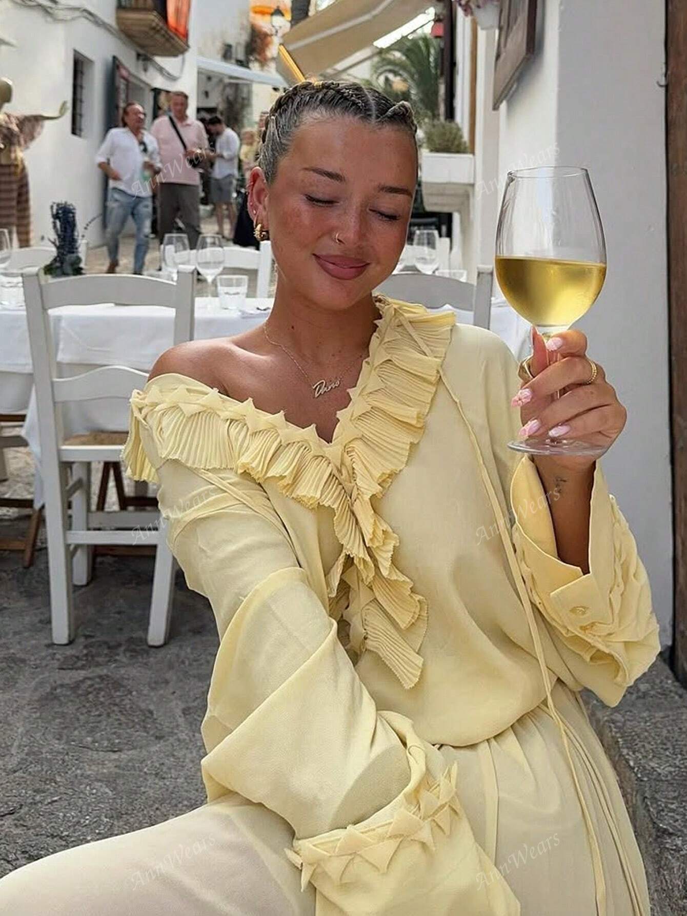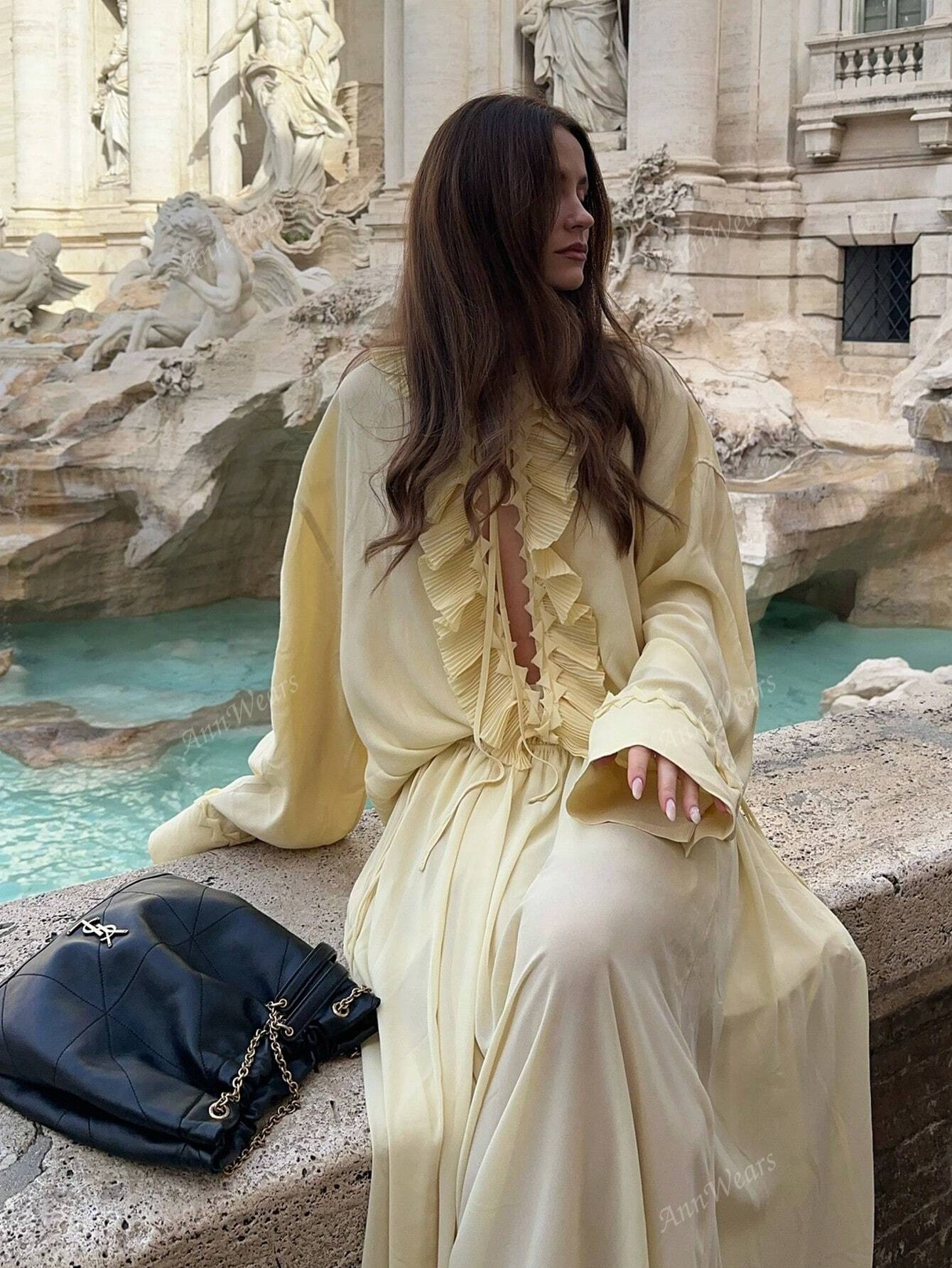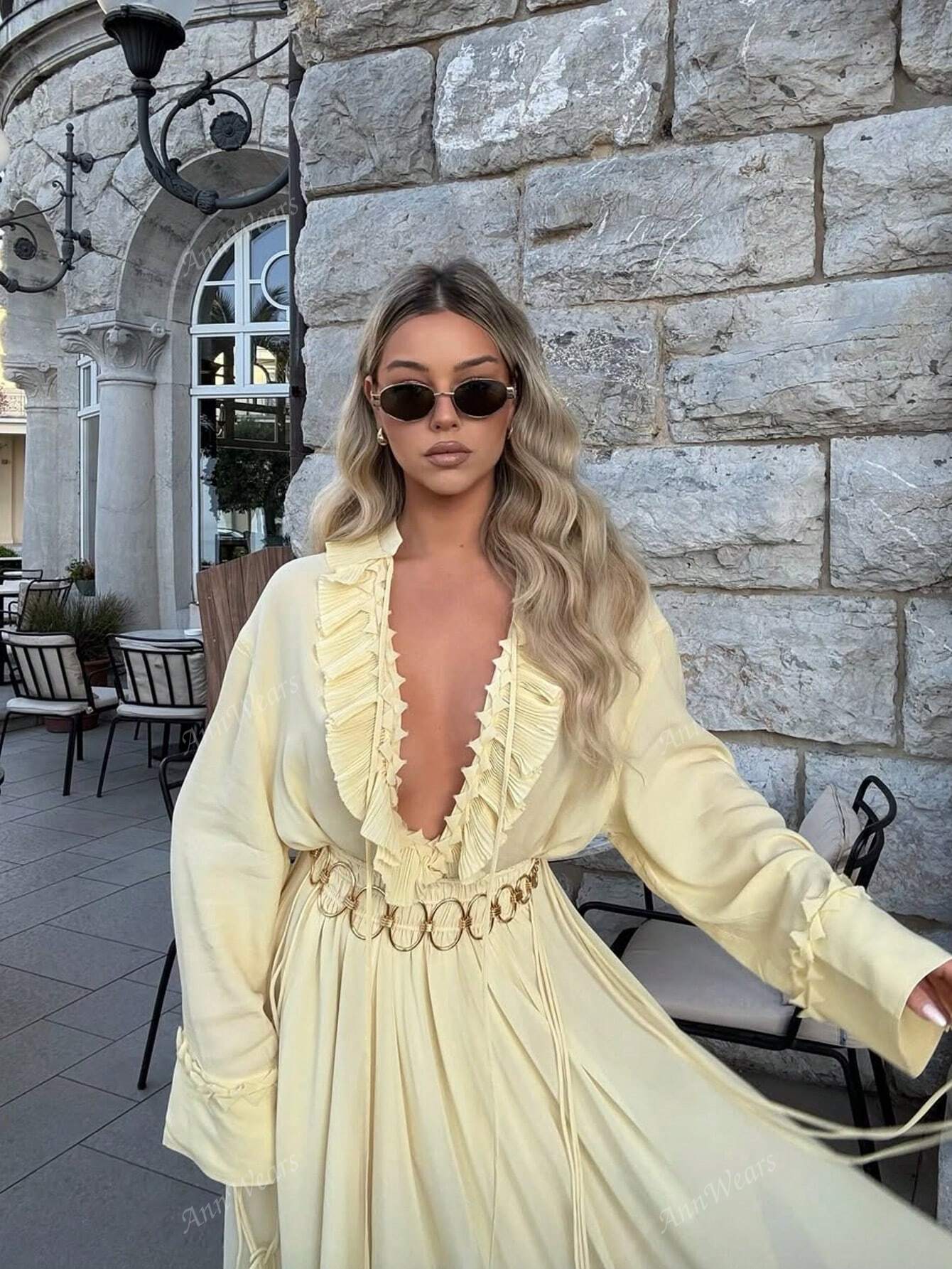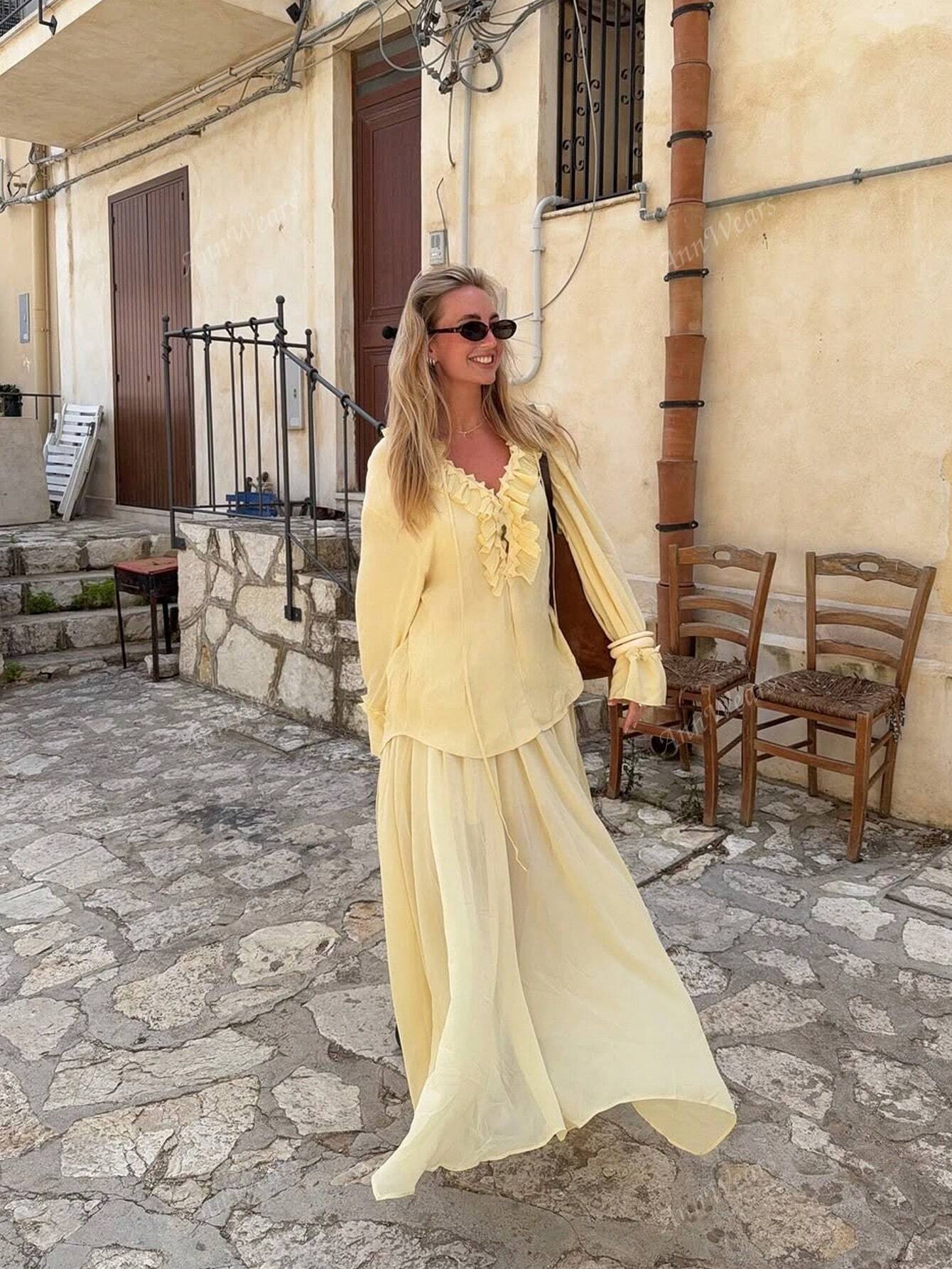 Elegant French Woven Lantern Sleeve V-Neck Ruffled Hem Loose Regular Women's Shirt, Lantern Sleeve V-Neck