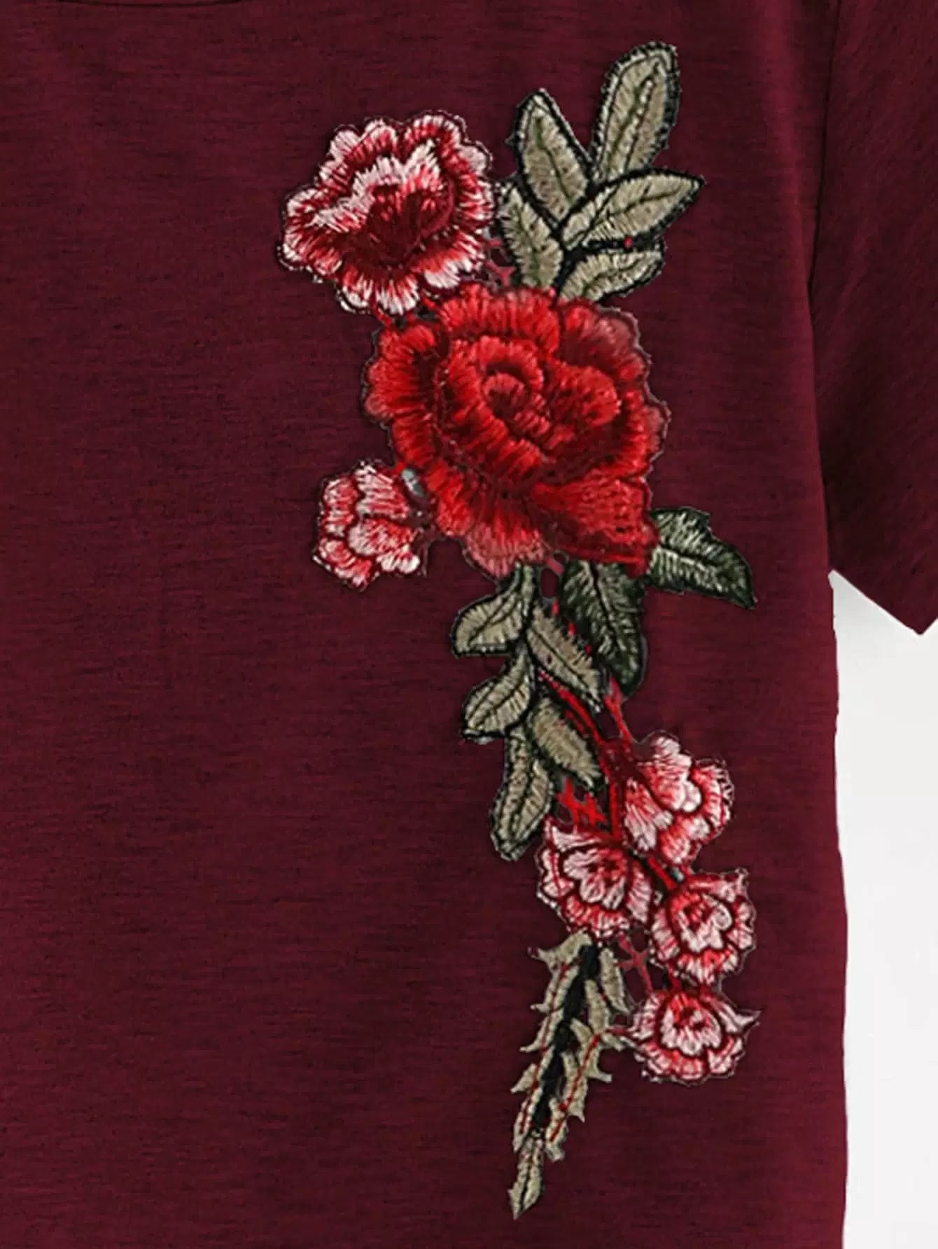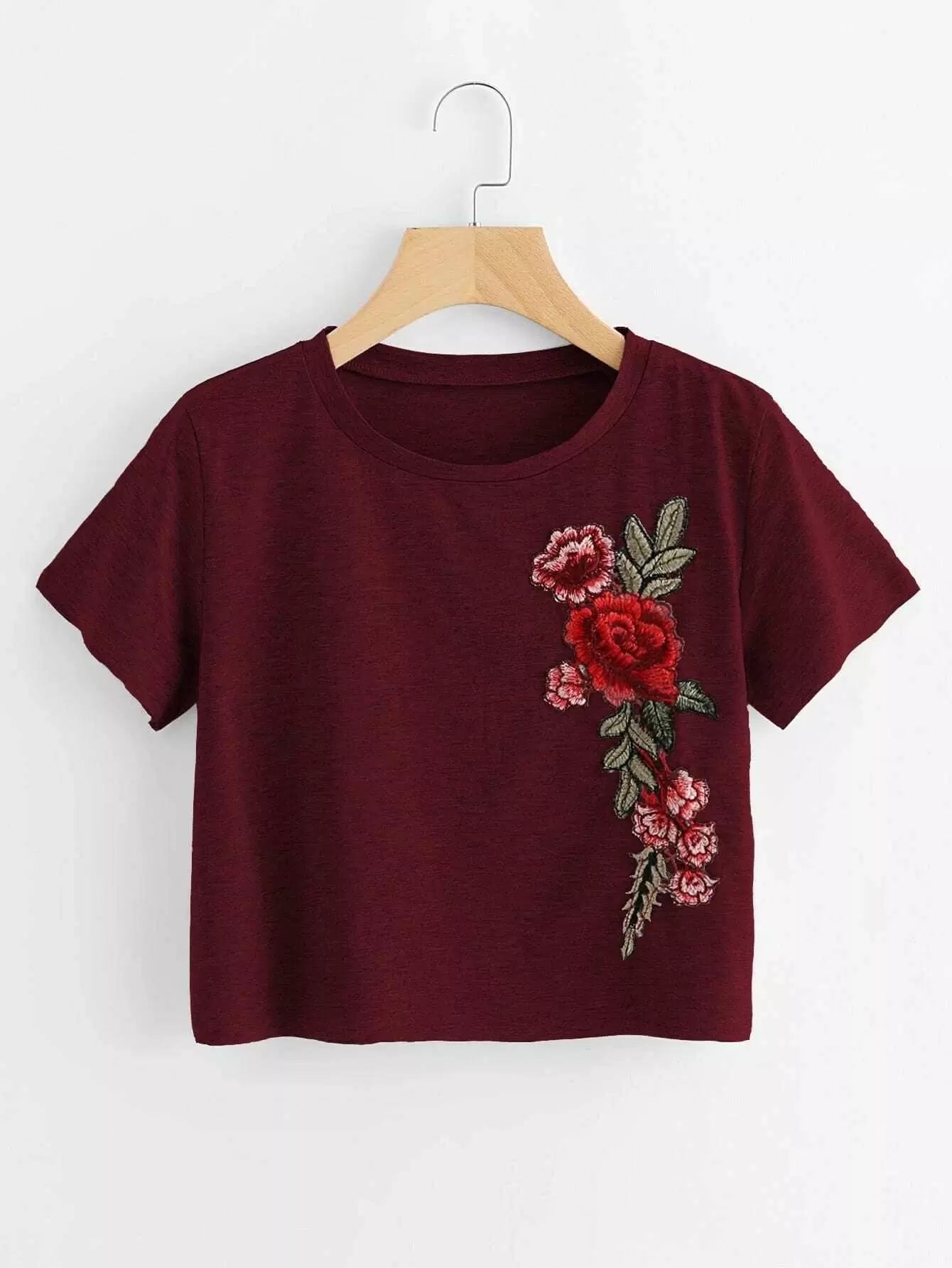 Embroidered Applique Raw Trim Crop Marled T-shirt
