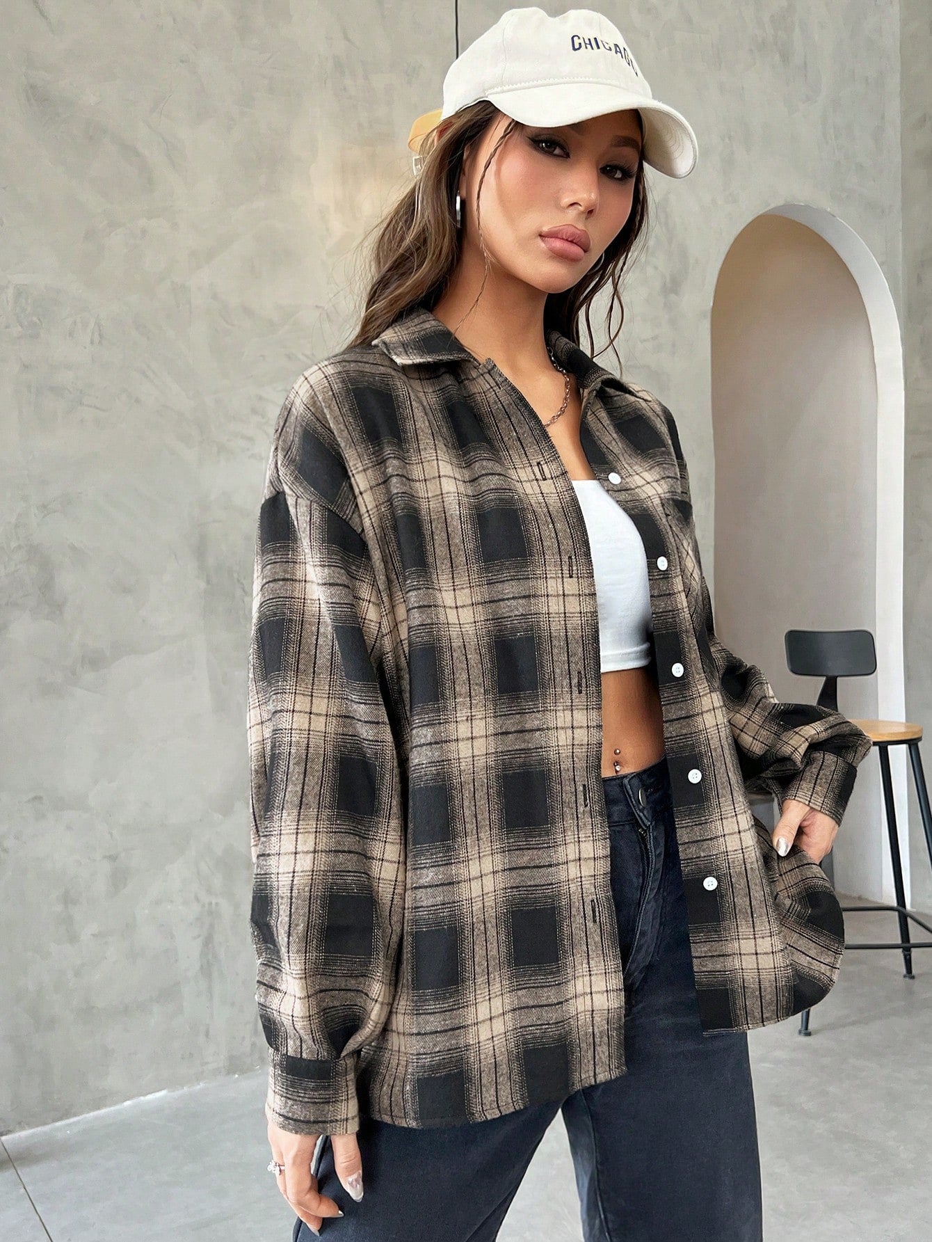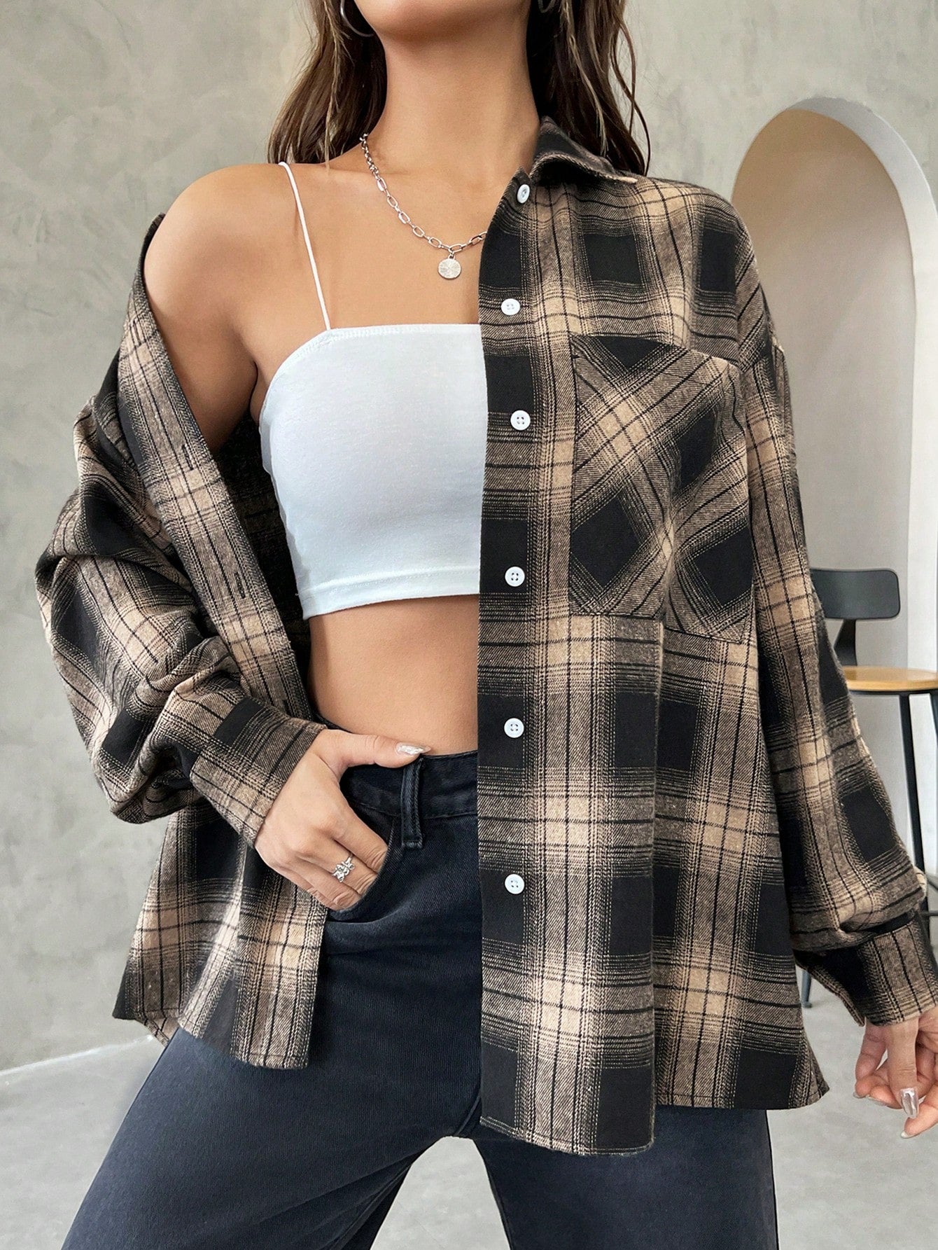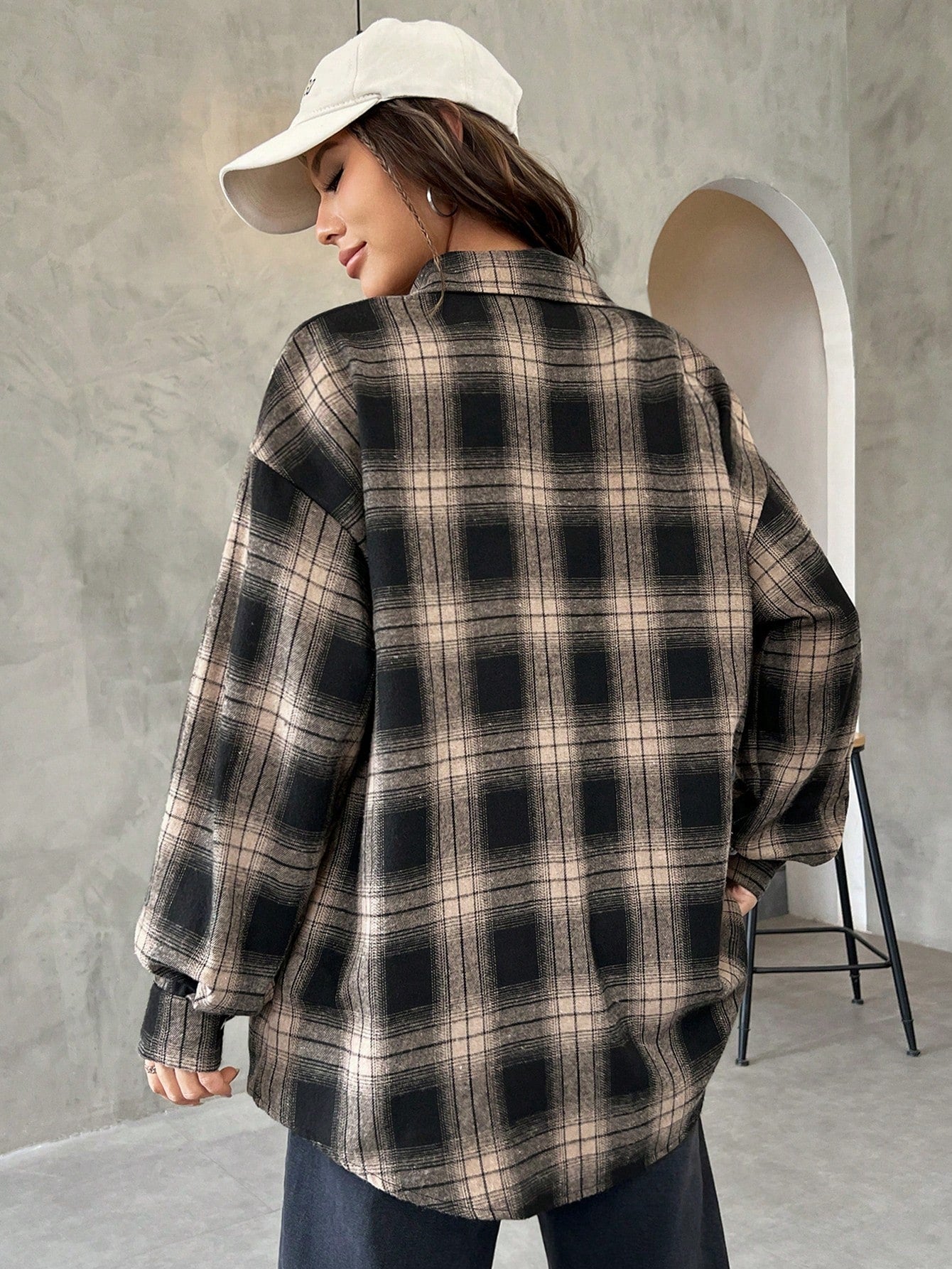 EZwear 1pc Plaid Print Pocket Patched Drop Shoulder Shirt,Long Sleeve Tops