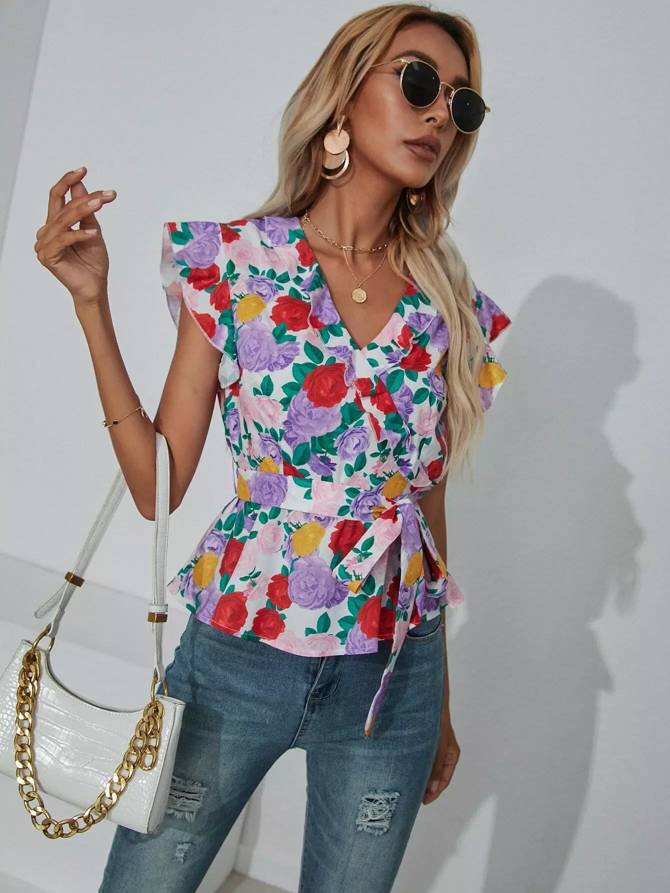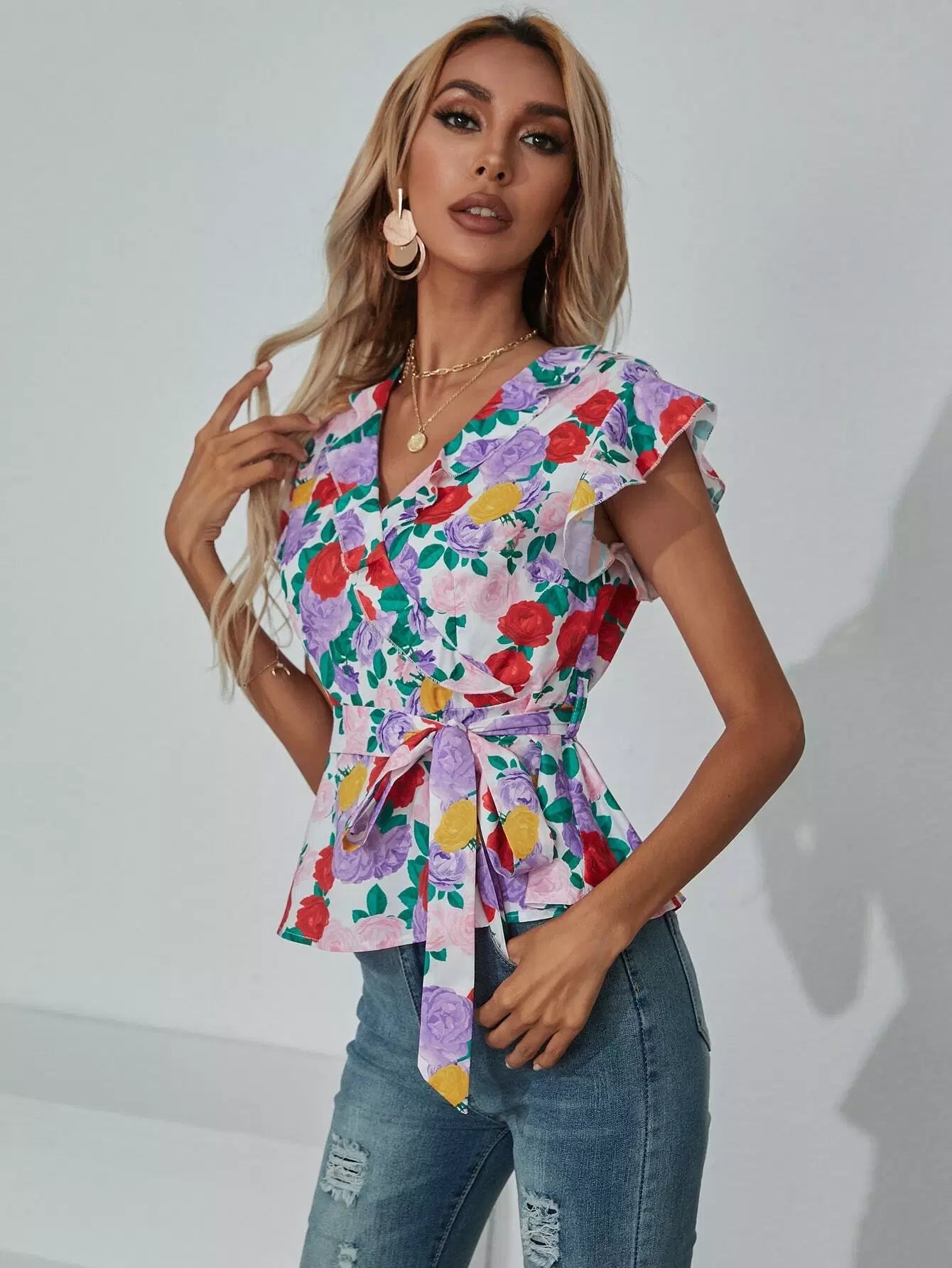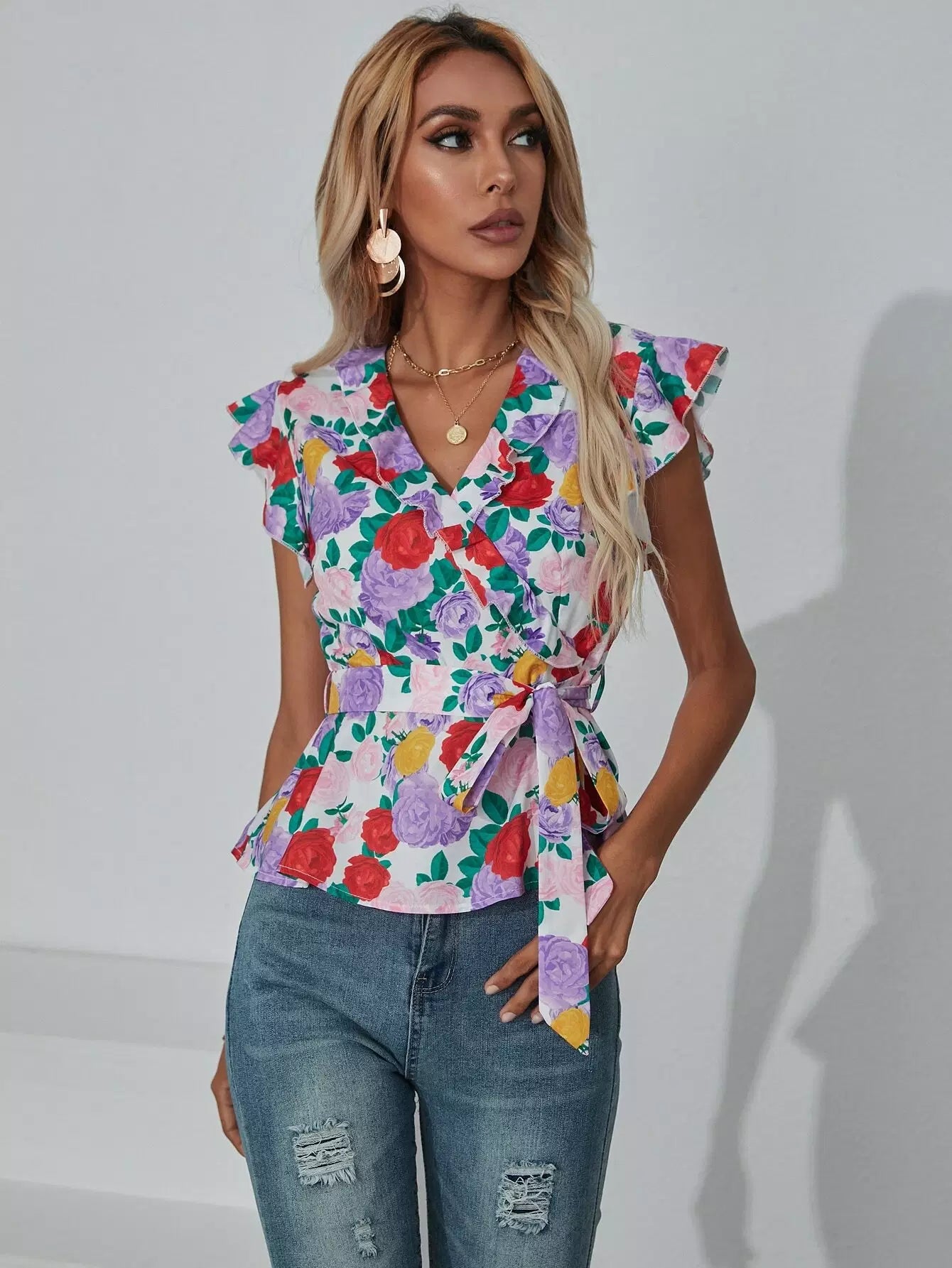 Floral Print Ruffle Trim Wrap Blouse Without Belt