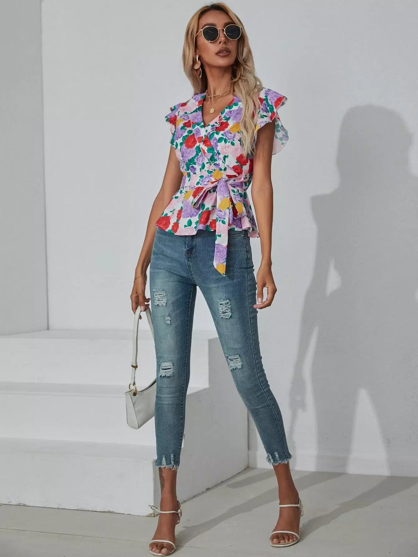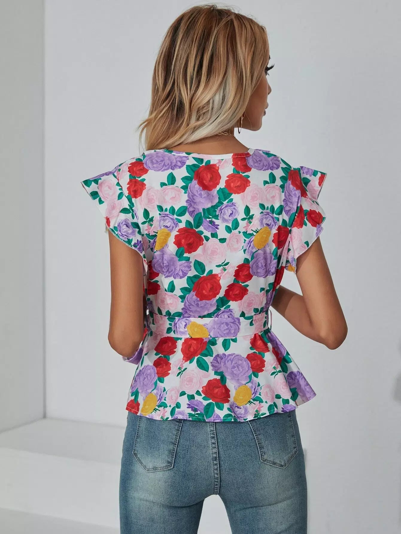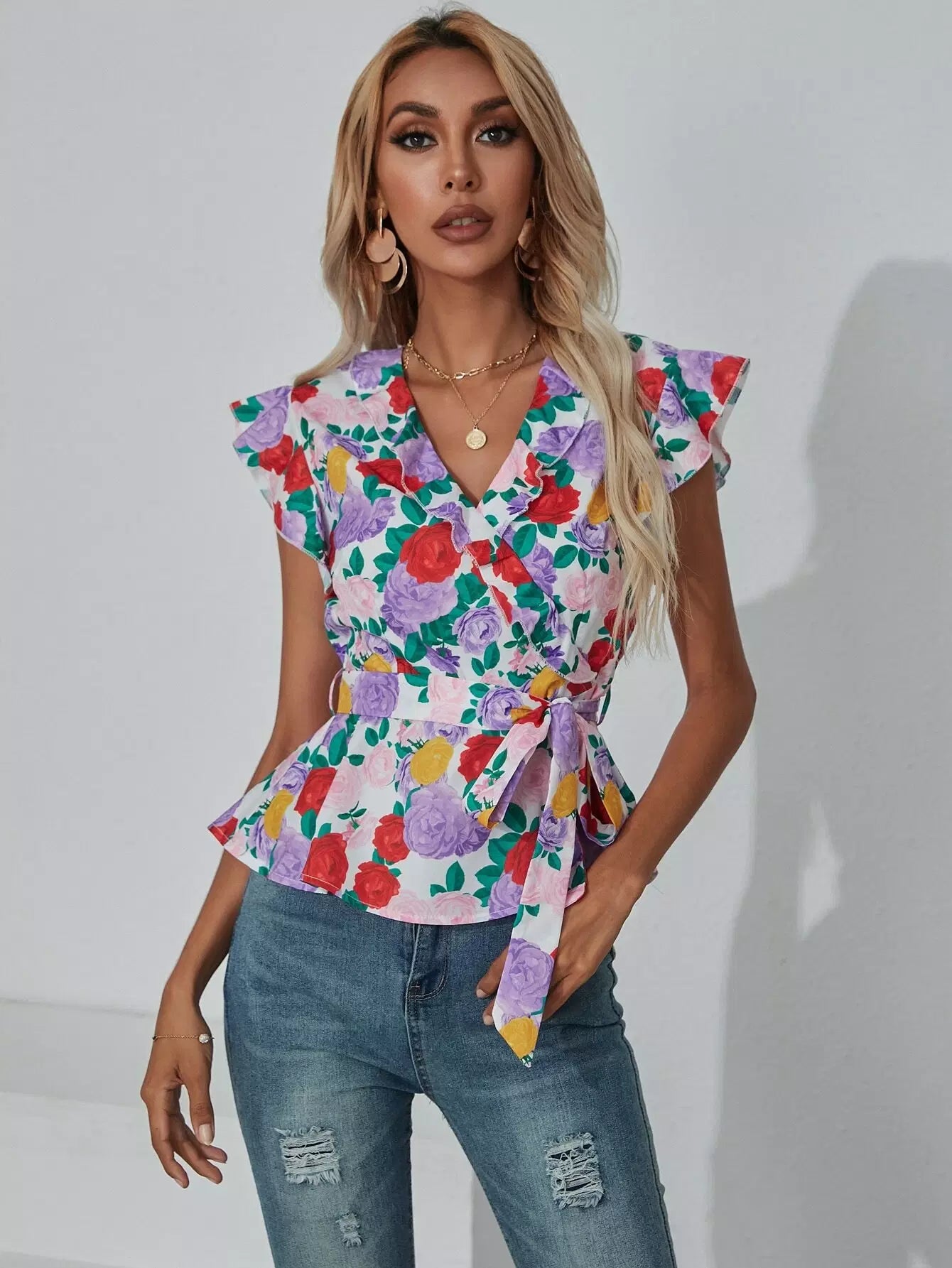 Floral Print Ruffle Trim Wrap Blouse Without Belt
