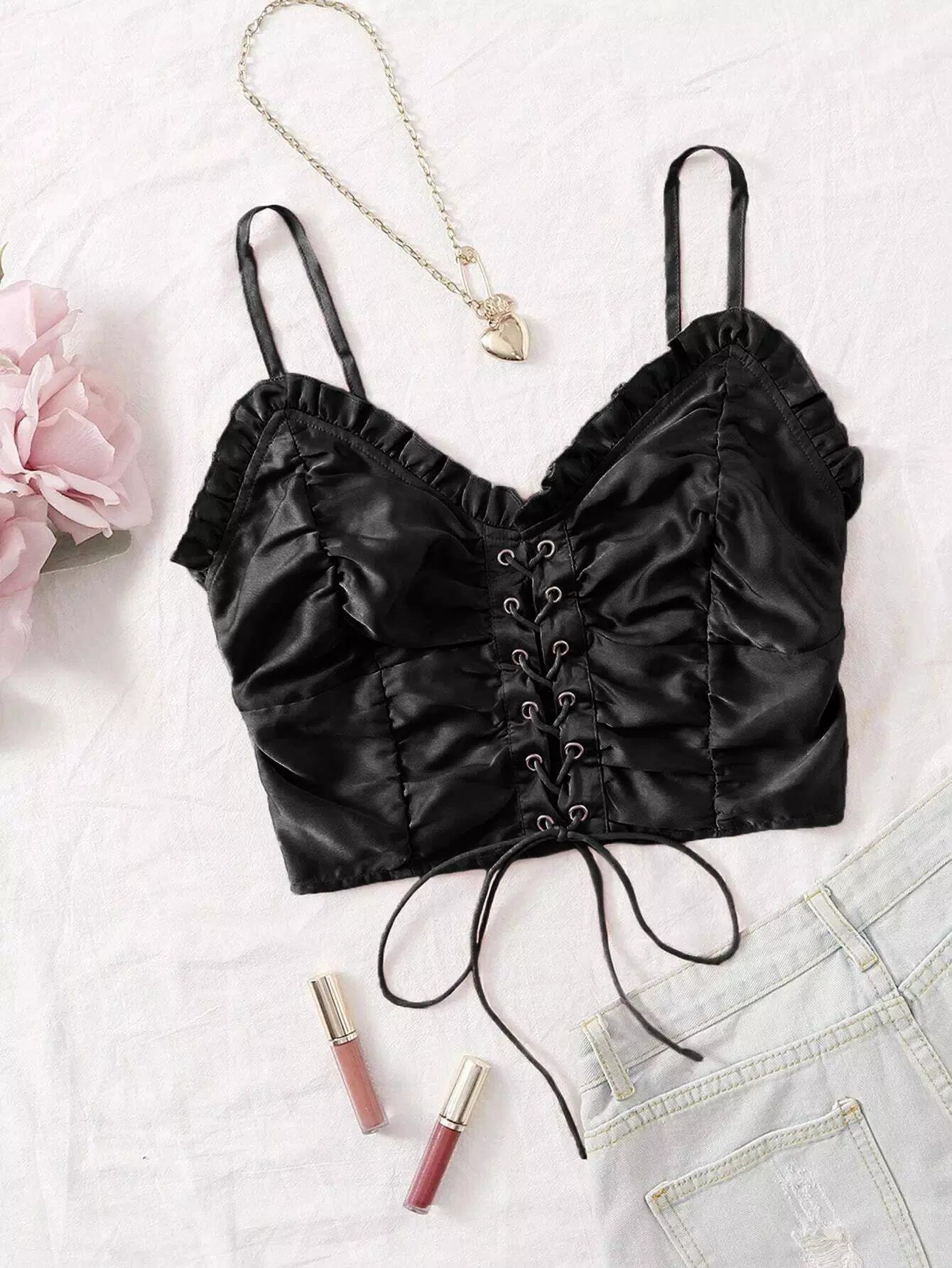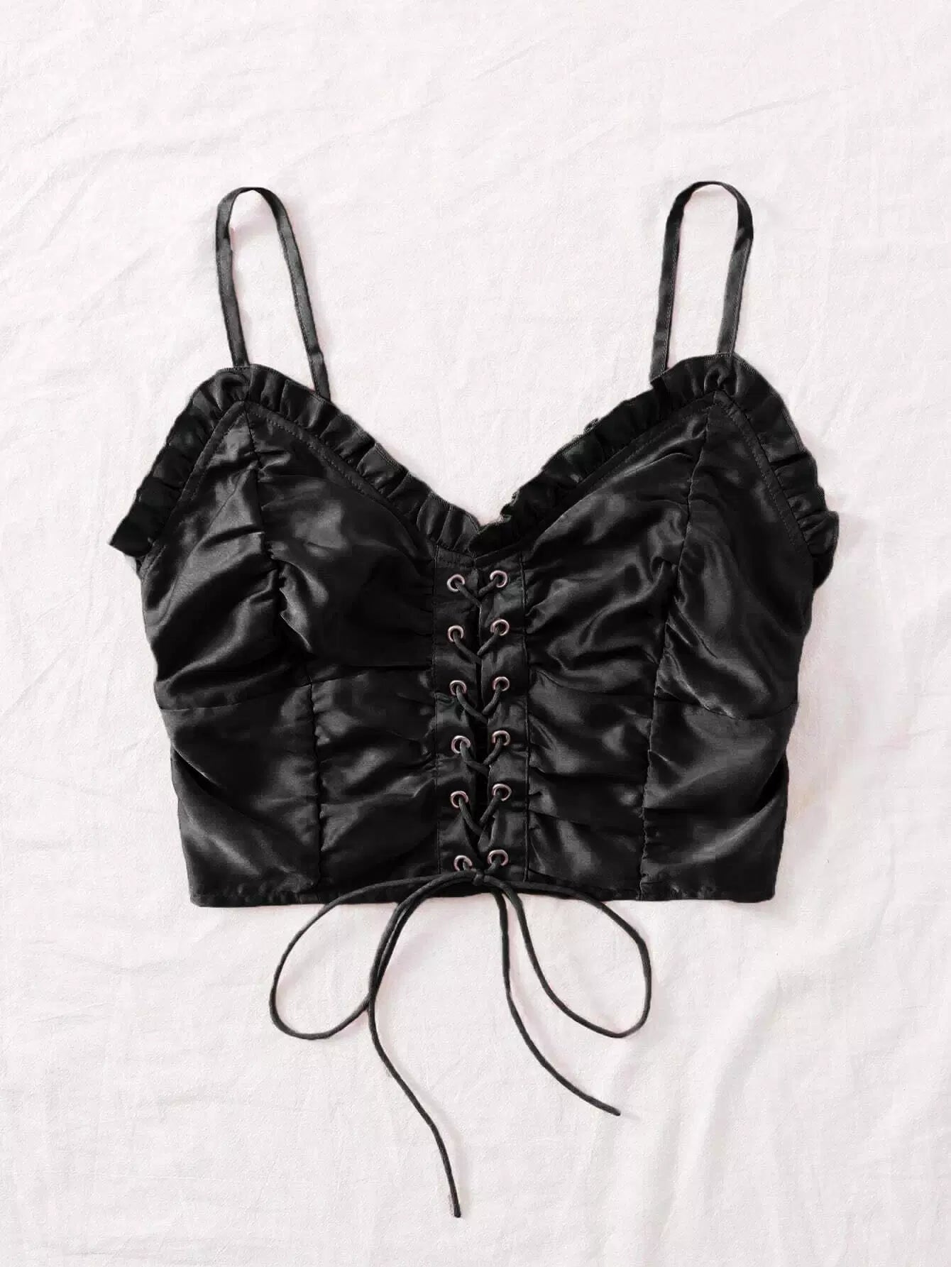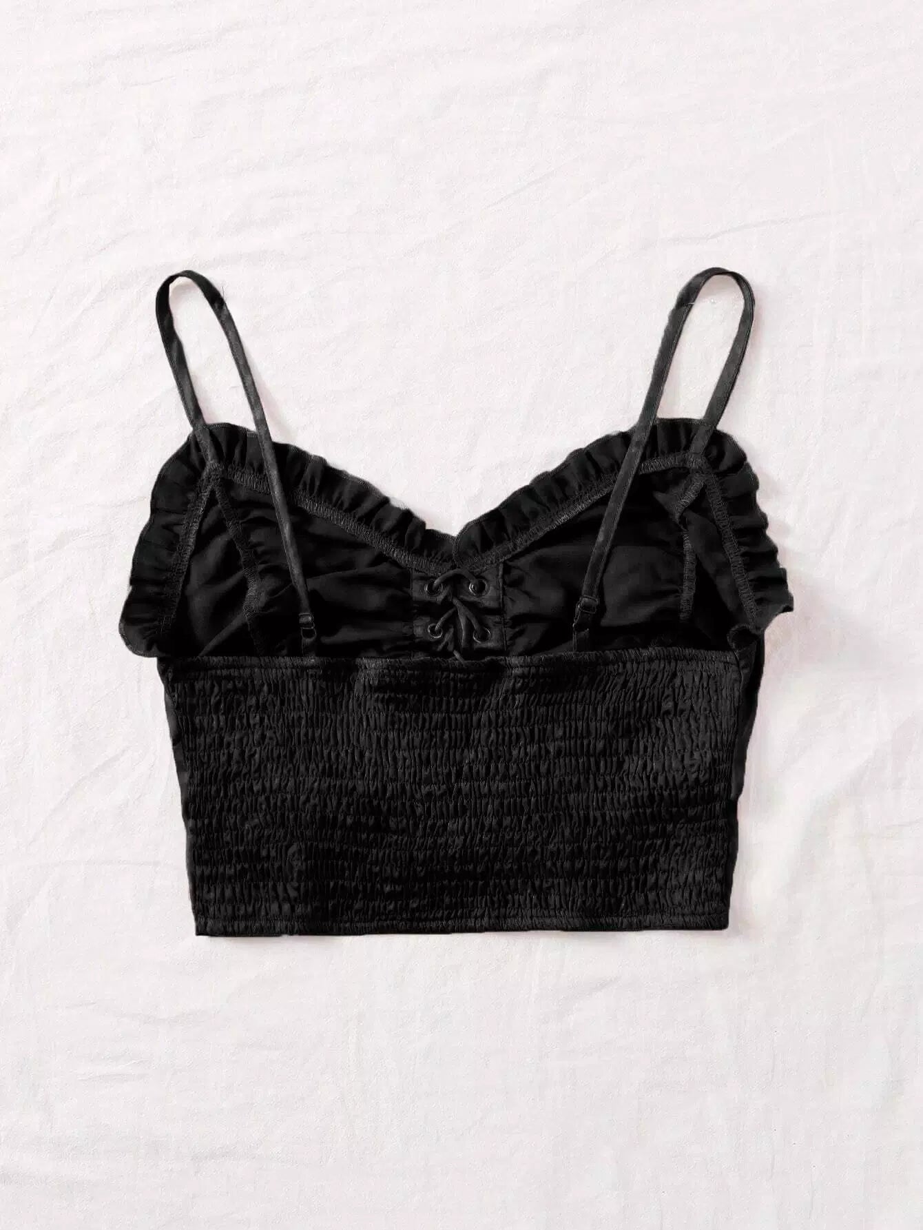 Frill Trim Shirred Back Garment Eyelet Cami Top