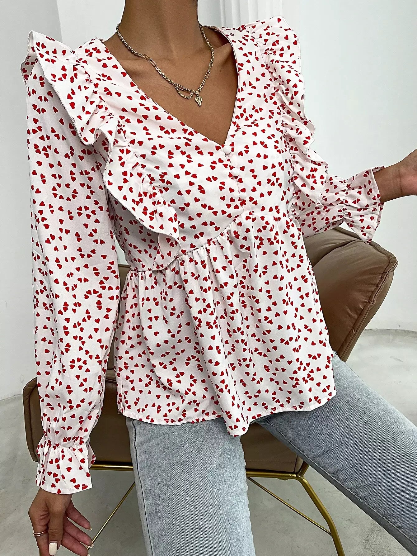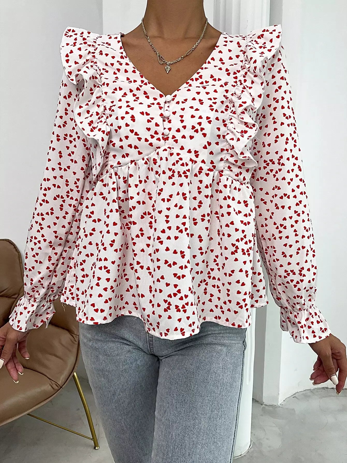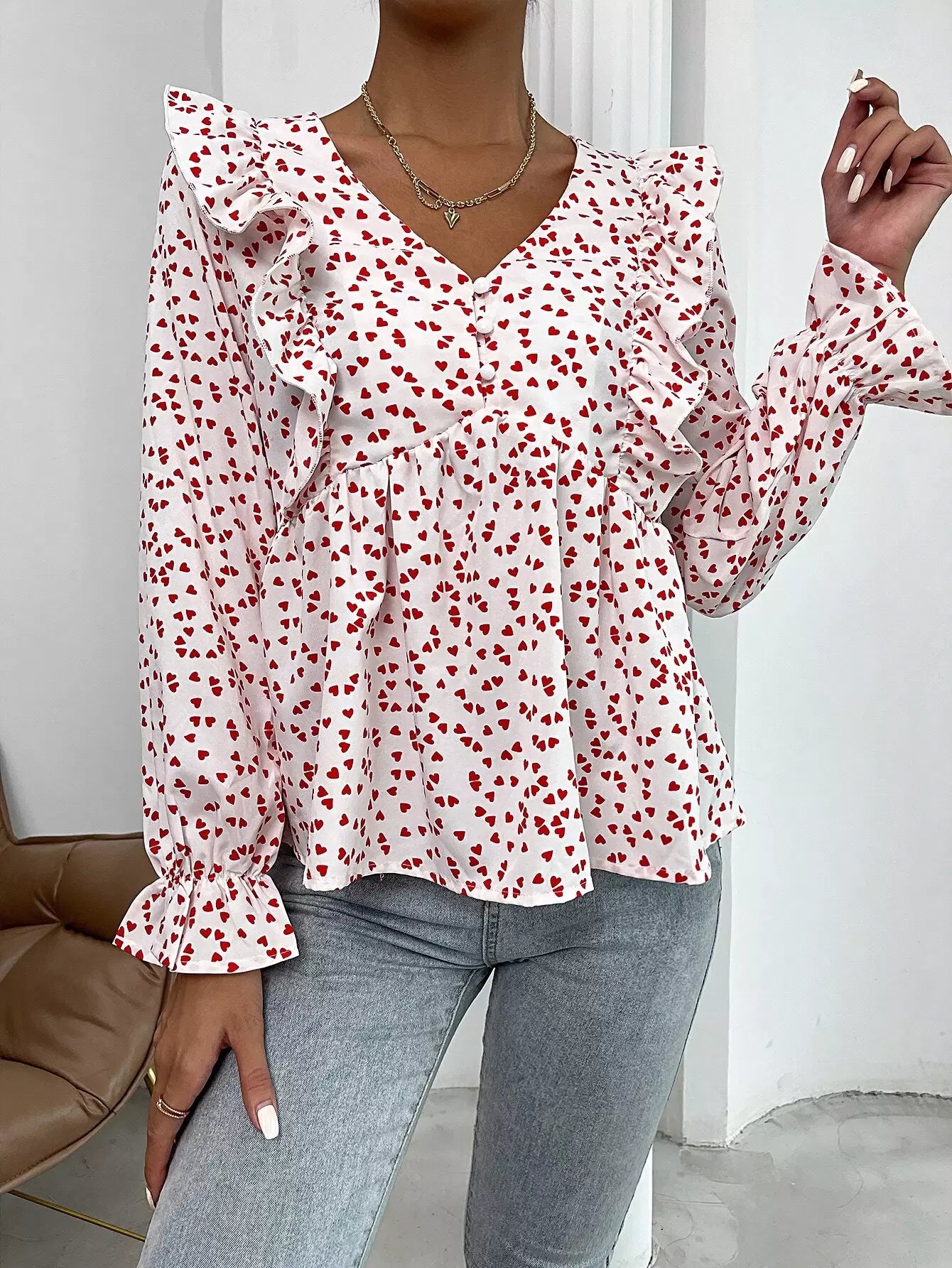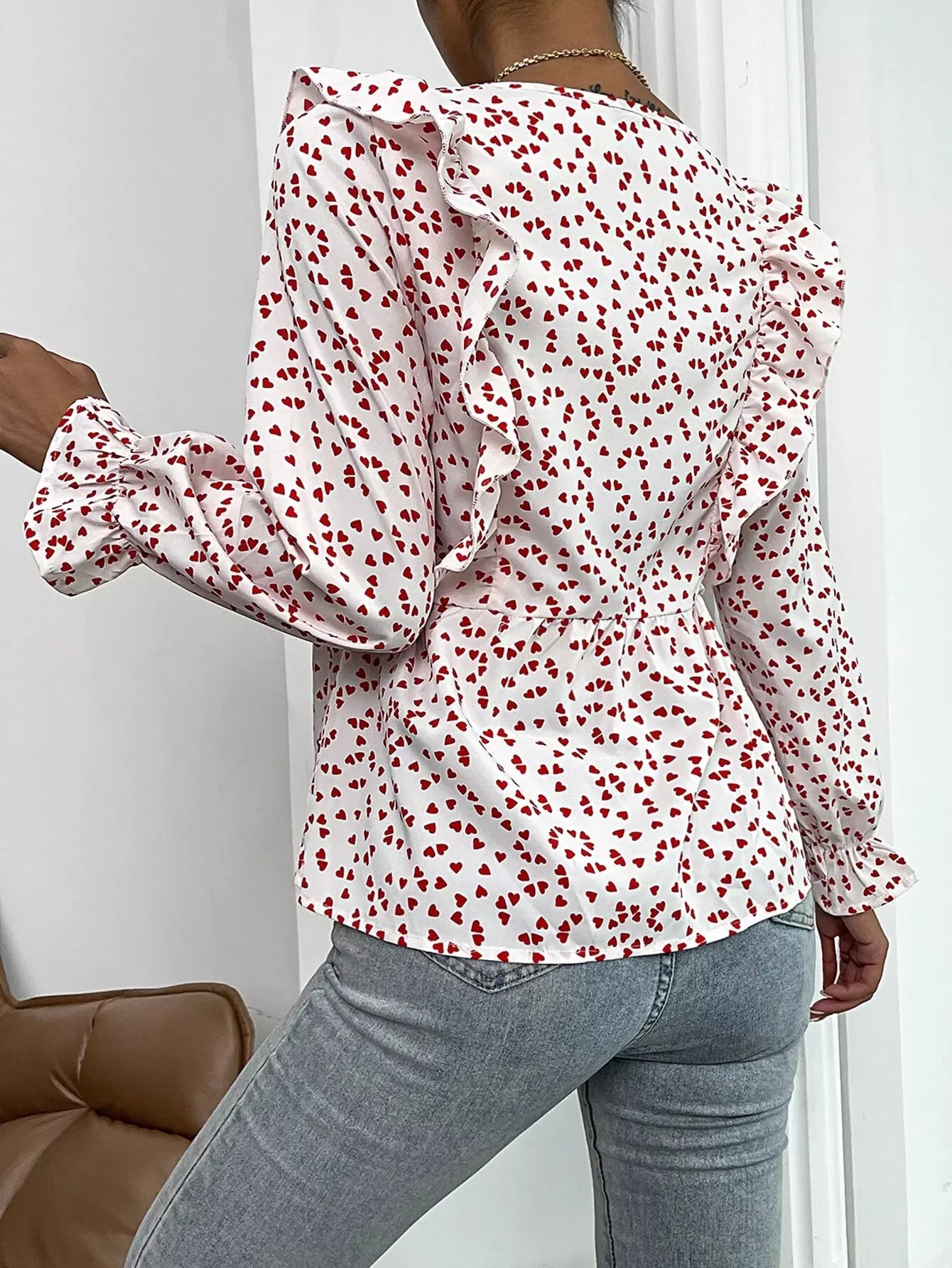 Heart Print Ruffle Detail Peplum Top