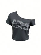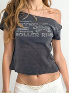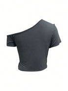 INAWLY Women's Deep Grey Asymmetric Off Shoulder Short Sleeve Simple Casual T-Shirt