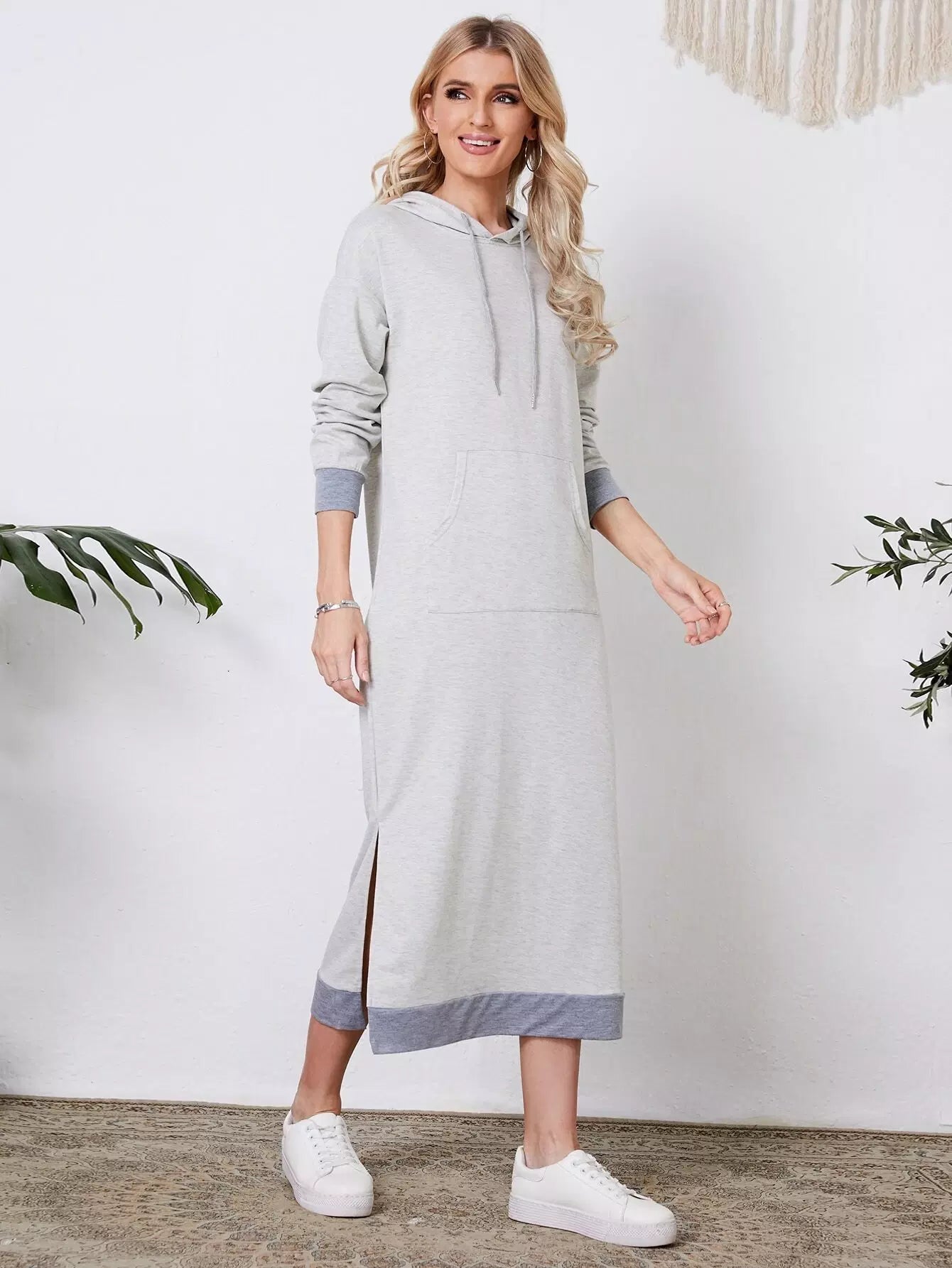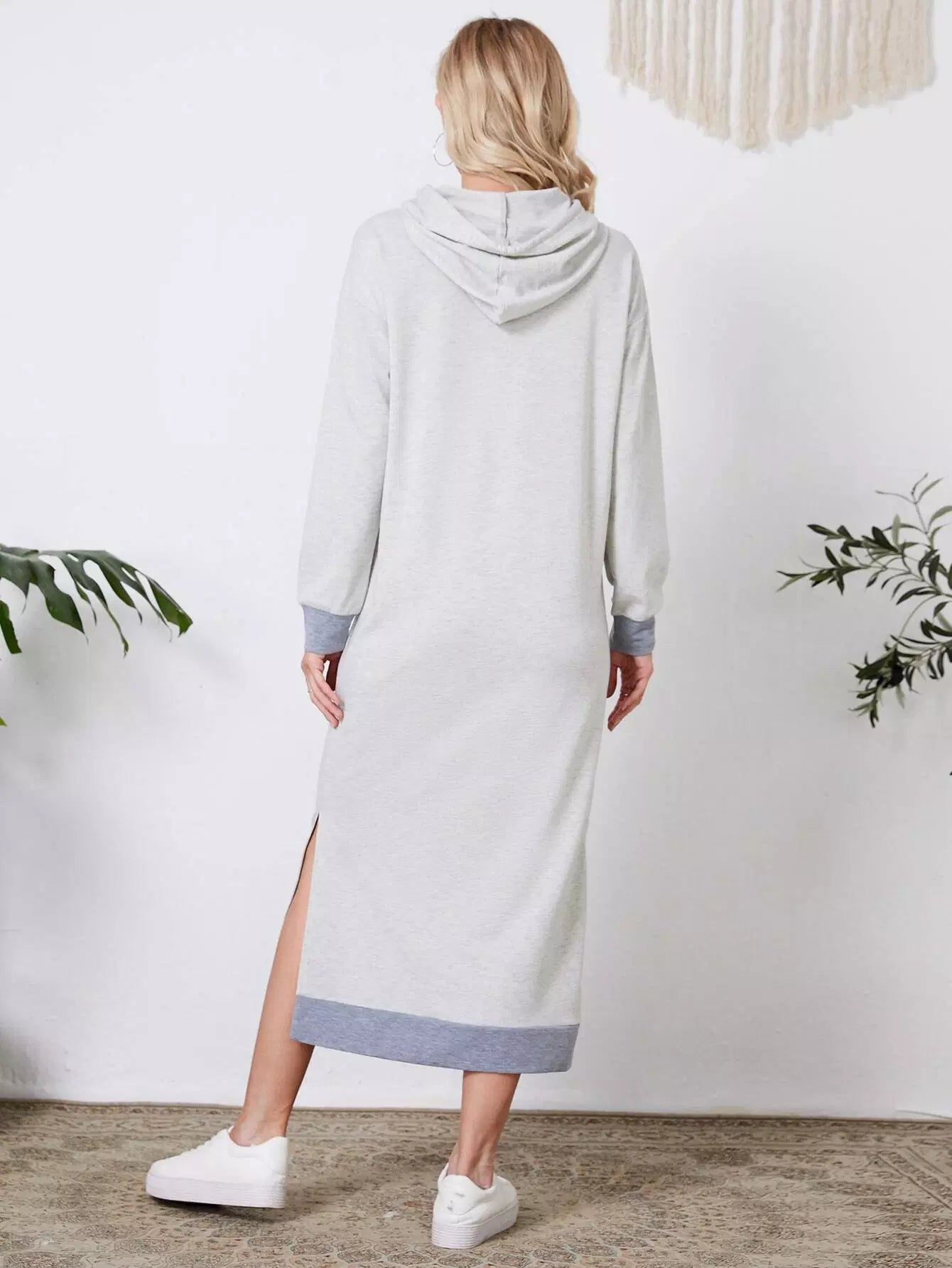 Kangaroo Pocket Drop Shoulder Slit Hem Drawstring Hoodie Dress