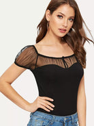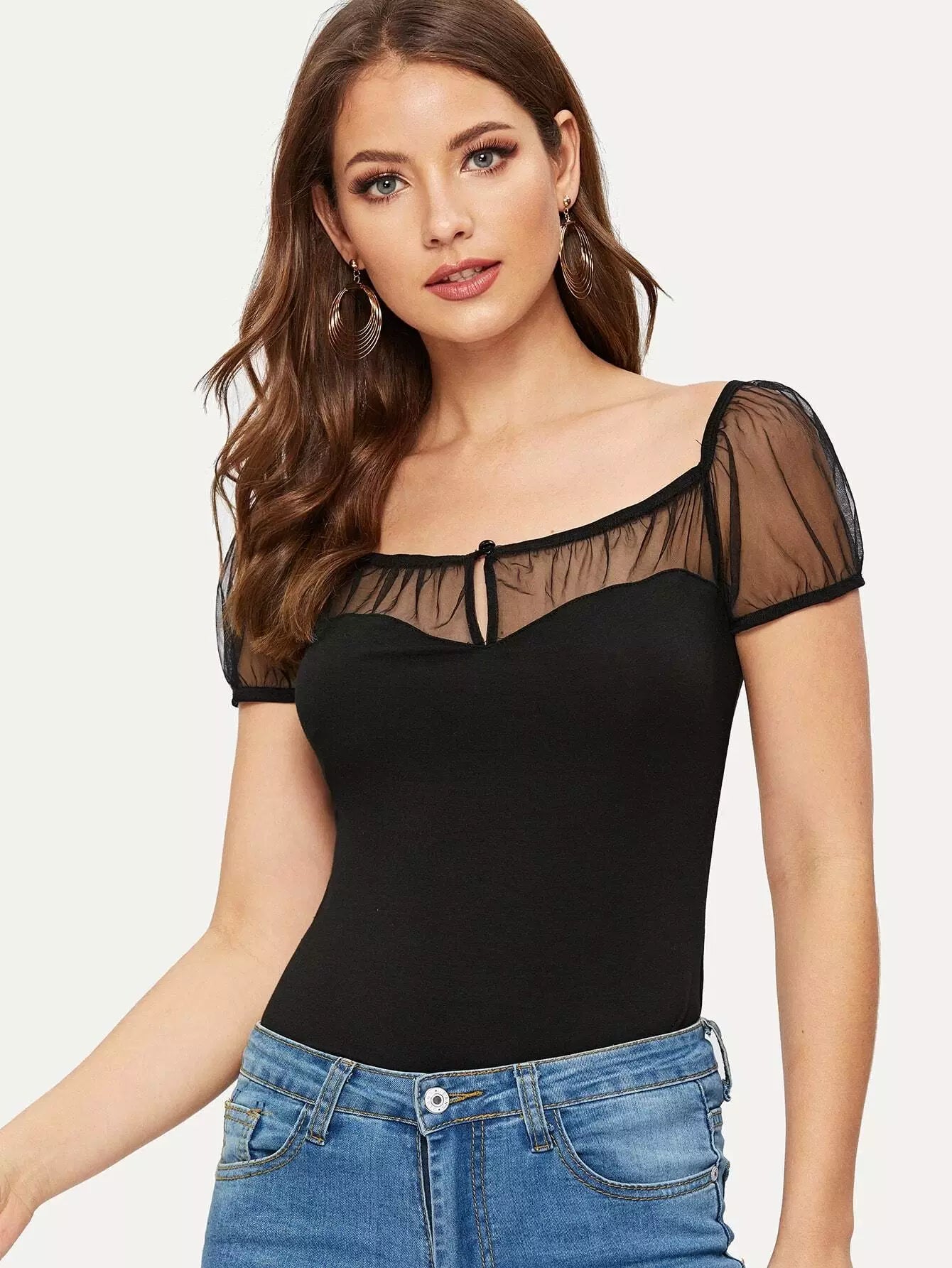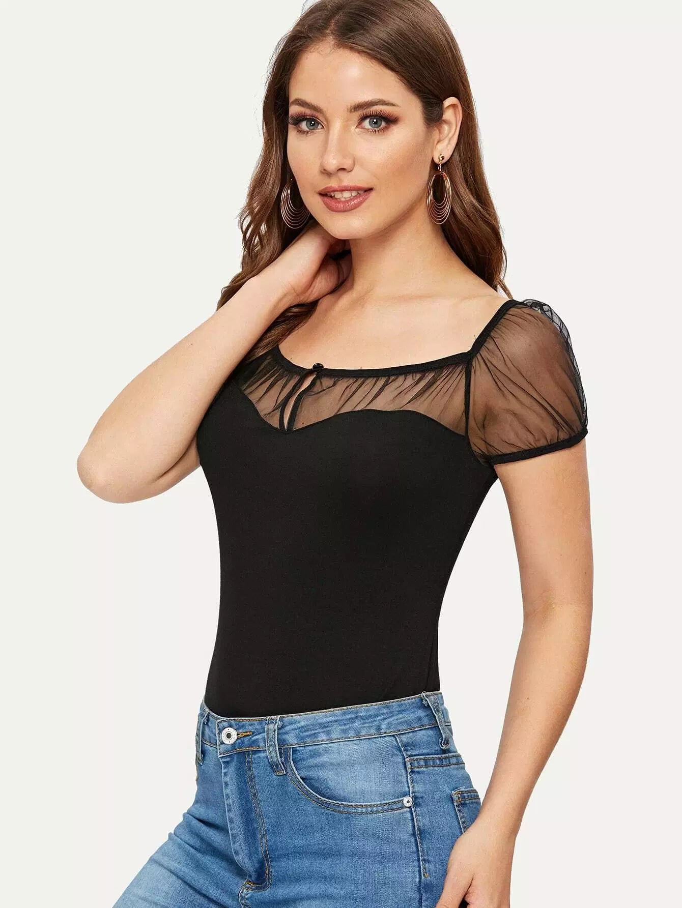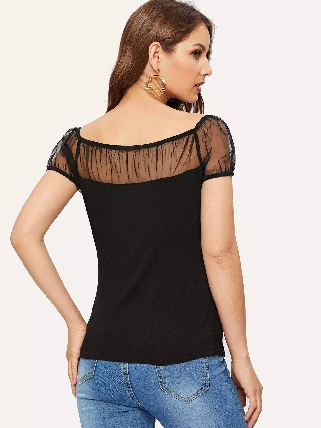 Keyhole Front Sheer Mesh Yoke Fitted Tee